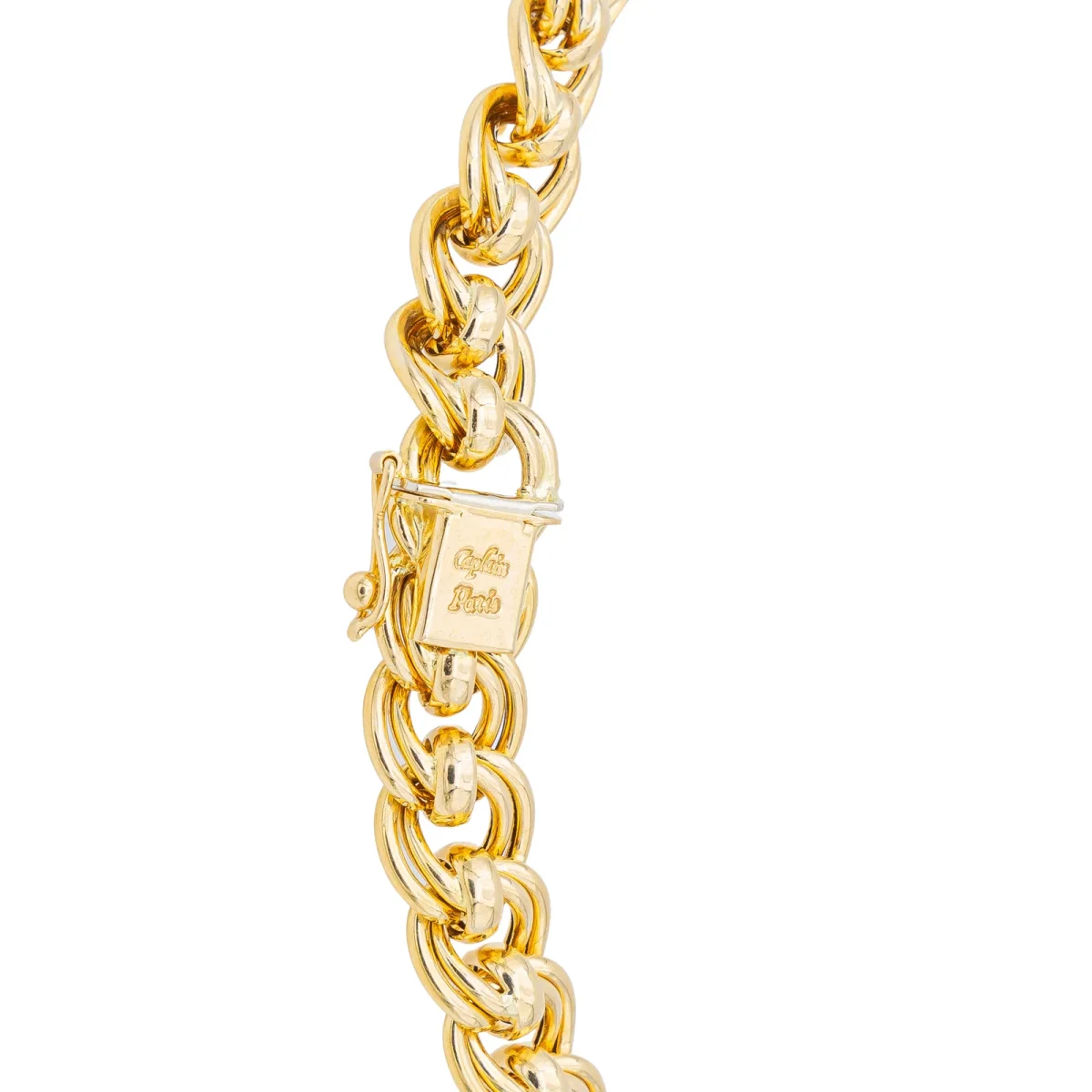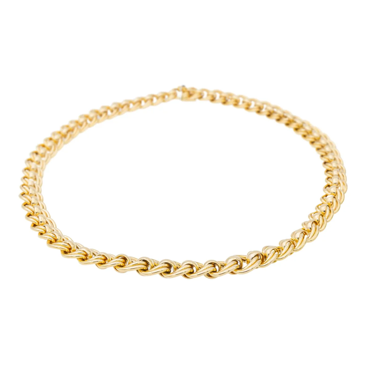 Collier en or jaune 750 millièmes (18 carats), signé de le Maison Caplain Saint- André, maille souple en chute, longueur: 45,0 cm, largeur sur le devant: 1,35 cm, largeur dans le dos: 0,96 cm, fermoir serti d’un cabochon de saphir, poids total: 51,03 g, poinçon tête d’aigle, excellent état