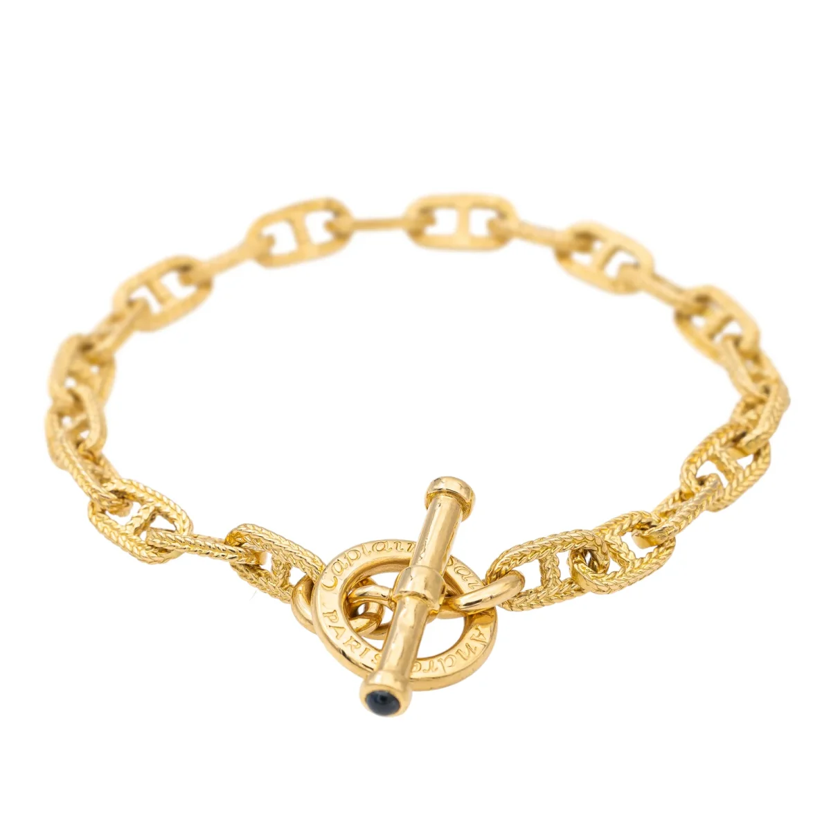 Bracelet signé de la Maison Caplain Saint André, en or jaune 750 millièmes (18 carats), maille marine, serti de 2 saphirs taille cabochon, chacun d’un poids d’environ 0,32 ct, poids total des saphirs: environ 0,32 ct, longueur: 19 cm, largeur de la maille: 0,54 cm, poids total: 19,23 g, fermoir T, poinçon tête d’aigle, excellent état