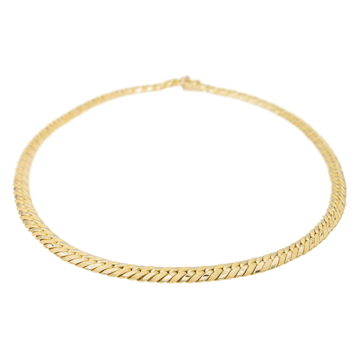 Chaîne signée Caplain St-André en or jaune 750 millièmes (18 carats), maille anglaise, longueur: 43 cm, largeur: 0,80 cm, fermoir serti d’un saphir d’environ 0,01 ct, poids total: 26,13 g, Poinçon tête d’aigle, excellent état