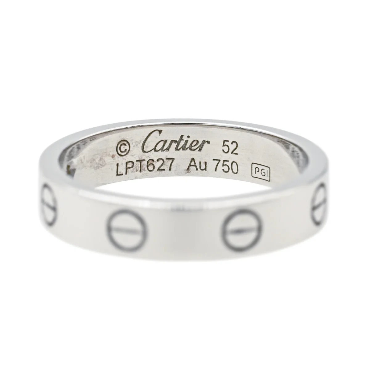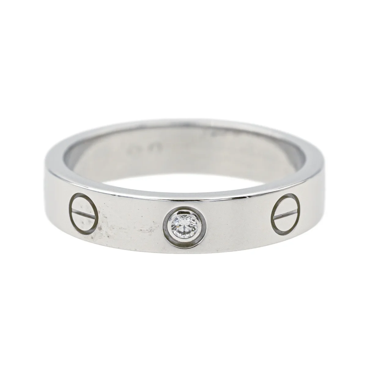 Alliance signée de la Maison Cartier en or blanc 750 millièmes (18 carats), Petit modèle Love, sertie d’un diamants taille brillant environ F-VS, poids total diamants : environ 0,02 ct, largeur sur le dessus : 0,40 cm, tour de doigt : 52, poids total : 4,83 g, poinçon Saint Bernard, vendu avec écrin et certificat d’origine, numérotée : LPT627, excellent état