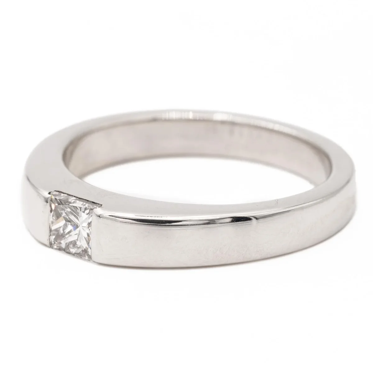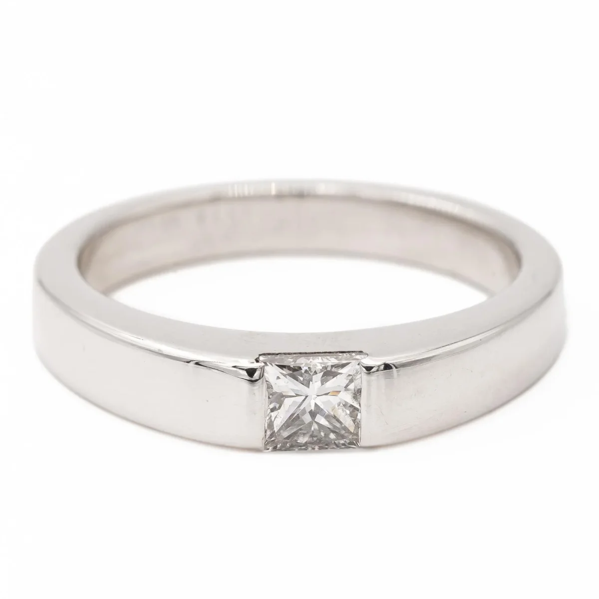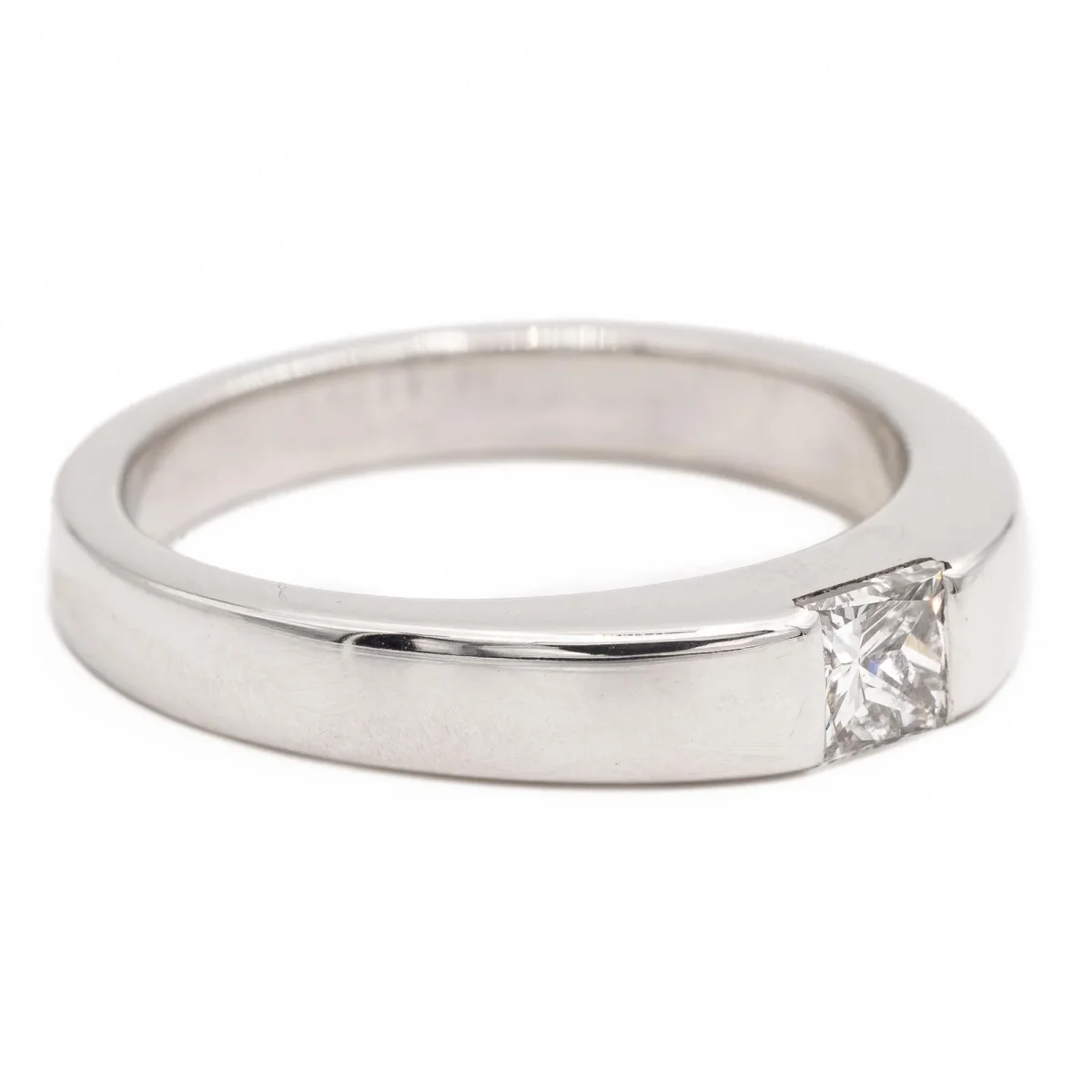 Bague signée de la Maison Cartier, collection Tank, en or blanc 750 millièmes (18 carats), sertie d’un diamant taille princesse environ I/VS, d’un poids total d’environ 0,1 ct, largeur sur le dessus: 0,35 cm, tour de doigt: 49, poids total: 5,13 g, poinçon tête d’aigle, numérotée 86NK, excellent état