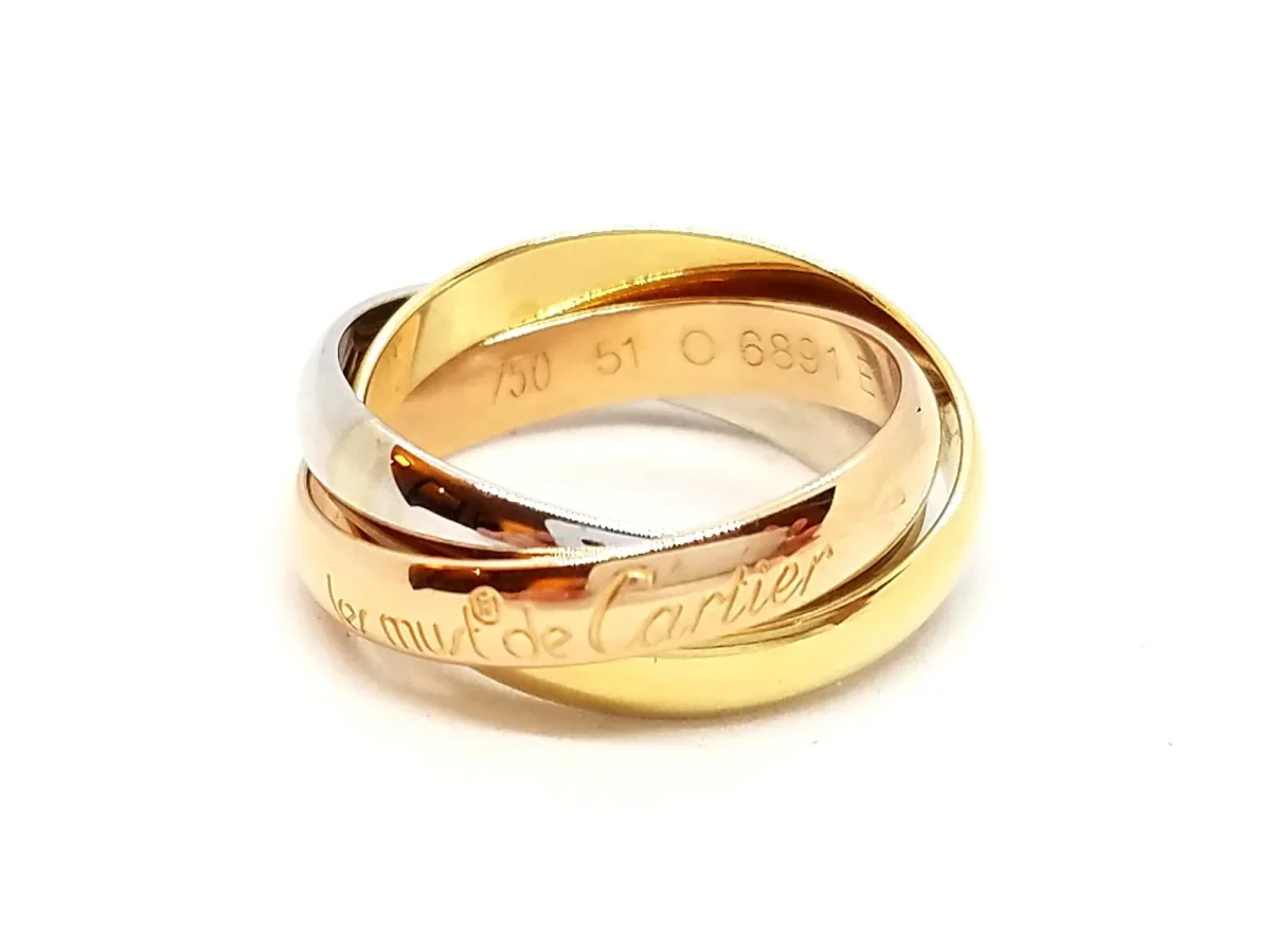 Bague signée de la maison cartier en or 750 millièmes (18 carats), or blanc, or jaune et or rose, modèle Trinity classique, signature « le must de Cartier » sur l’anneau en or rose, largeur d’un anneau: 0,33 cm, Tour de doigt: 51, Numéroté: 6891E, prix neuf: 1290 €, poinçonné, poids total: 7,44 g, excellent état