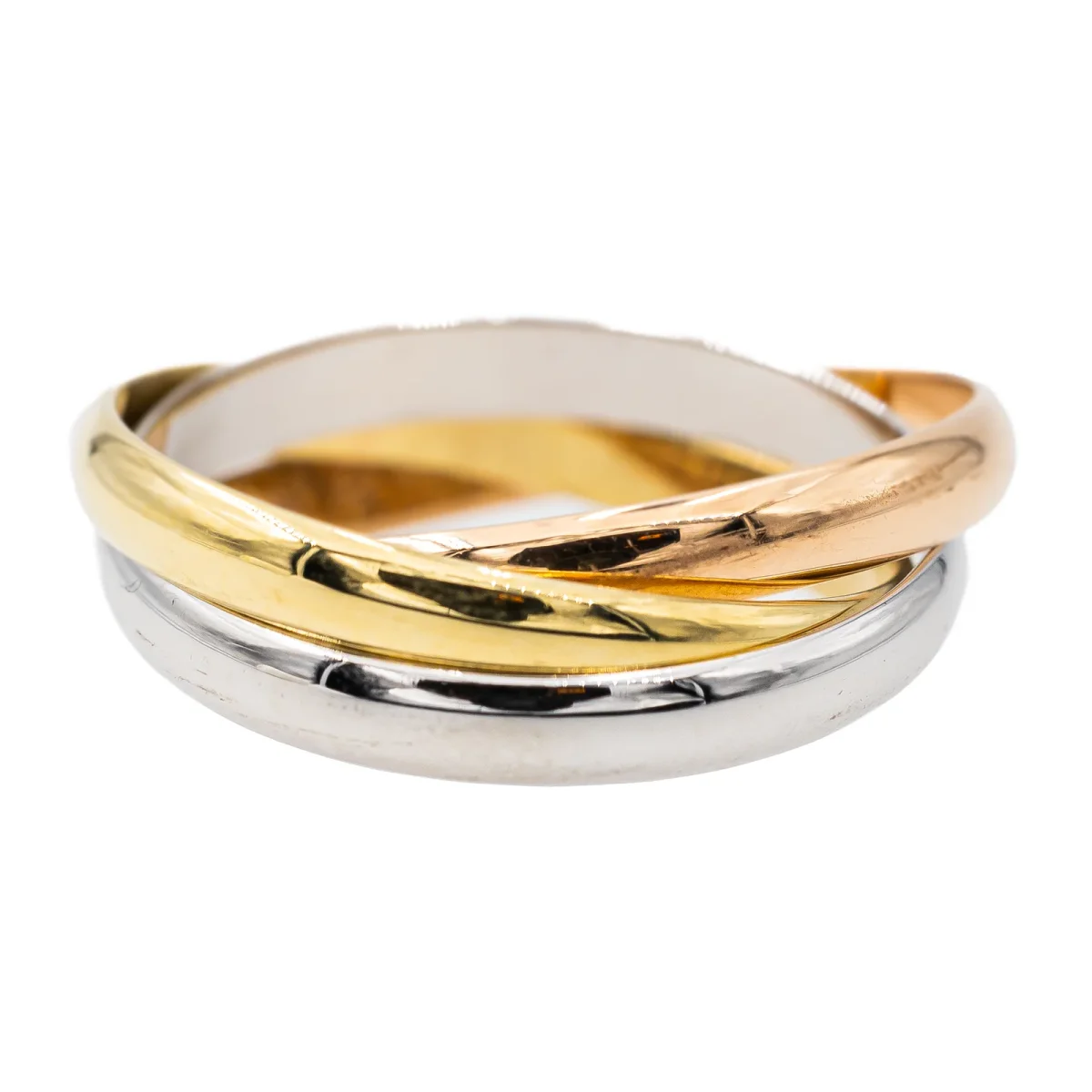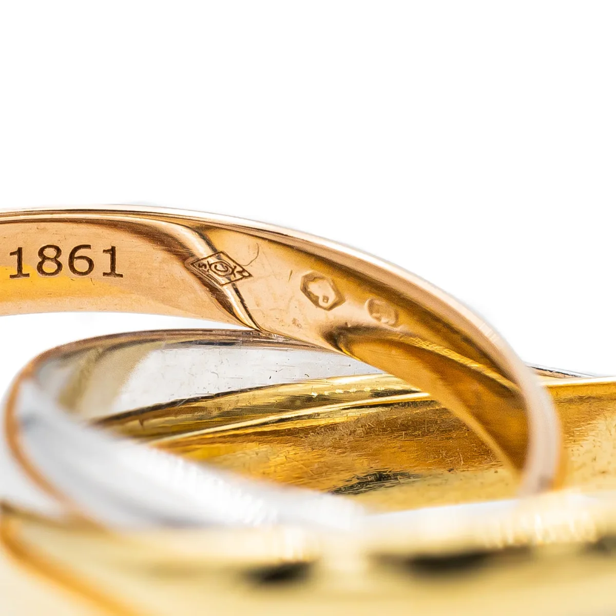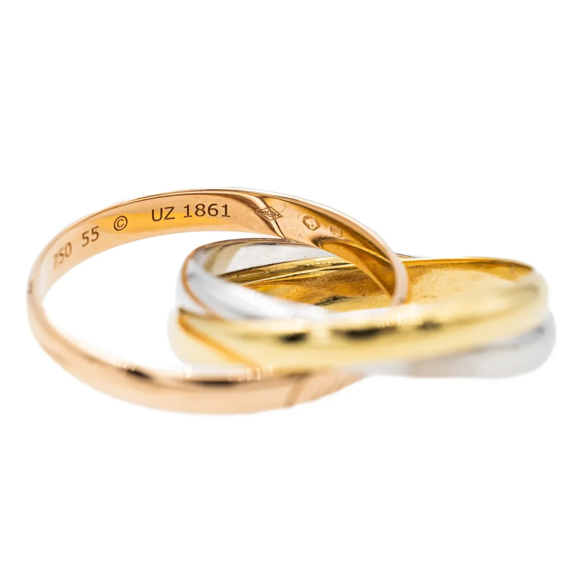 Bague signée la maison Cartier, en or blanc, jaune et rose 750 millièmes (18 carats), collection trinity, largeur d’un anneau : 3,00 mm, numéro de série UZ 1861, largeur sur le dessus: 0,60 cm, tour de doigt: 55, poids total: 5,22 g, poinçon Saint Bernard, excellent état