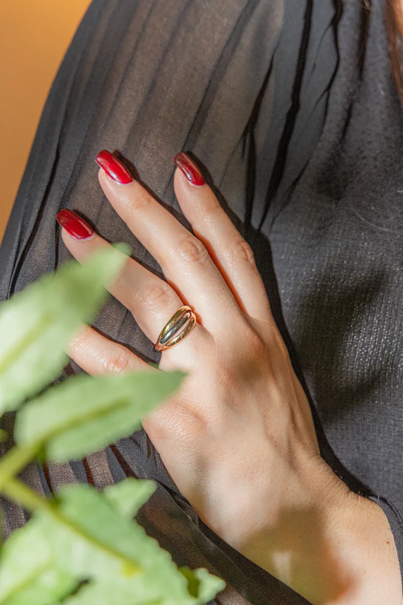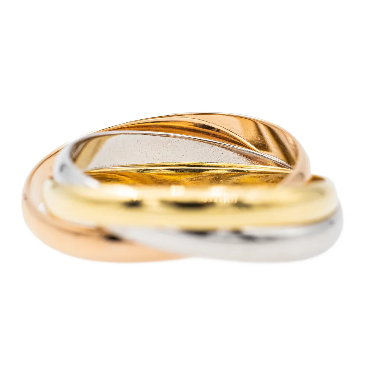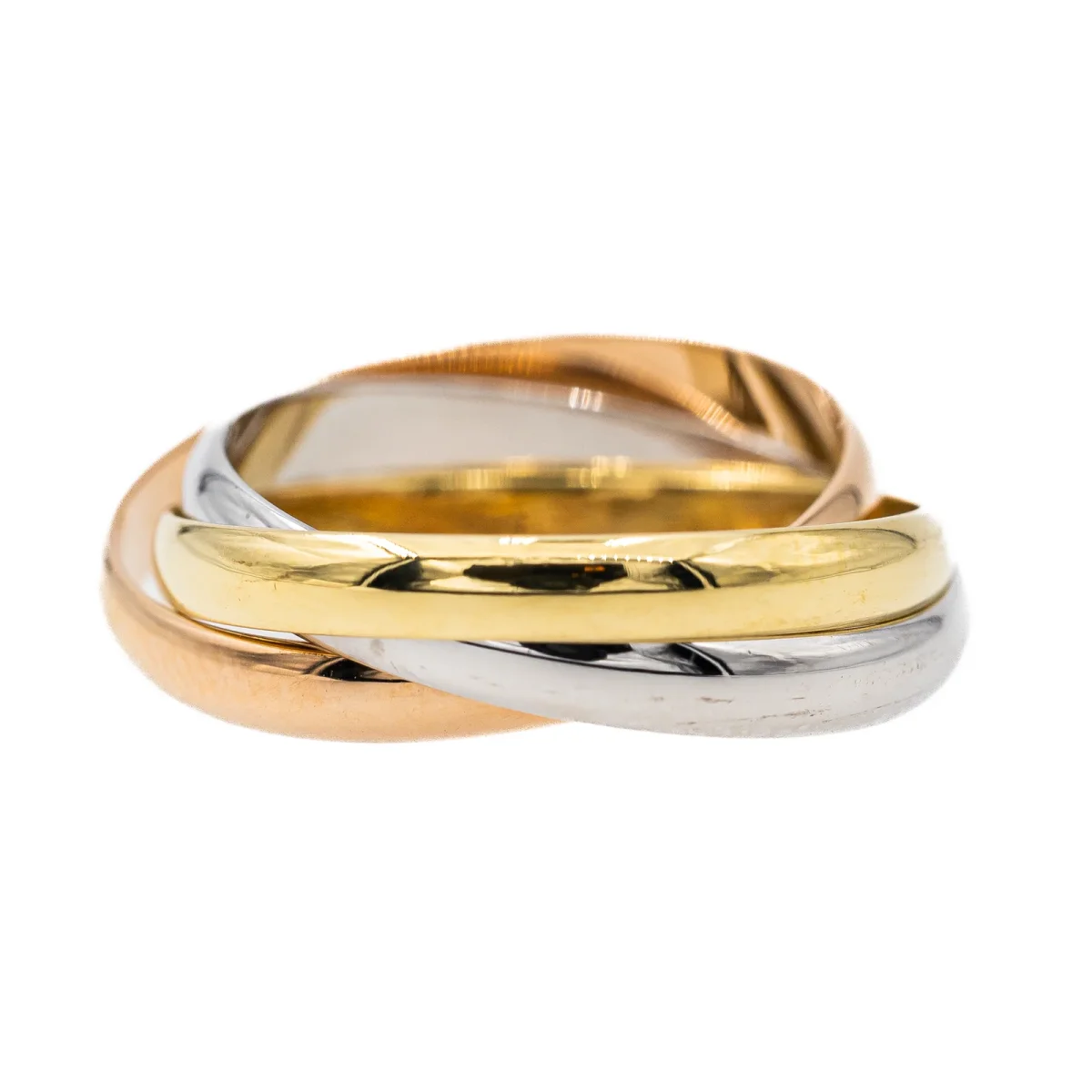 Bague signée la maison Cartier, en or blanc, jaune et rose 750 millièmes (18 carats), collection trinity, largeur d’un anneau : 3,00 mm, numéro de série UZ 1861, largeur sur le dessus: 0,60 cm, tour de doigt: 55, poids total: 5,22 g, poinçon Saint Bernard, excellent état