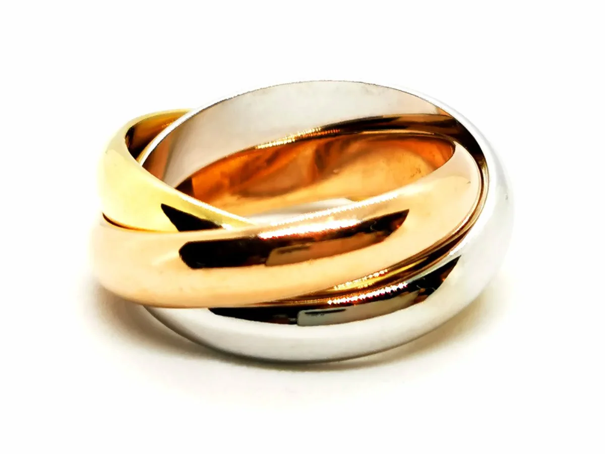 Bague signée de la maison Cartier, en or jaune or blan et rose 750 millièmes (18 carats), modèle Trinity classique, tour de doigt 52, largeur de chaque anneau: 0,37 cm, prix neuf 1440€ , numéroté 51FA587, poinçon tête d’aigle, excellent état