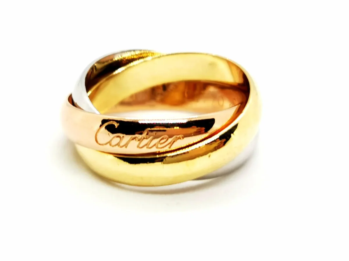Bague signée de la maison Cartier, collection Trinity, en or 750 millièmes (18 carats), or rose, or blanc, et or jaune, Tour de doigt: 47, largeur d’un anneau 0,33 cm, signée et numérotée: CZ1770, poids total: 6,83 g, poinçon saint-bernard, prix neuf: 1330€, excellent état