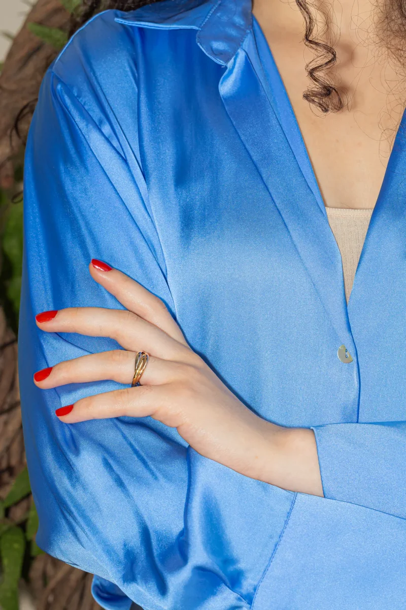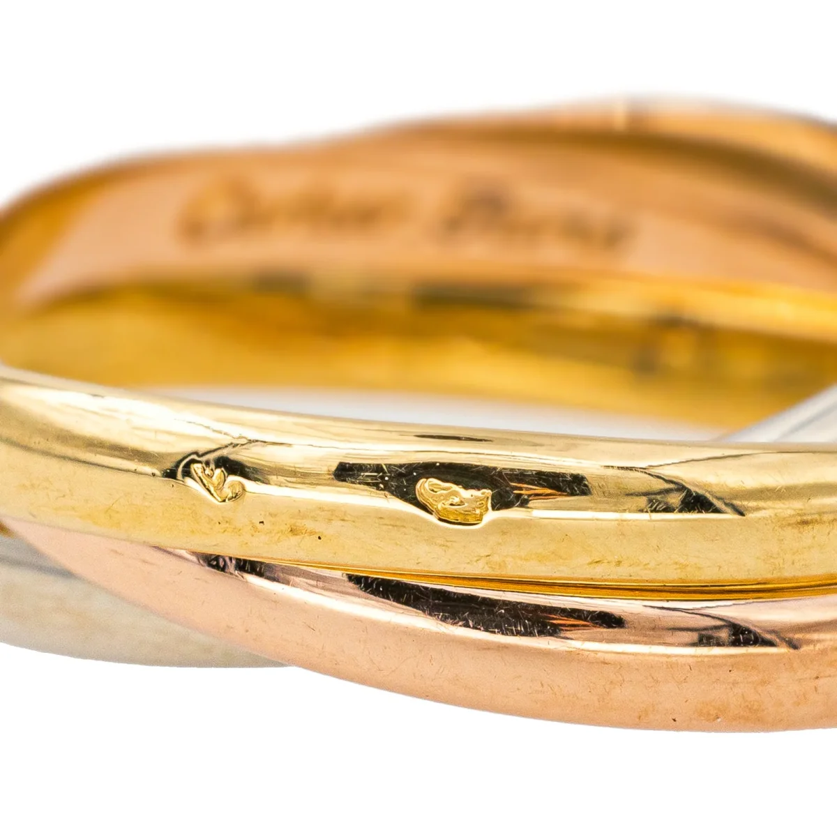 Bague signée de la Maison Cartier en or blanc, jaune et rose 750 millièmes (18 carats), modèle Trinity, largeur sur le dessus : 0,24 cm, tour de doigt : 56, poids total : 4,74 g, poinçon tête d’aigle, vendue avec écrin d’origine, excellent état