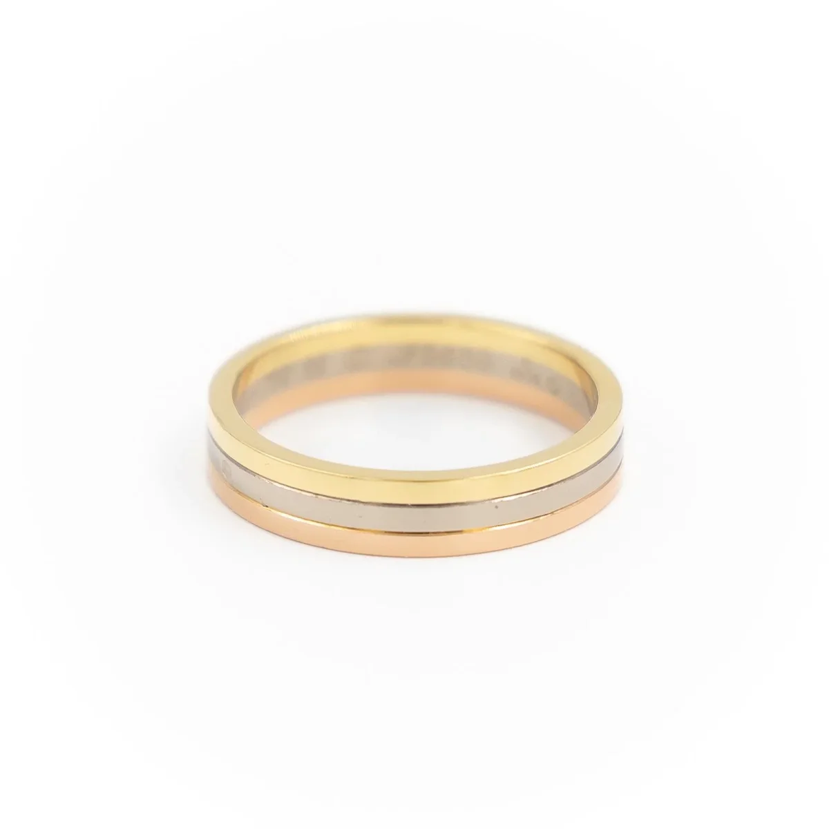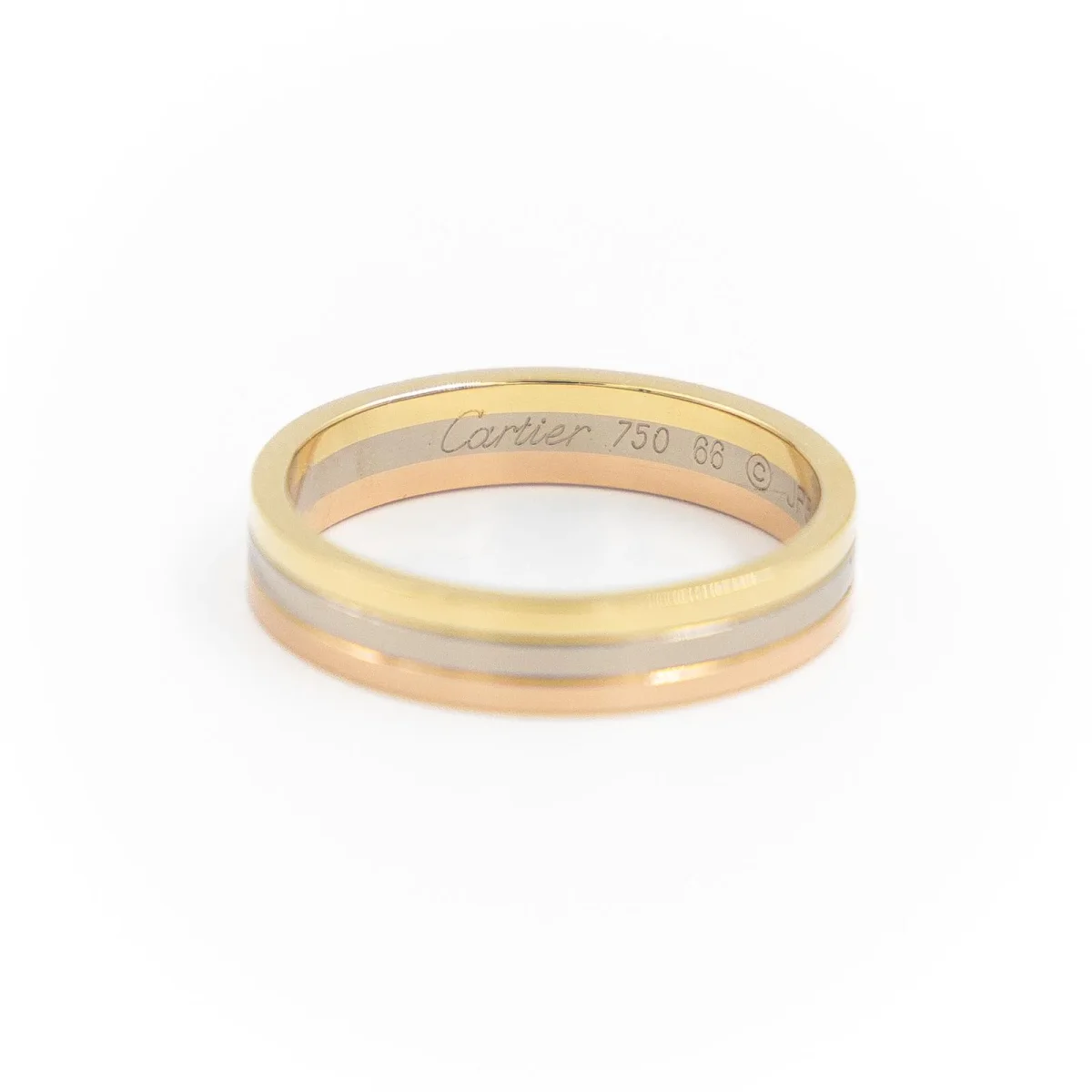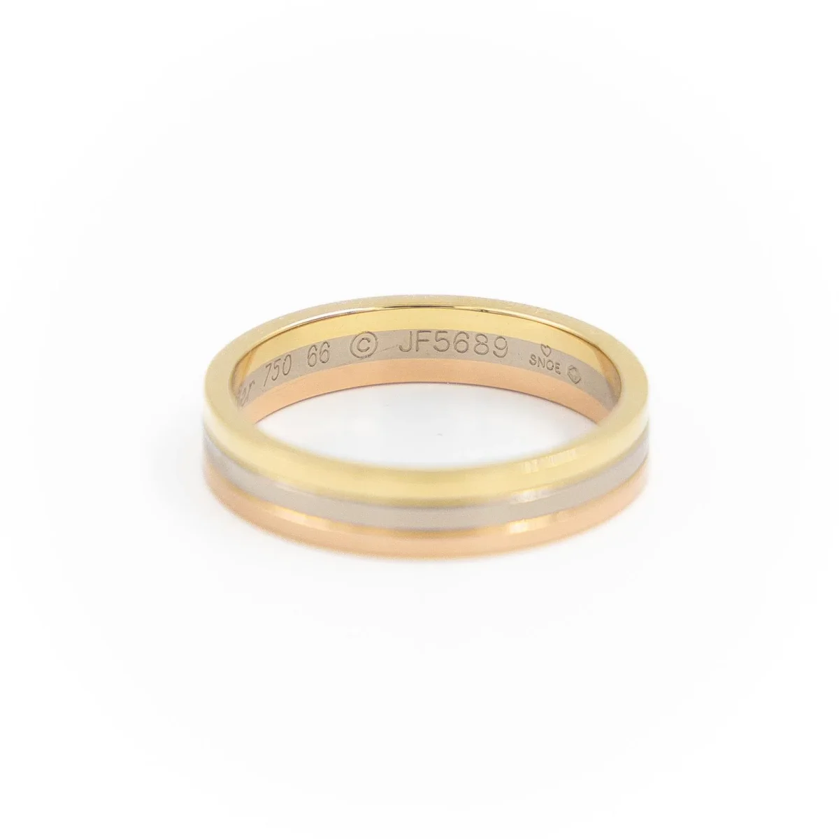 Bague signée de la Maison Cartier 3 ors 750 millièmes (18 carats), Ancien modèle Trinity, Tour de doigt: 66, Largeur sur le dessus: 0,48 cm, Signée et numérotée: JF5689, Poids total: 8,20 g, Poinçon saint-bernard, Excellent état