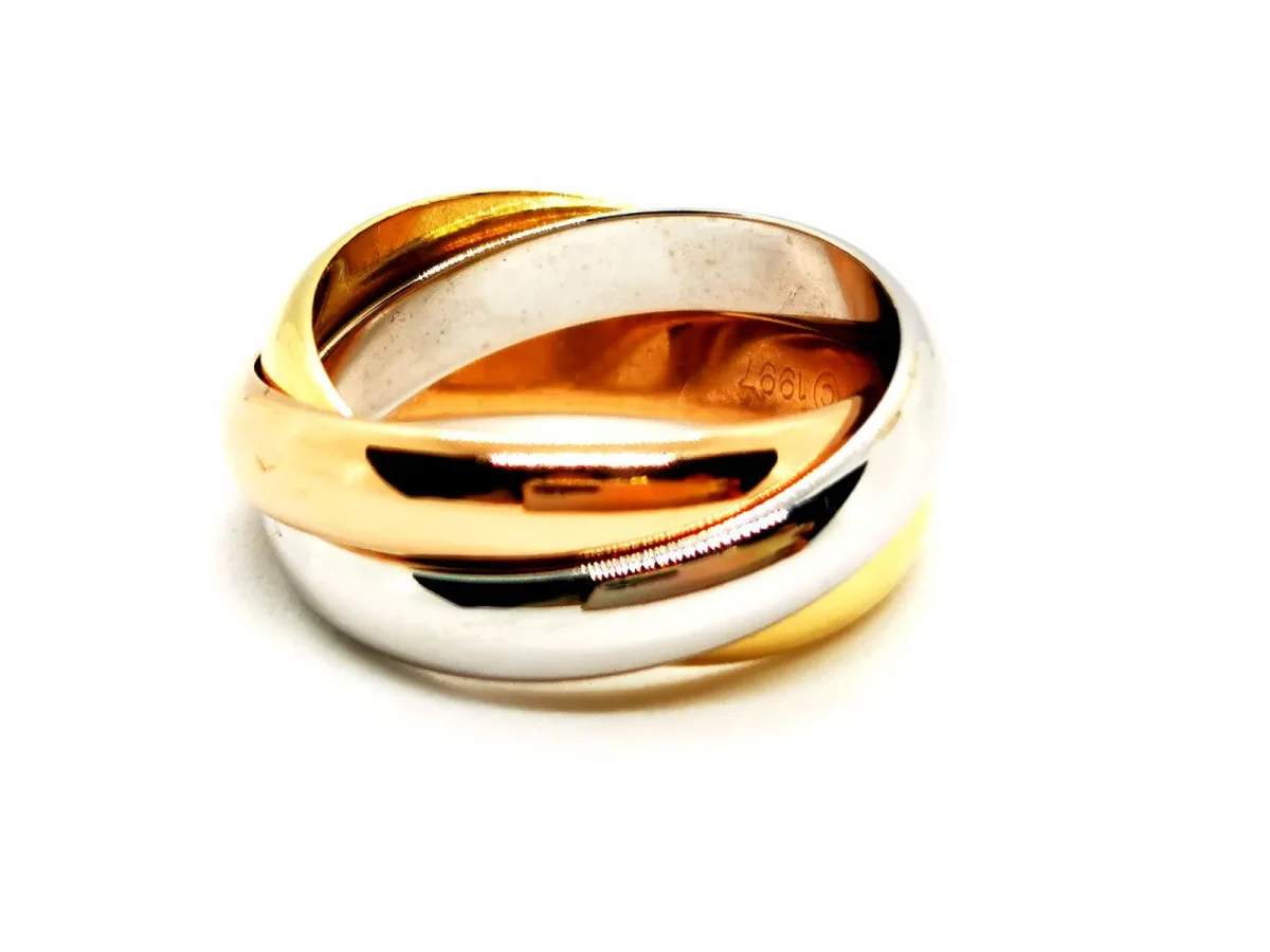 Bague signée de la maison Cartier, collection Trinity classique, en 3 ors, or jaune, or rose et or blanc 750 millièmes (18 carats), largeur d’un anneau: 0,37 cm, tour de doigt: 51, année 1997, signée et numérotée: P5194B, poids total: 10,47 g, poinçonnée Hibou, Excellent état, prix neuf: 1330 €