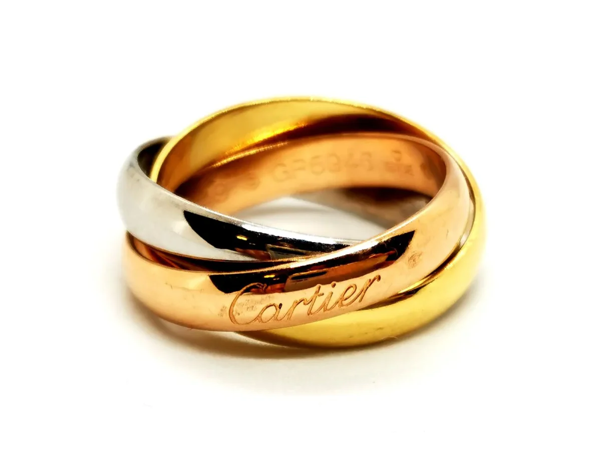 Bague signée de la maison Cartier, Collection Trinity Classique, en or 750 millièmes (18 carats), or jaune, or rose, et or blanc, 3 anneaux entrelacés, numérotée GR5946, tour de doigt: 49, largeur d’un anneau: 0,33 cm, prix neuf: 1330 €, poids: 7,52 g, poinçon Hibou, excellent état.