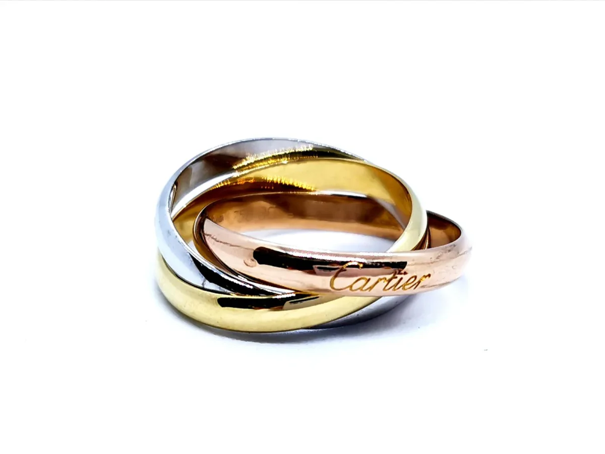 Bague signée de la maison Cartier, collection Trinity, moyen modèle classique, en or 750 millièmes (18 carats), composé de 3 anneaux mobiles entrelacés, taille: 60, largeur d’un anneau: 3,5 mm, poids total: 10,16 g, poinçonnée et numérotée: EV3307, excellent état, prix neuf: 1290€