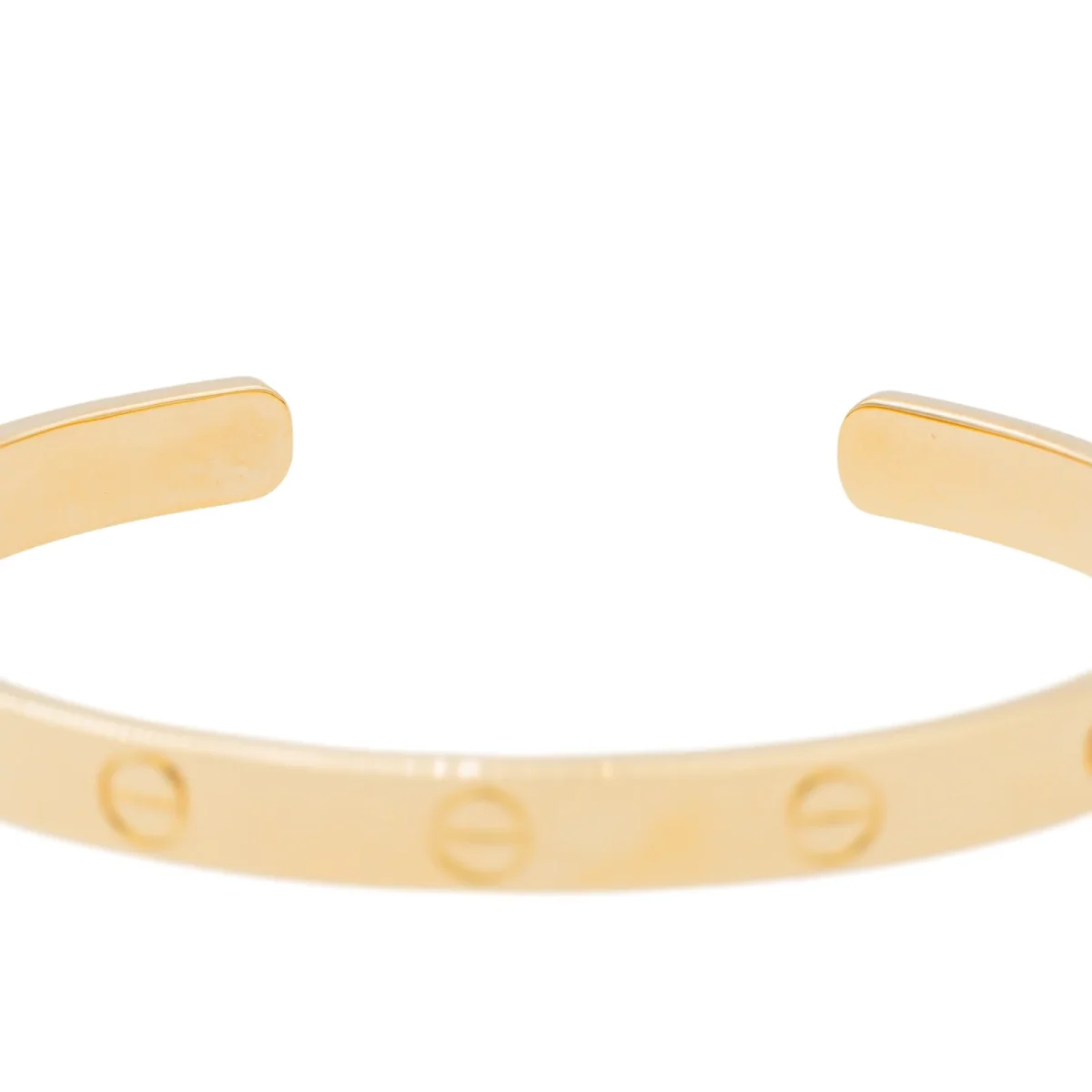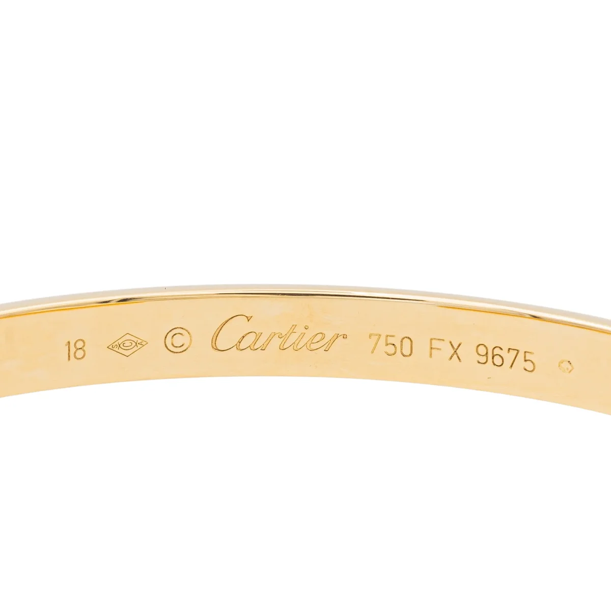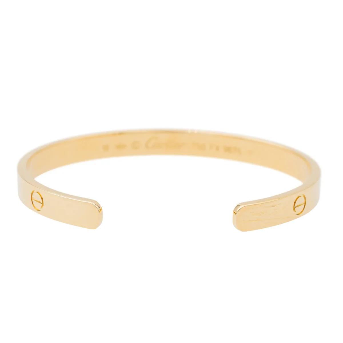 Bracelet jonc signé de la Maison Cartier en or jaune 750 millièmes (18 carats), modèle Love, largeur : 0,62 cm, longueur : 15,00 cm, tour de poignet : 18,00 cm, poids total : 25,94 g, poinçon Saint Bernard, numéroté : FX9675, excellent état