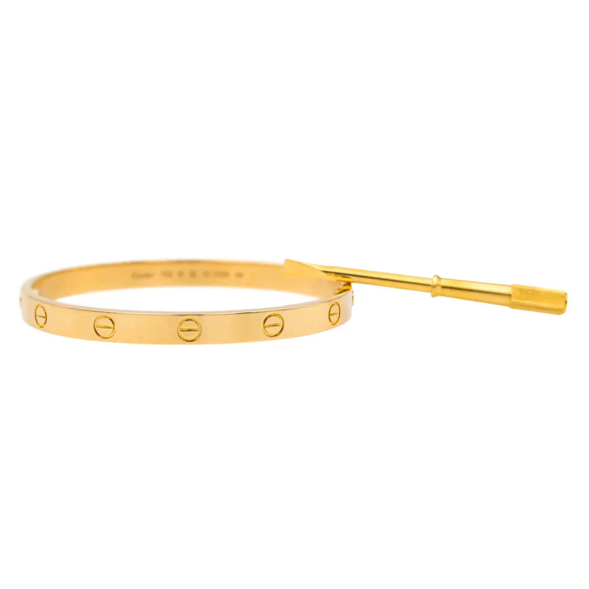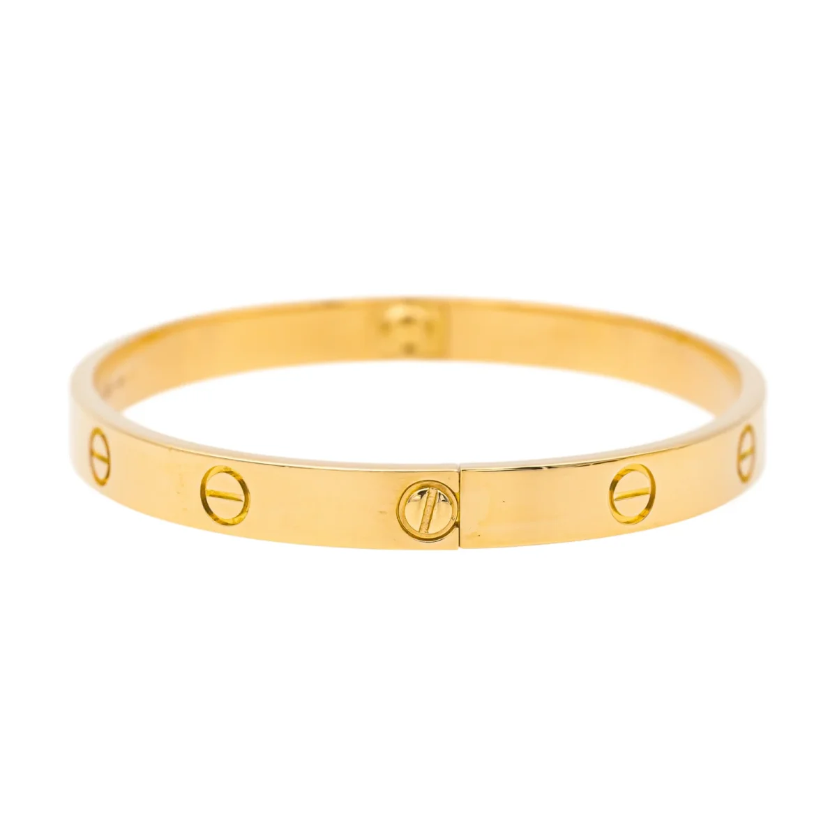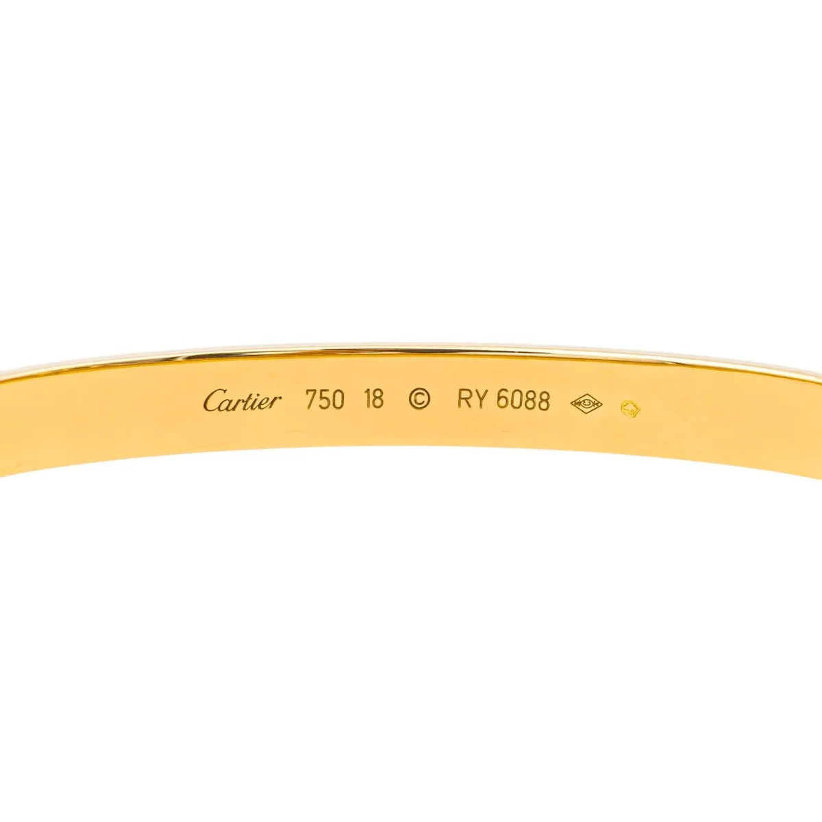 Bracelet signé de la Maison Cartier, en or jaune 750 millièmes (18 carats), modèle classique Love, diamètre intérieur : 5,95 cm x 5,00 cm, tour de poignet : 18 cm, largeur : 0,61 cm, numéroté : RY6088, vendu avec tournevis et pochette d’origine, poids total : 36,48 g, Poinçon Saint Bernard, Excellent état