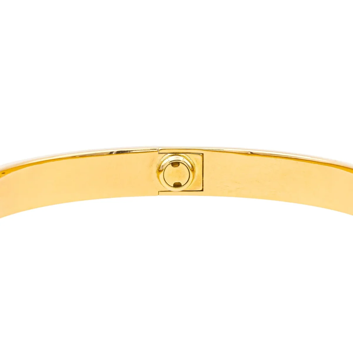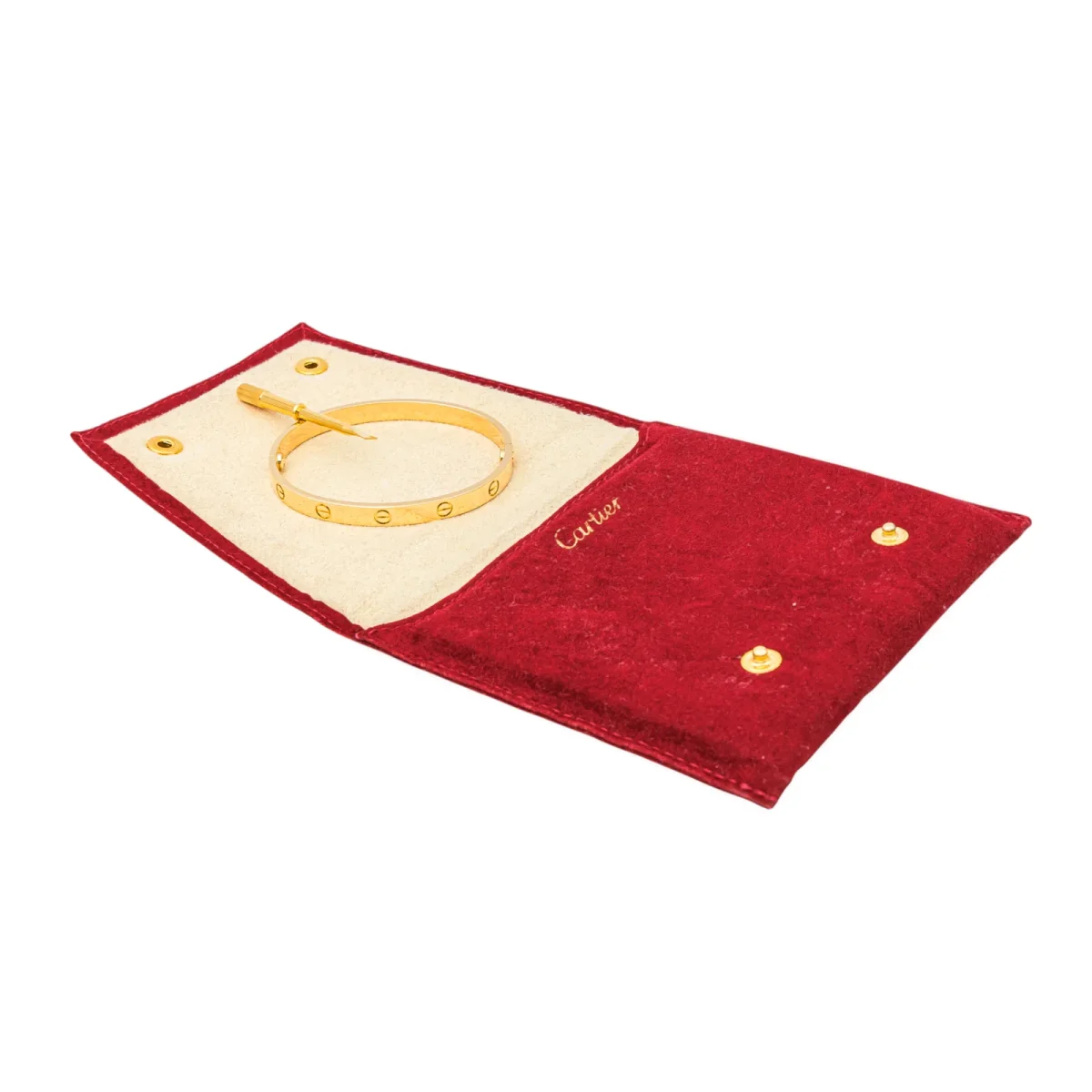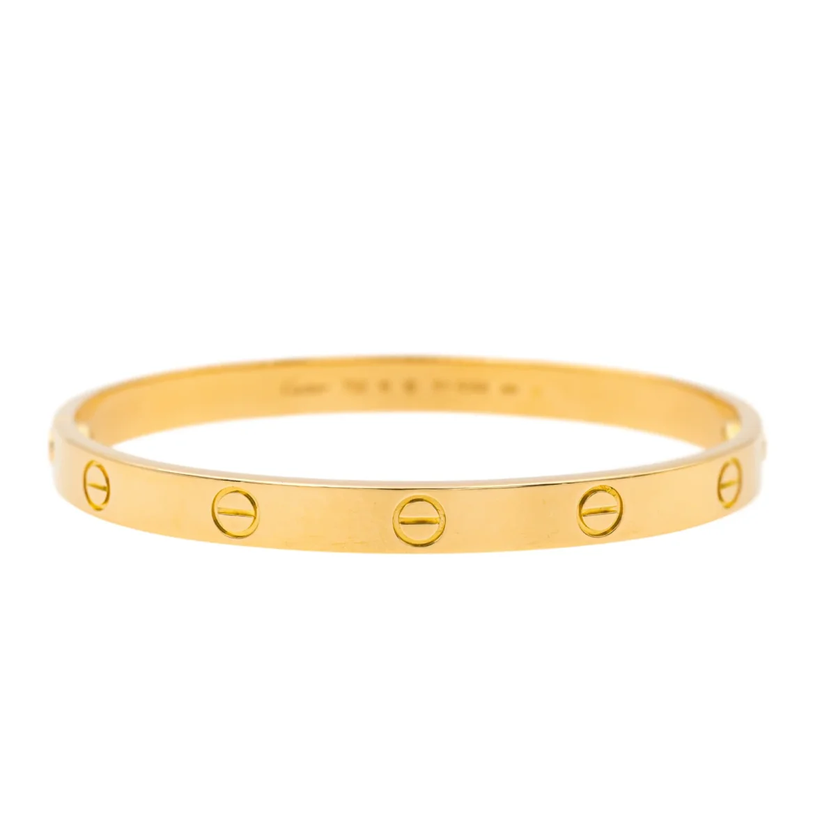 Bracelet signé de la Maison Cartier, en or jaune 750 millièmes (18 carats), modèle classique Love, diamètre intérieur : 5,95 cm x 5,00 cm, tour de poignet : 18 cm, largeur : 0,61 cm, numéroté : RY6088, vendu avec tournevis et pochette d’origine, poids total : 36,48 g, Poinçon Saint Bernard, Excellent état