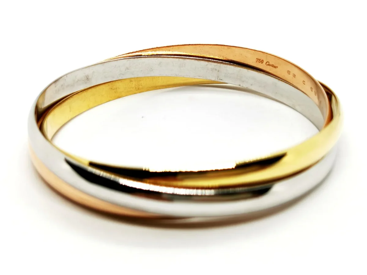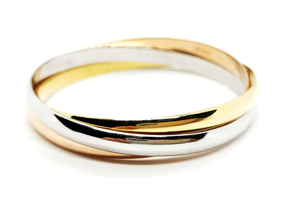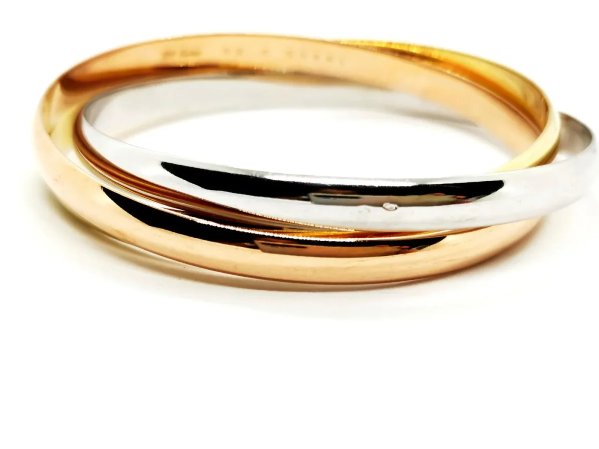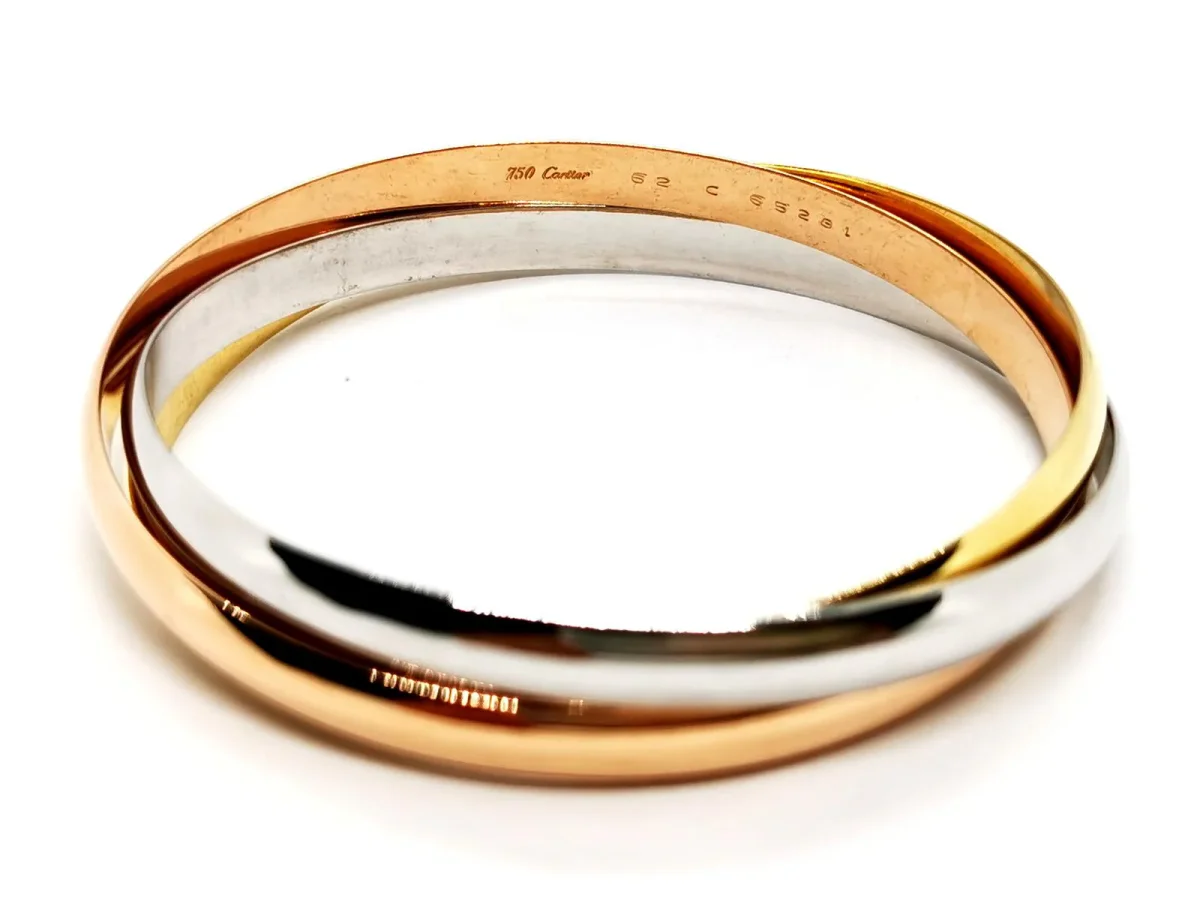 Bracelet signé de la maison Cartier, en or jaune, blanc et rose 750 millièmes (18 carats), modèle Trinity, largeur d’un anneau : 0,6 cm, épaisseur : 0,18 cm, diamètre intérieur d’un anneau : 6,14 cm, poids total : 79,48 g, numéroté 62C65281, poinçon tête d’aigle, excellent état