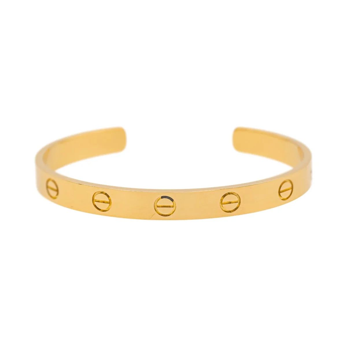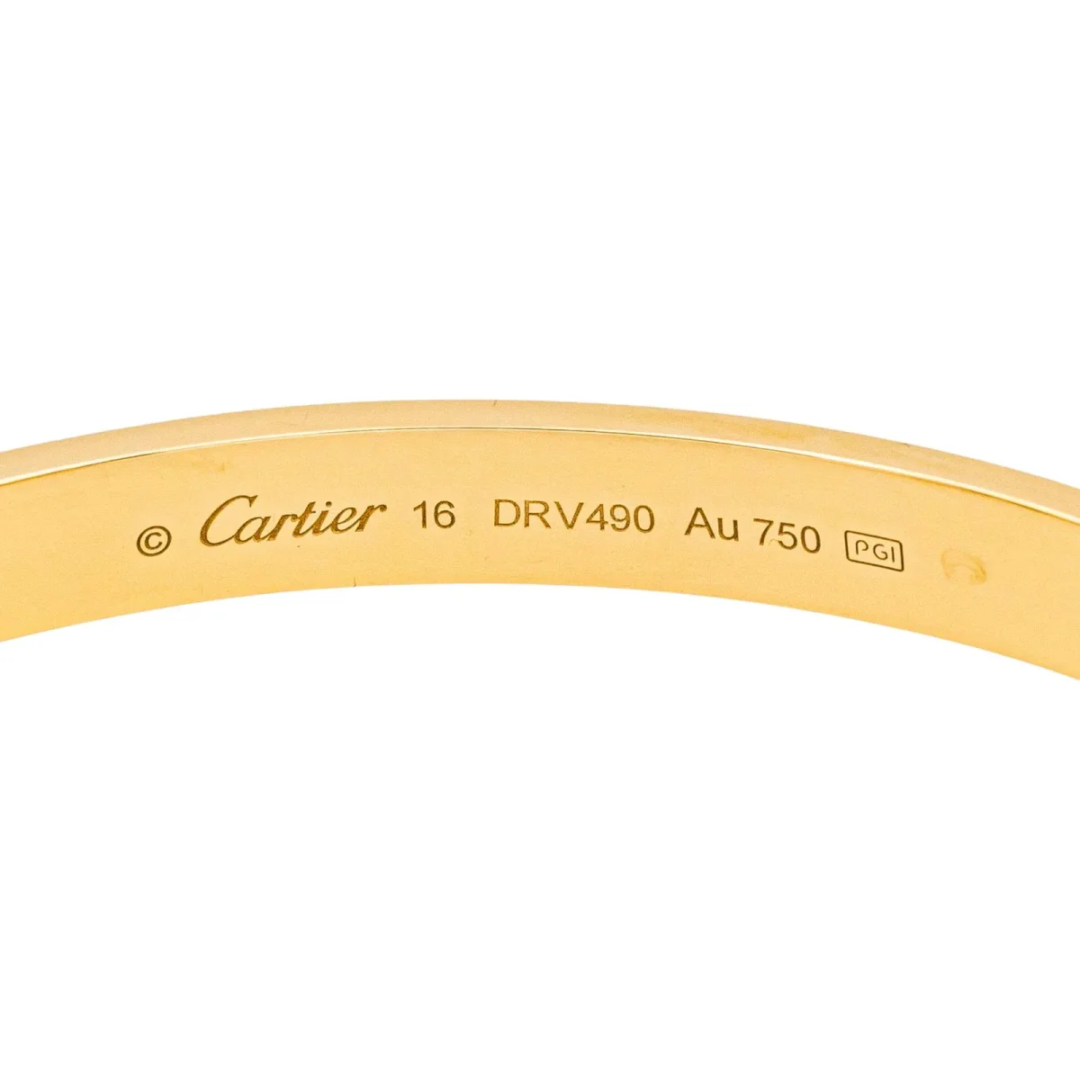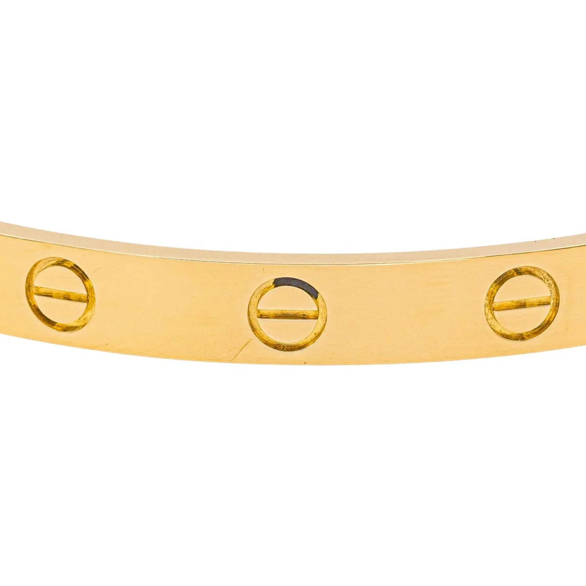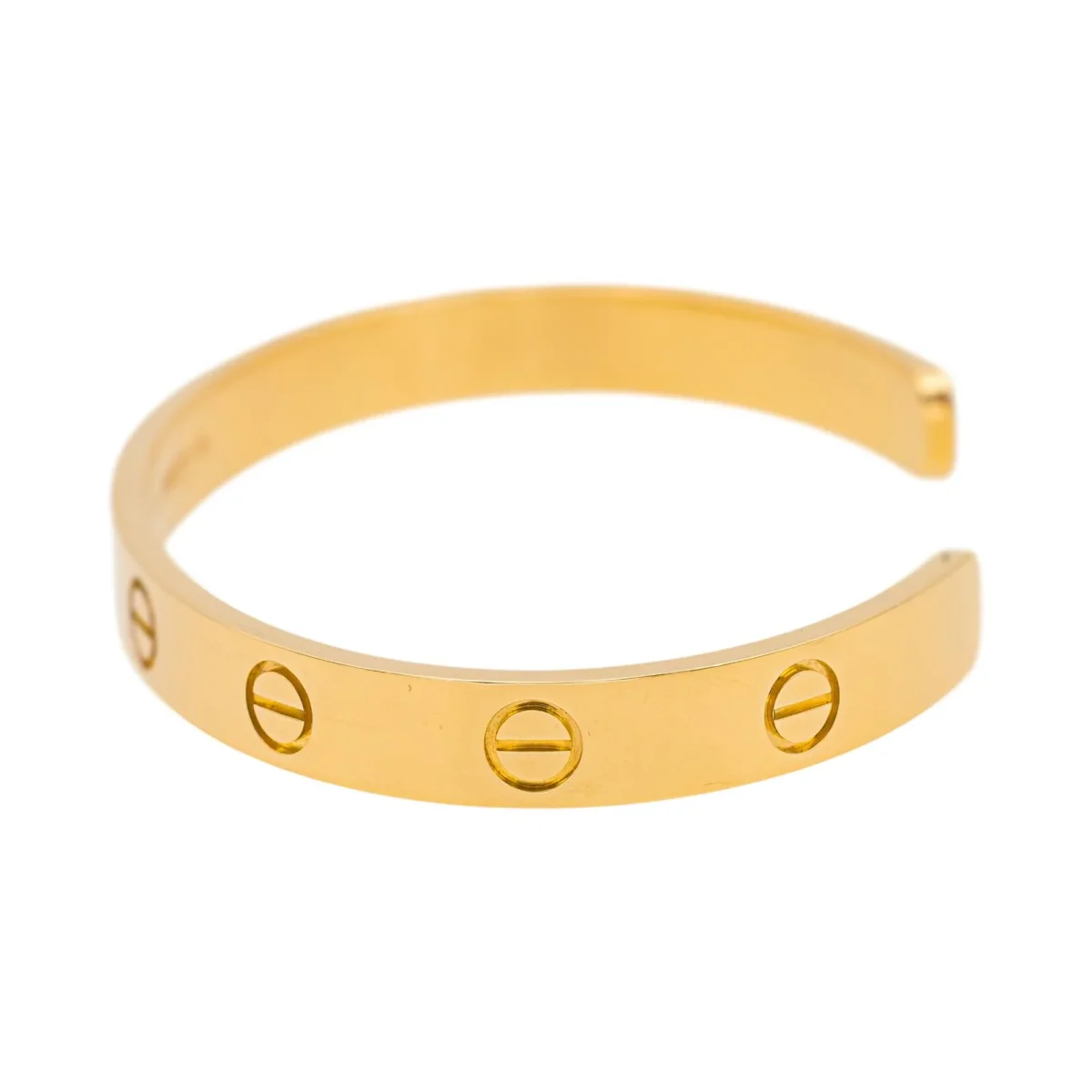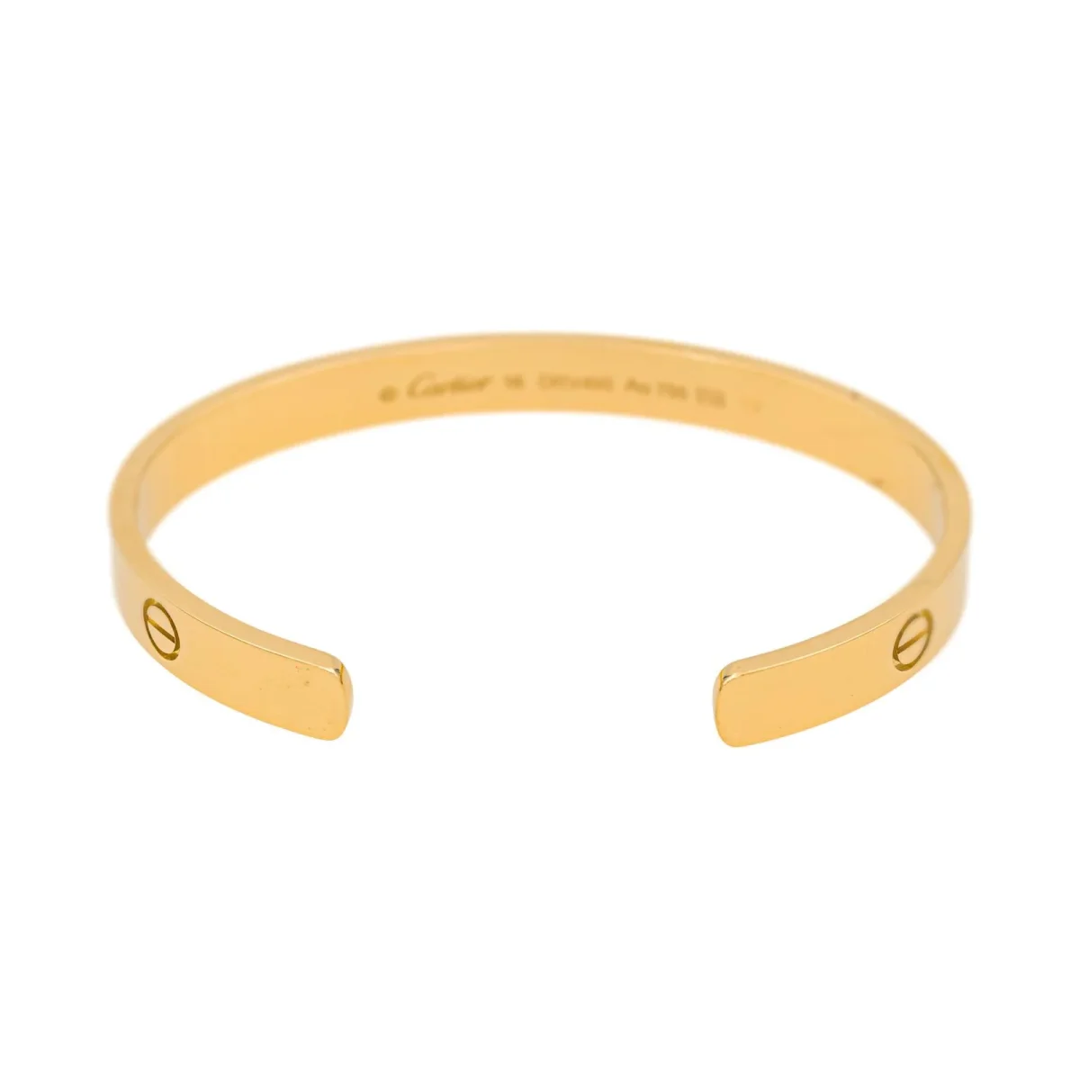 Bracelet jonc ouvert signé de la Maison Cartier en or jaune 750 millièmes (18 carats), modèle Love, diamètre intérieur : 16,00 cm, largeur : 0,60cm, longueur : 5,87cm, poids total : 21,28 g, poinçon hibou, numéroté, Excellent état