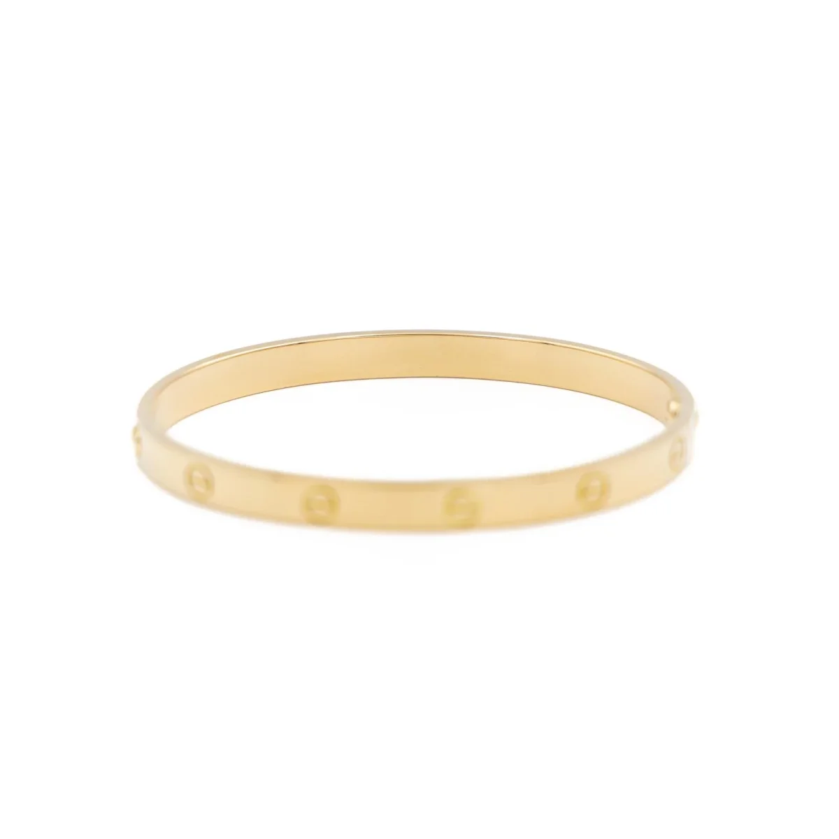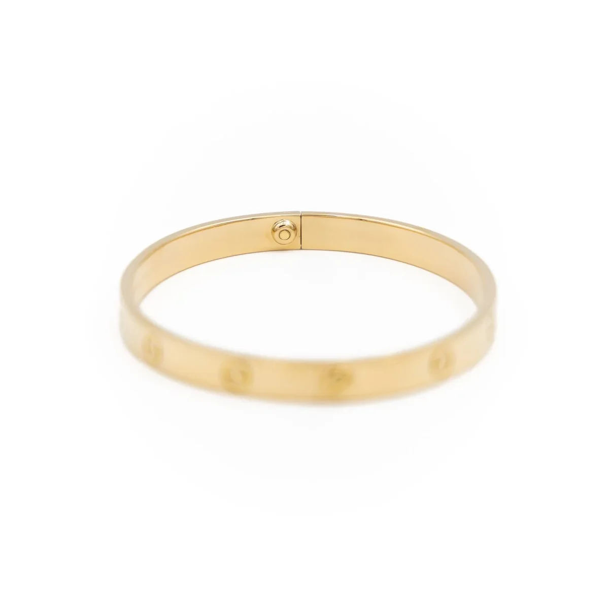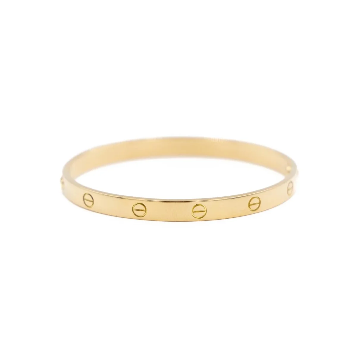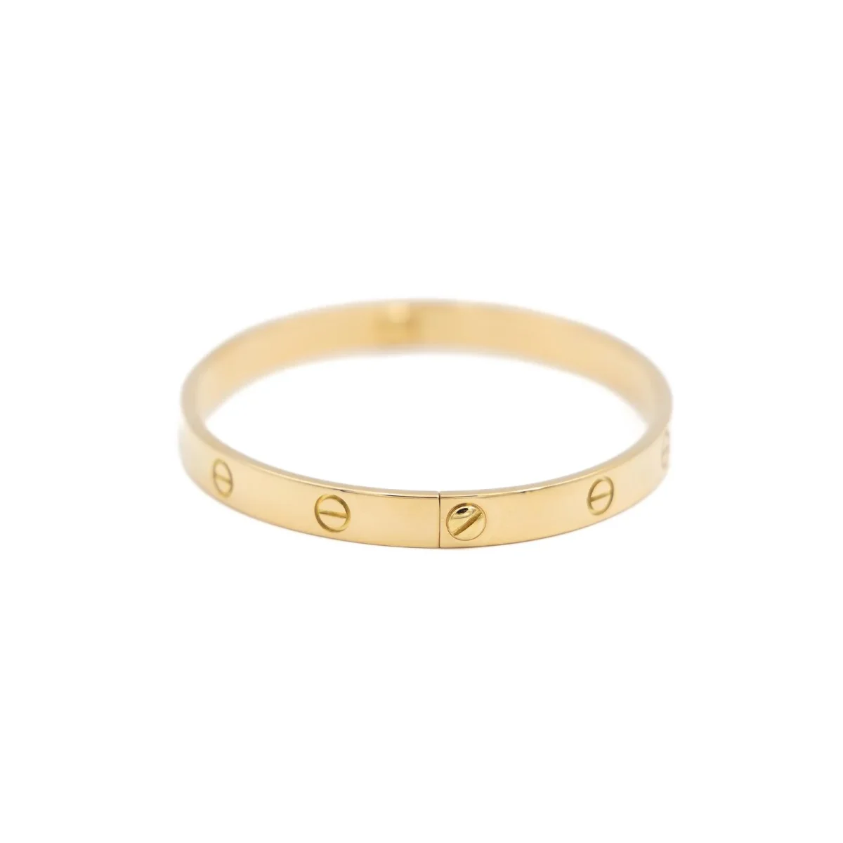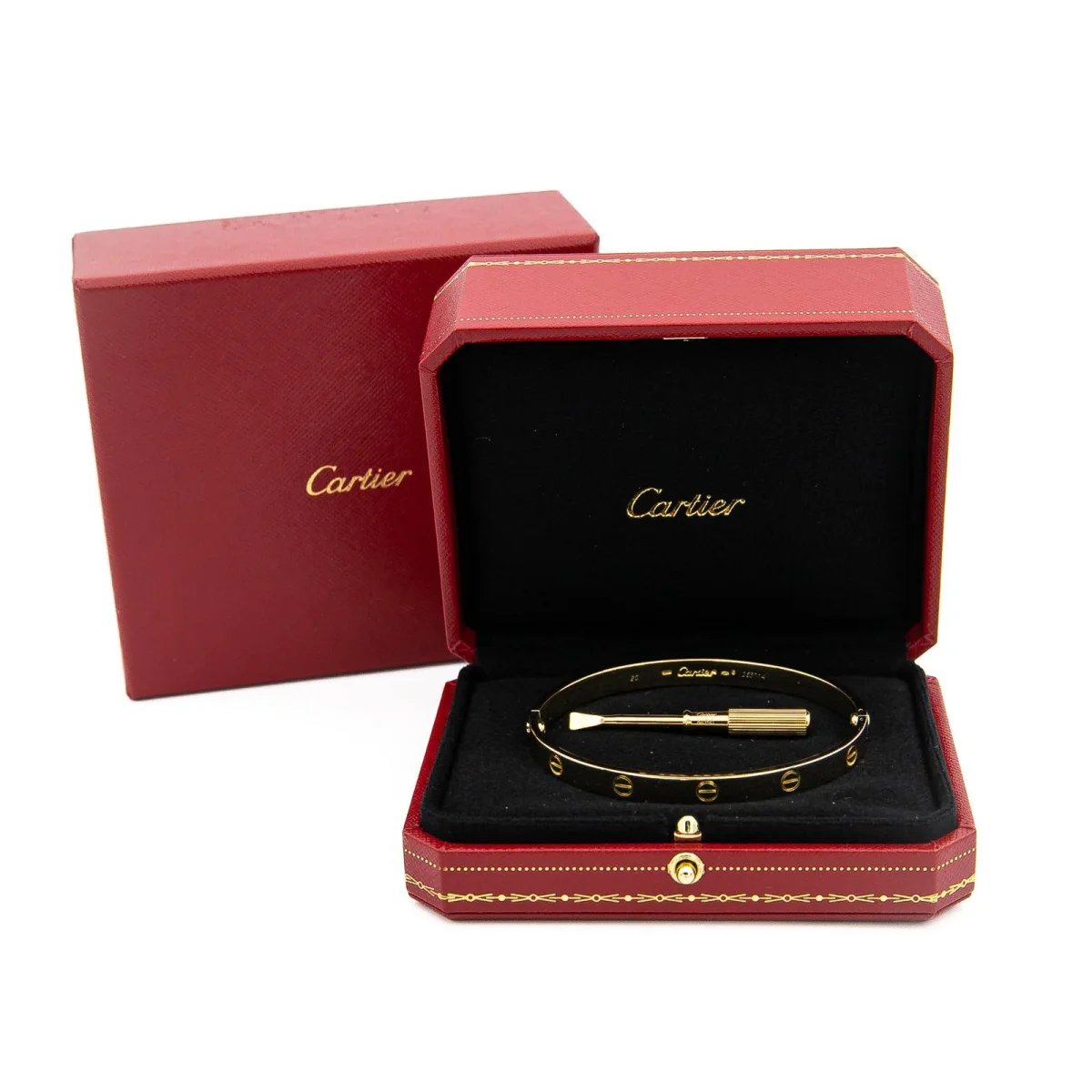Bracelet signé de la Maison Cartier, en or jaune 750 millièmes (18 carats), modèle Love, Tour de poignet: 20 cm, Largeur: 0,60 cm, signé et numéroté: D63714, avec tournevis et écrin Cartier, Poids total: 36,48 g, Poinçon hibou, Excellent état