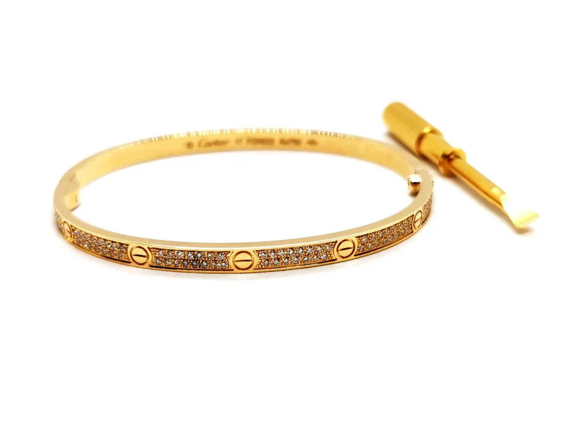 Bracelet signé de la maison Cartier, collection Love petit modèle Pavé, en or jaune 750 millièmes (18 carats), orné de 12 motifs de vis, pavé de 177 diamants taille brillant, poids total diamants: environ 0,95 ct, environ F/VS, taille 17, numéroté: FGN022, Largeur: 3,65 mm, poids total bracelet: 17,50 g, poinçon tête d’aigle, livré avec tournevis Cartier et certificat, pochette en velours, prix neuf: 26 800€, excellent état.