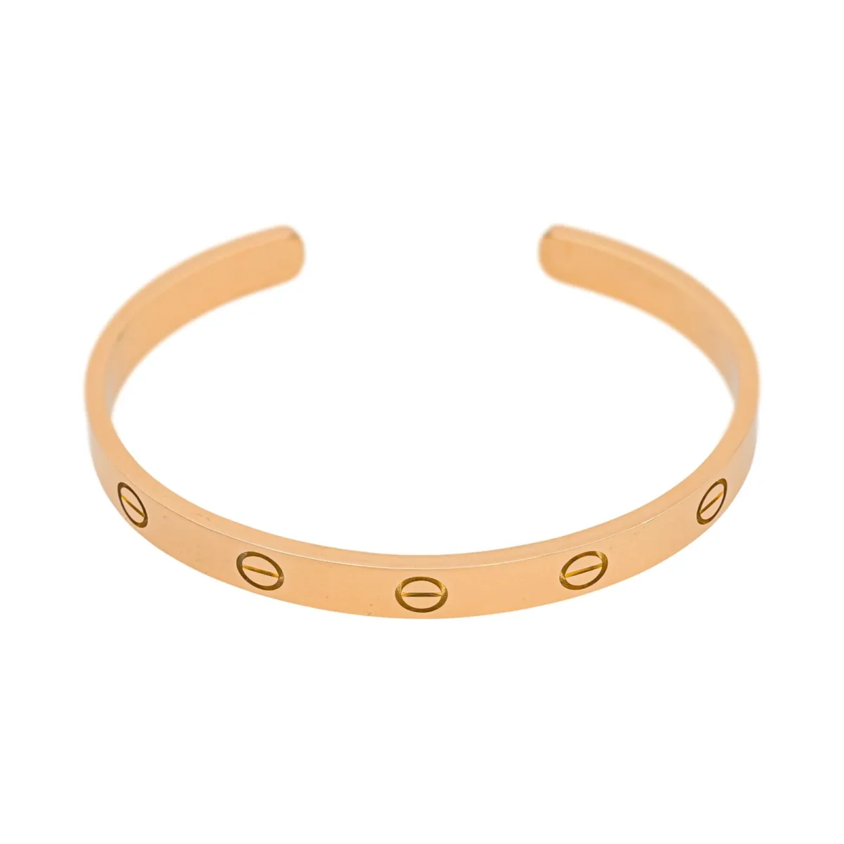 Bracelet jonc ouvert signé de la Maison Cartier en or rose 750 millièmes (18 carats), modèle Love, diamètre intérieur : 17,00 cm, largeur : 0,60cm, longueur : 5,87cm, poids total : 22,70 g, poinçon hibou, numéroté, Excellent état