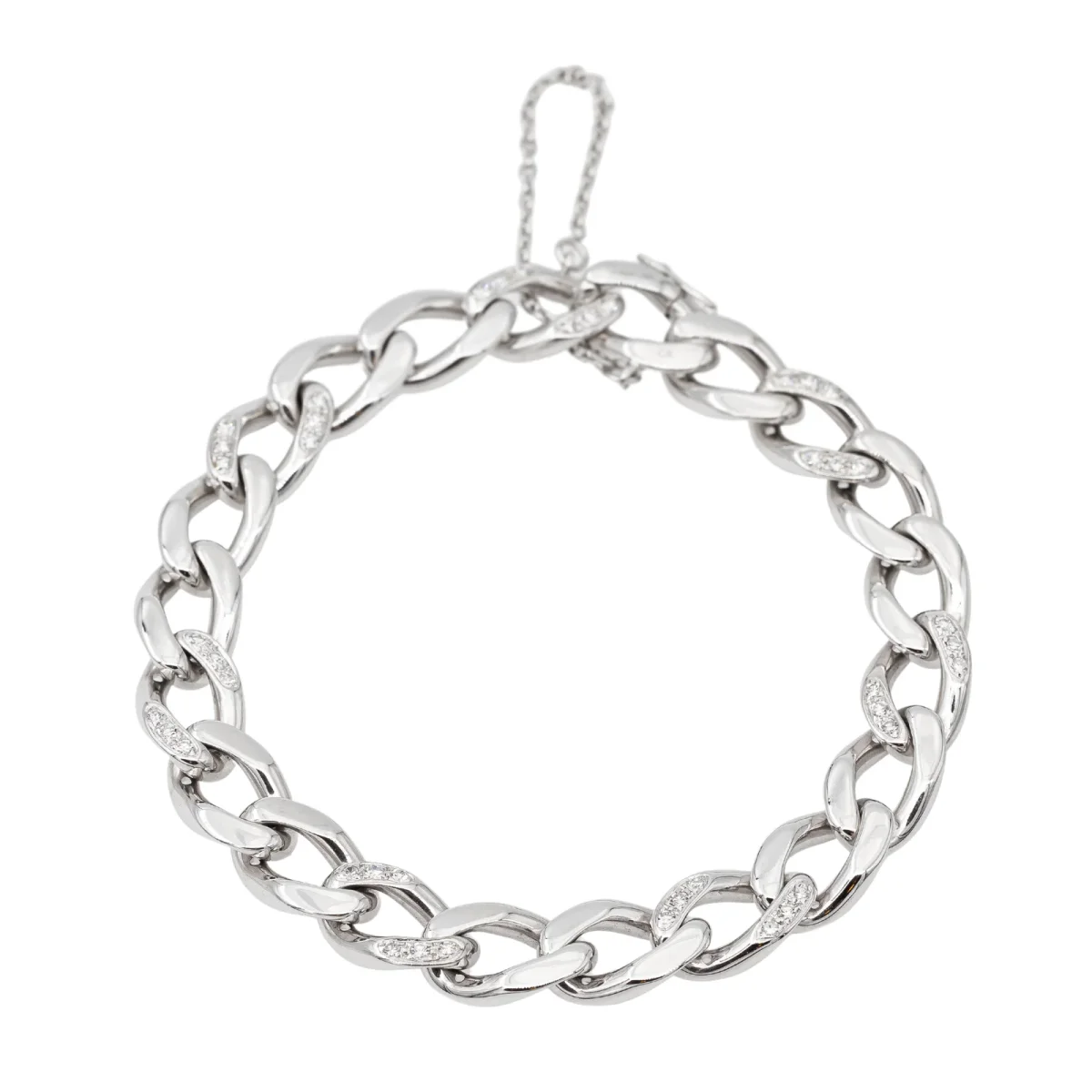 Bracelet signé de la Maison Cartier, en or blanc 750 millièmes (18 carats), serti de 42 diamants taille brillant, estimés H/VS, chacun d’un poids d’environ 0,01 ct, poids total des diamants: environ 0,42 ct, maille gourmette, longueur: 15,5 cm, largeur: 0,85 cm, poids total: 34,2 g, fermoir avec chaînette et huit de sécurité, poinçon hibou, excellent état