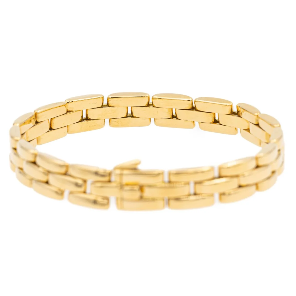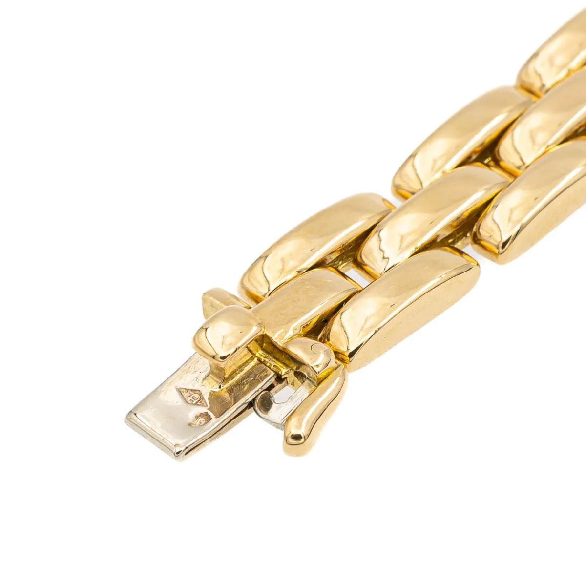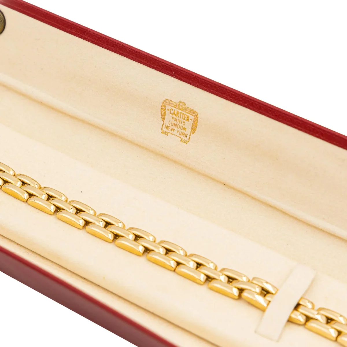 Bracelet signé de la maison Cartier, en or jaune 750 millièmes (18 carats), maille panthère, longueur: 18 cm, largeur: 0,84 cm, épaisseur: 0,28 cm, longueur d’un maillon: 0,97 cm, poids total: 40,07 g, numéroté: 605492, écrin Cartier d’origine, poinçon tête d’aigle, excellent état