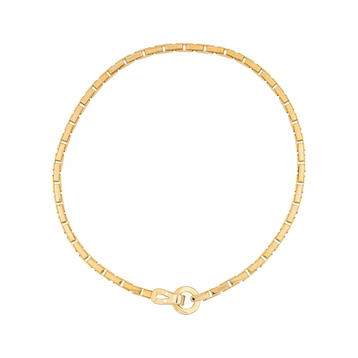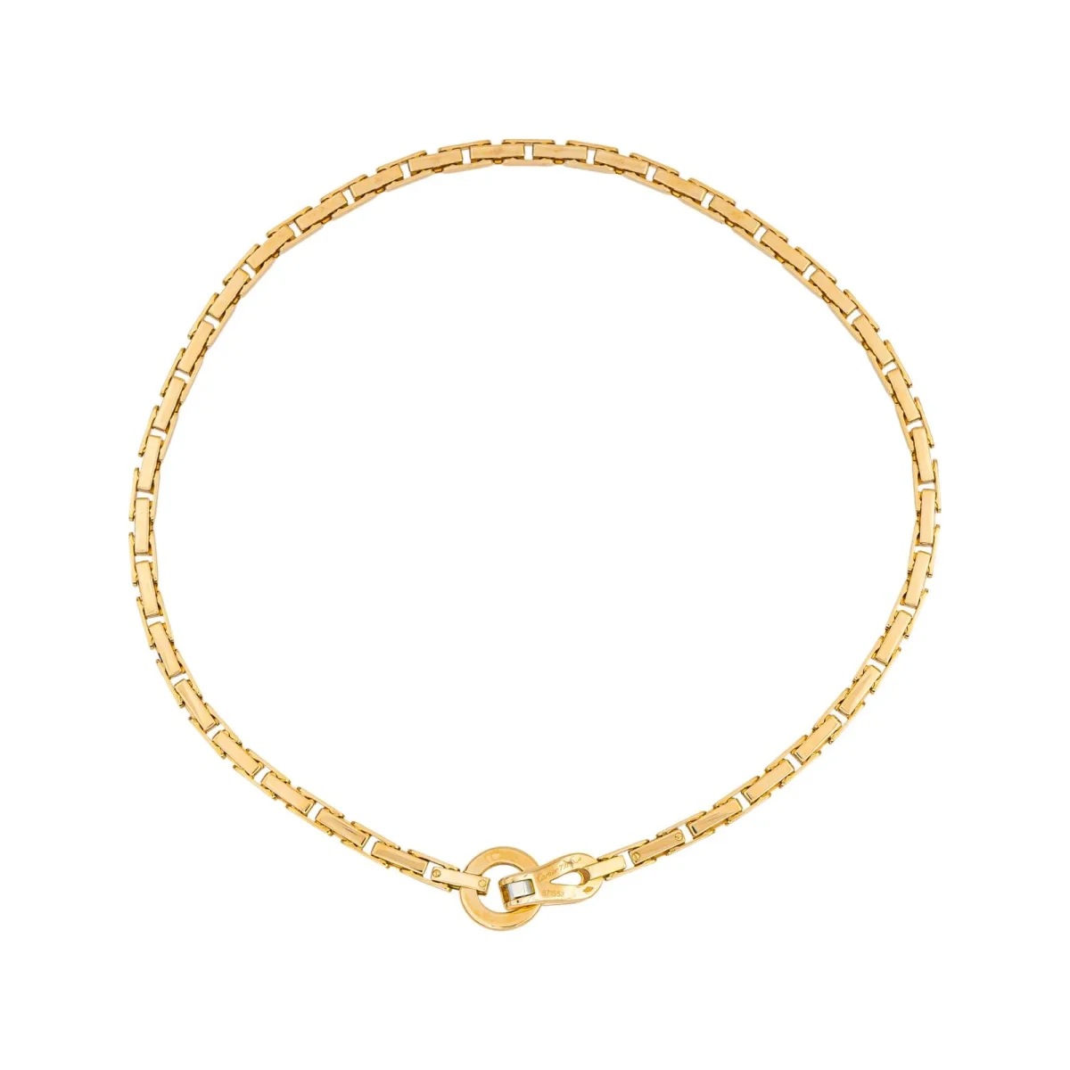 Collier signé de la Maison Cartier en or jaune 750 millièmes (18 carats), modèle Agrafe, longueur : 42,00 cm, largeur : 0,45 cm, épaisseur : 0,45 cm, poids total : 66,42 g, poinçon tête d’aigle, vendue avec certificat d’origine, numéroté, excellent état