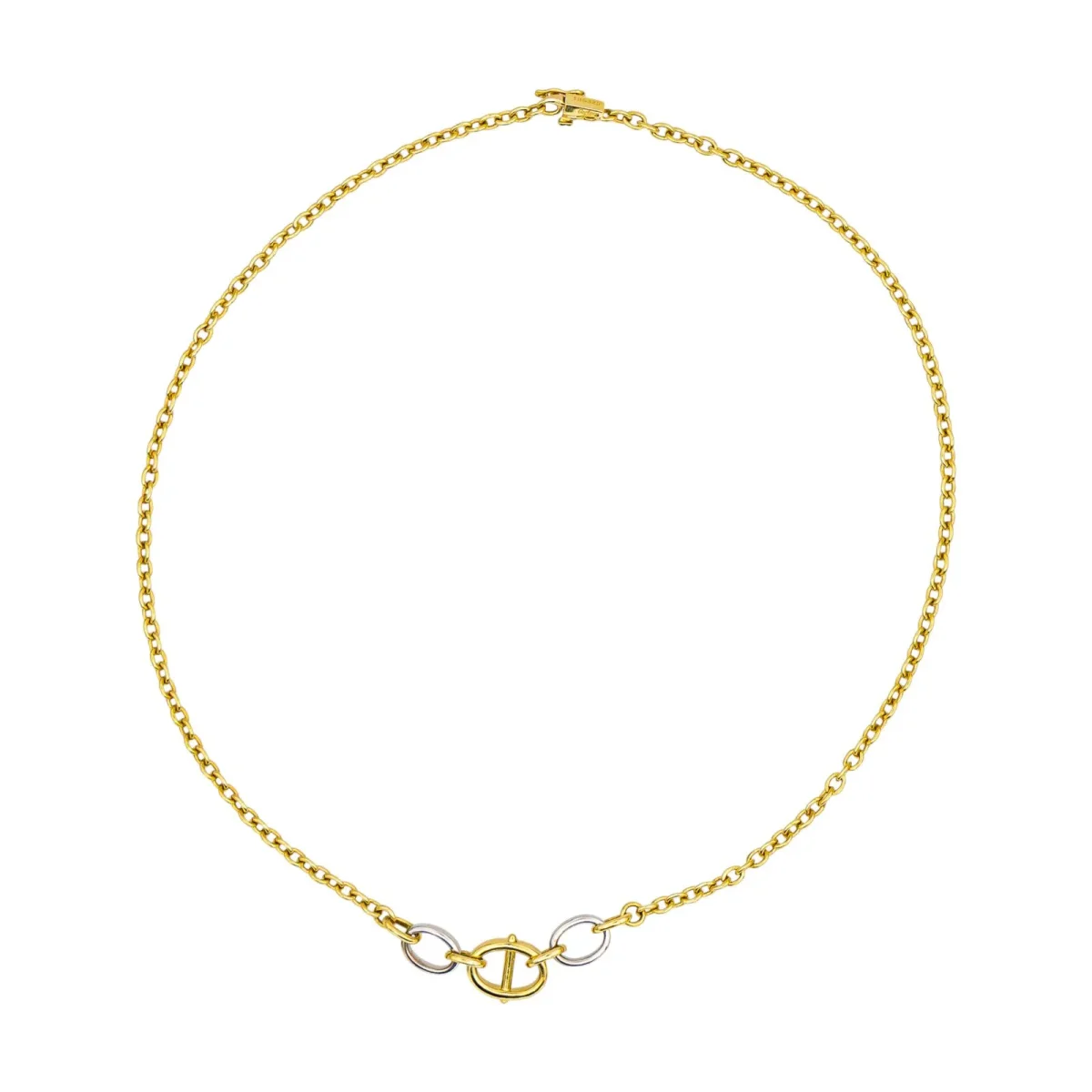 Collier signé de la Maison Cartier en or jaune et or blanc 750 millièmes (18 carats), modèle étrier, maille forçat, longueur : 40,00 cm, largeur : 1,15 cm, épaisseur : 0,25 cm, poids total : 14,64 g, poinçon charançon, numéroté : 196325, bon état