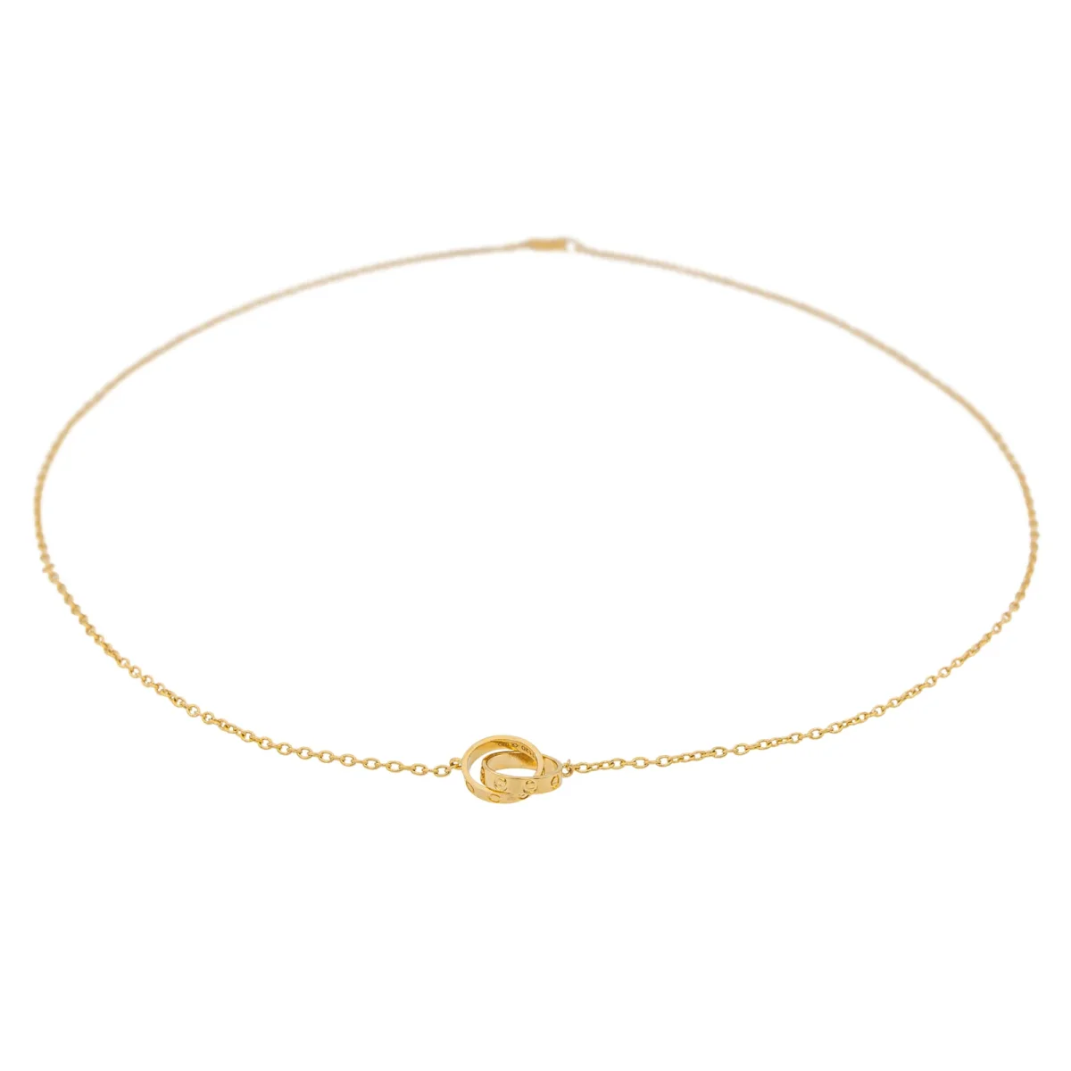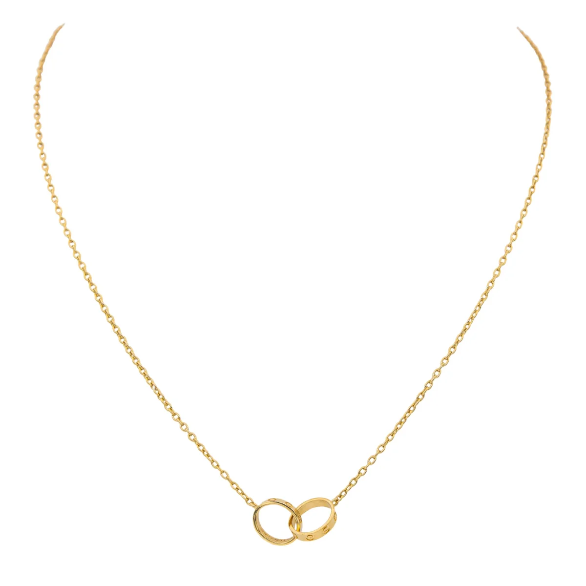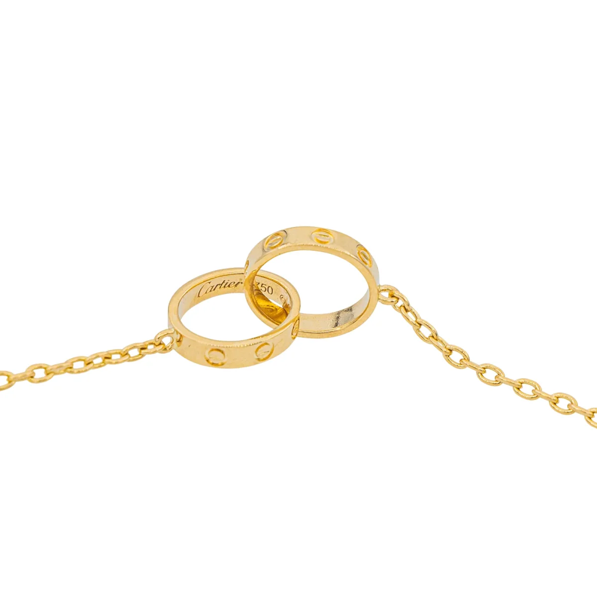Collier Cartier Love en or jaune 750 millièmes (18 carats), double cercles entralcés, longueur: 49,50 cm, longueur de la partie comprenant les motifs : 22,90 cm, largeur d’un cercle: 0,96 cm, numéroté SR1120, prix neuf : 2740 €, poids total : 6,40 g, poinçon hibou, excellent état