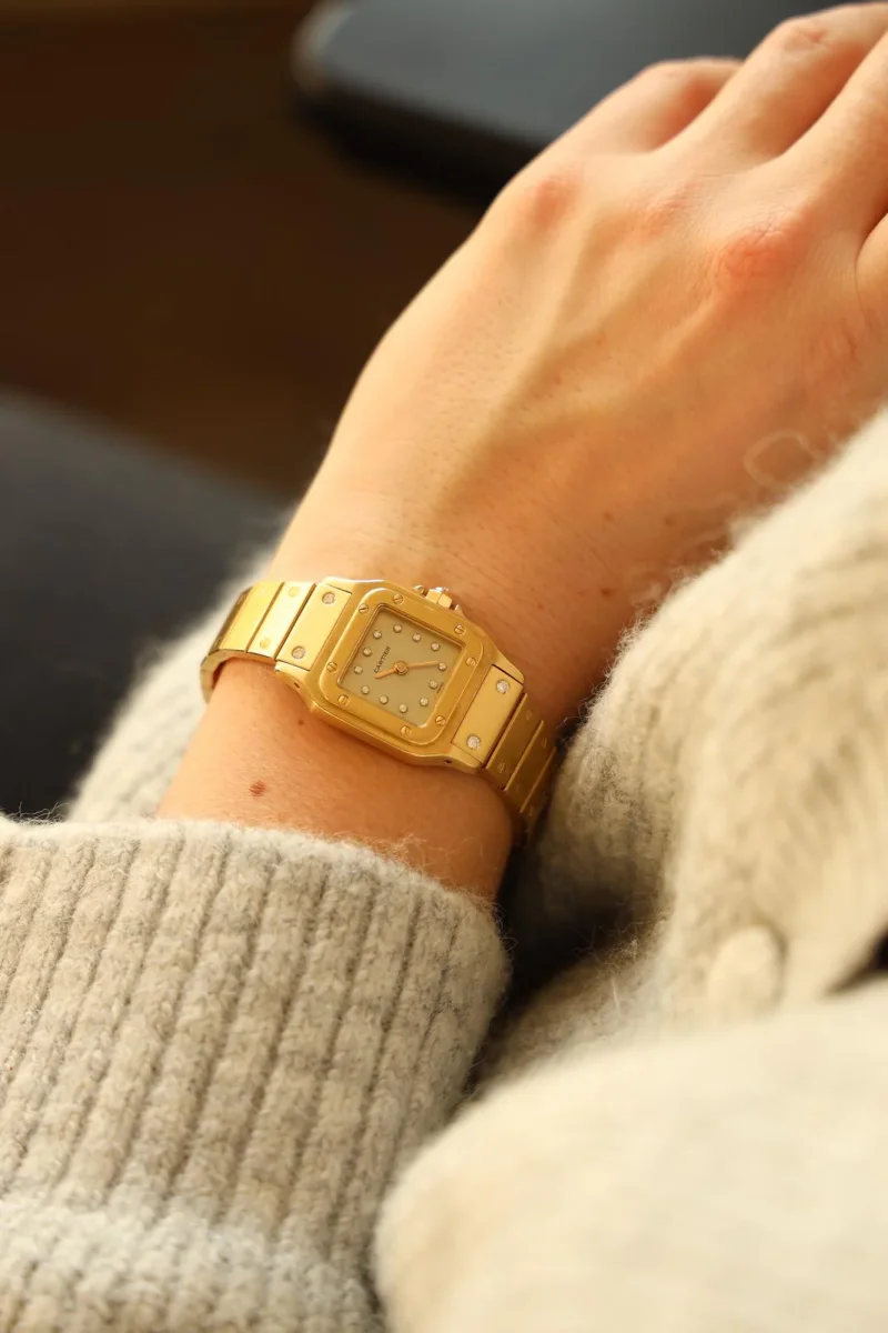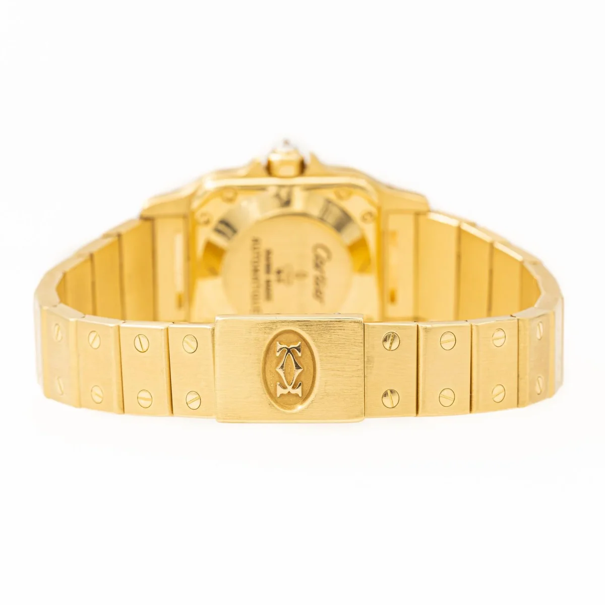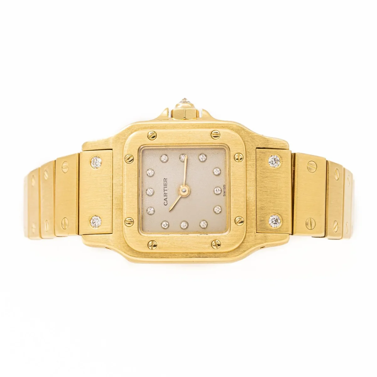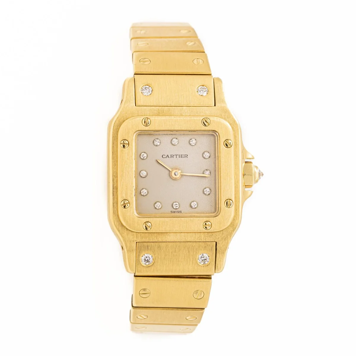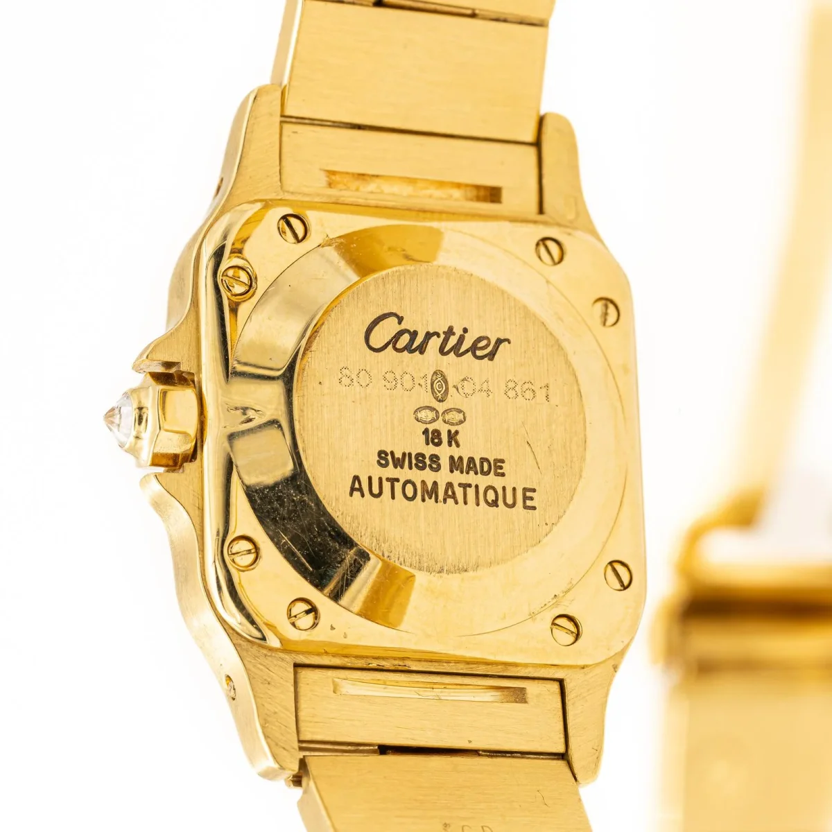 Montre signée de la maison Cartier en or jaune 750 millièmes (18 carats), 12 diamants à l’intérieur du cadran environ H-SI, d’environ 0,01 ct chacun, 4 diamants d’environ 0,03 ct environ, environ H-SI, poids total diamants : 0,24 ct, longueur du bracelet : 16 cm, largeur du cadran : 20,62 mm, numérotée 809004861, poids total : 94,38 g, poinçon hibou, excellent état