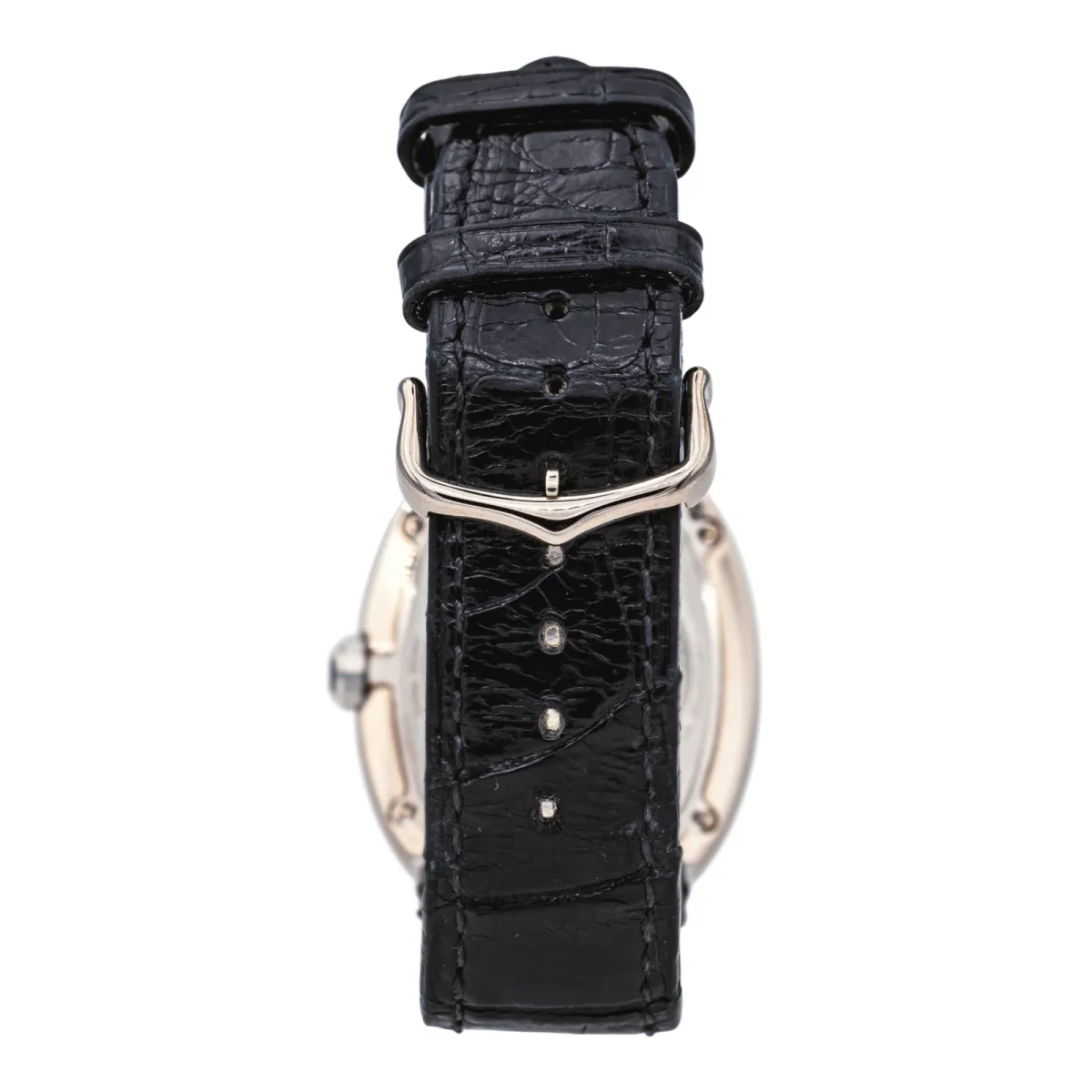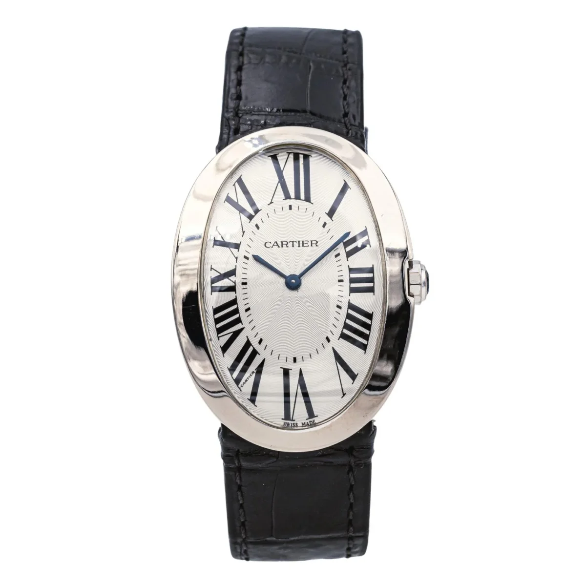 Montre Cartier, modèle Baignoire XL or blanc « 750 millièmes (18 carats) », n°série 85566PX 3032, cadran (blanc à chiffres romains, mouvement mécanqiue à remontage manuel, boîtier 44 x 32 mm, verre saphir, bracelet cuir d’origine à boucle ardillon (taille poignet 22 cm ajustable, largeur bracelet 1,94 cm), poids total : 67,99 g, années 2000, révision complète, Poinçon Saint Bernard, excellent état