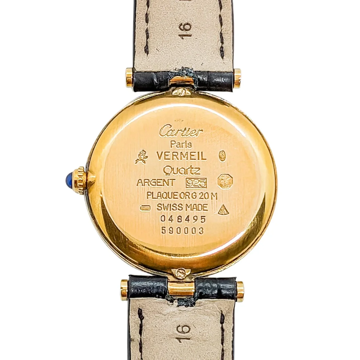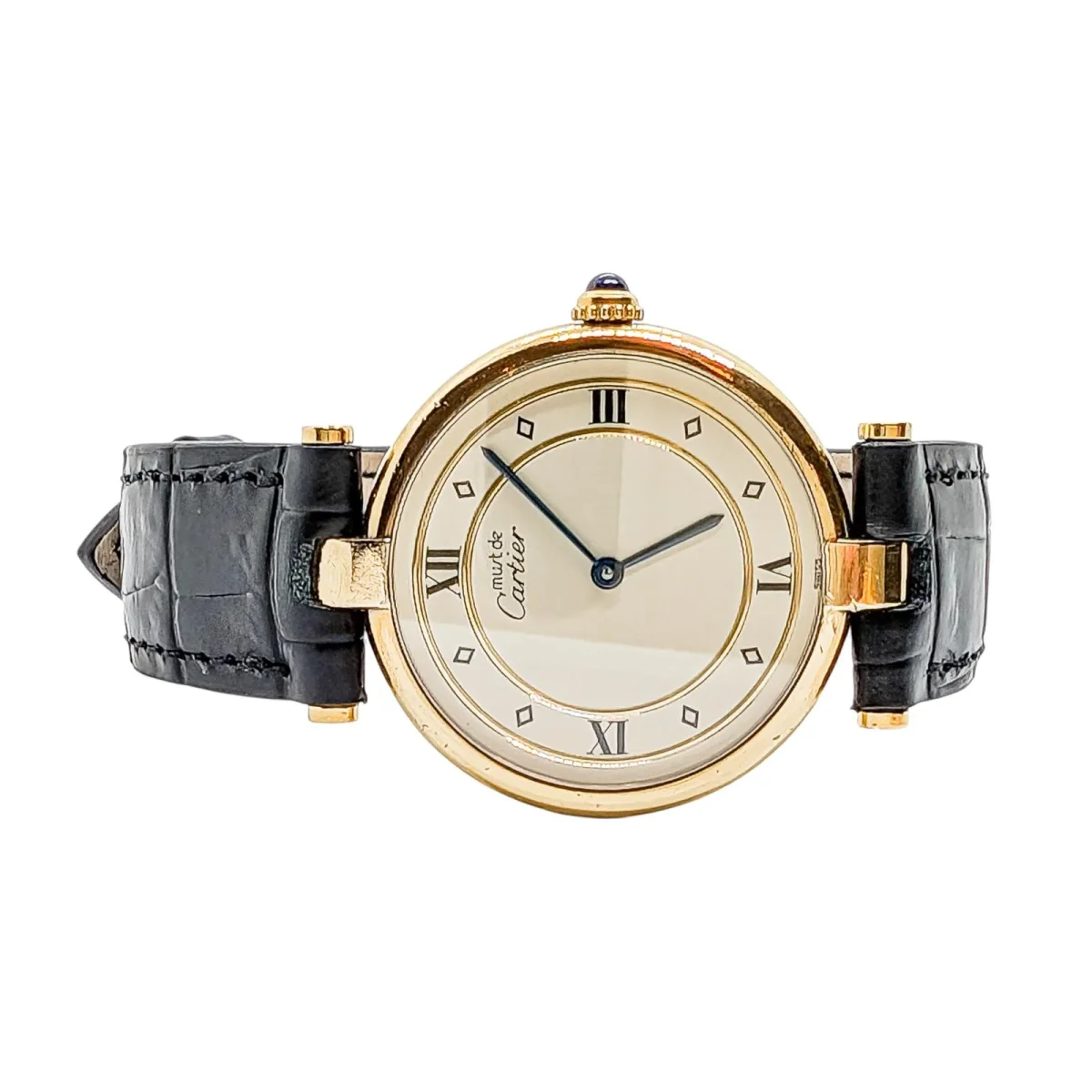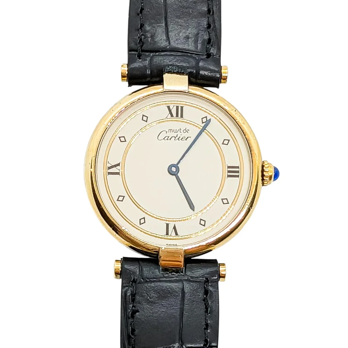 Montre signée de la Maison Cartier, modèle Must Vendôme, en vermeil (argent 925 millièmes plaqué Or jaune), boîtier rond 30mm, mouvement quartz, chiffres romains, bracelet cuir noir neuf, boucle ardillon d’origine Cartier légèrement dépolie, numérotée 048495 590003, cabochon saphir, poignet: jusqu’à 20 cm, largeur bracelet: entre 1,6 cm et 1,4 cm, Poids total: 25,37 g, pochon Cartier, révisée, excellent état