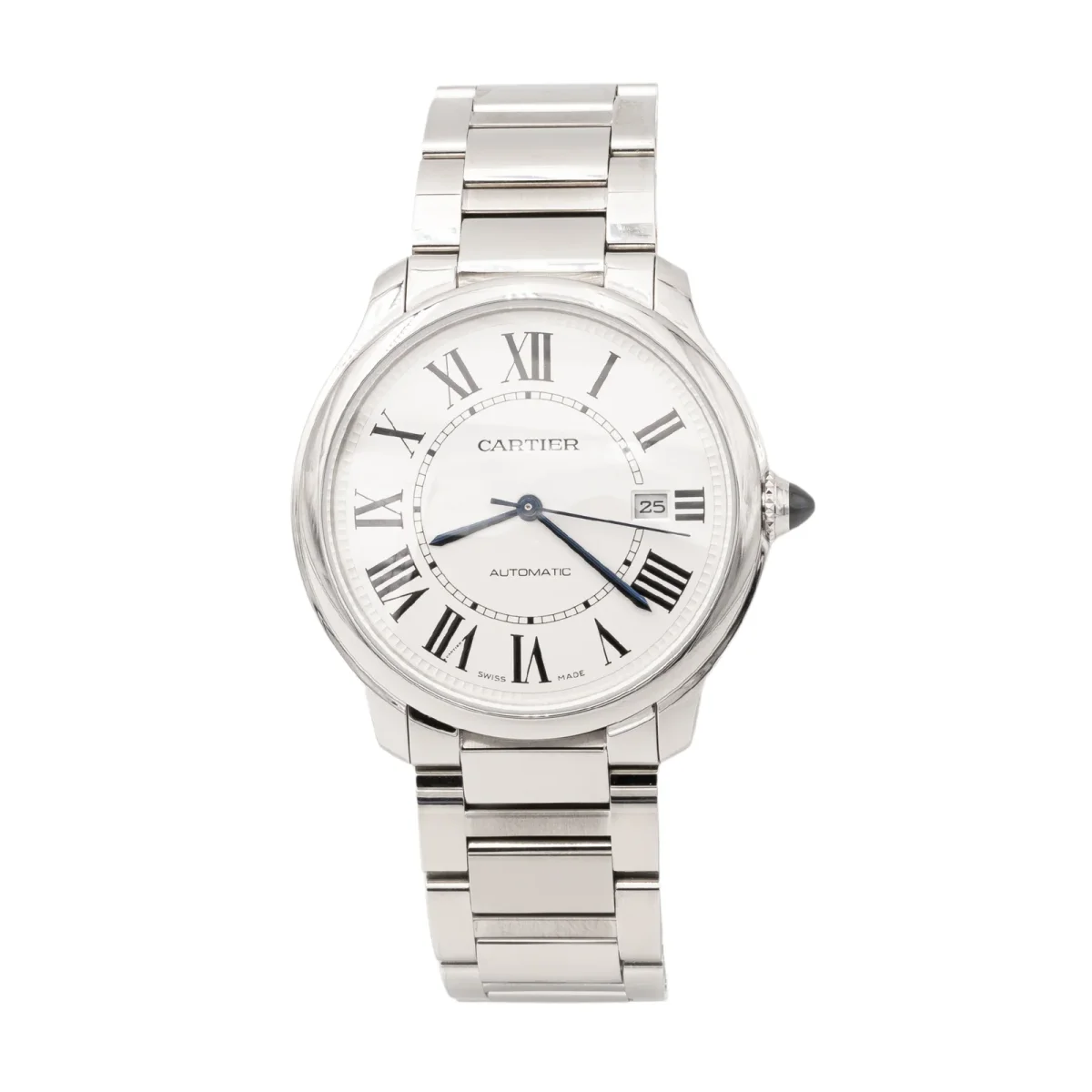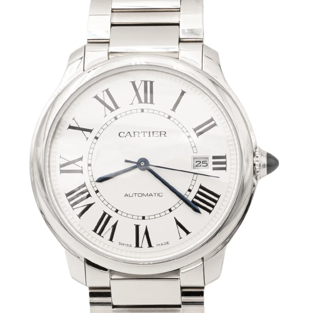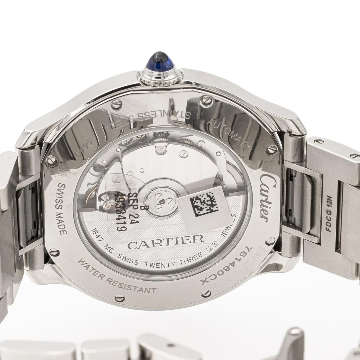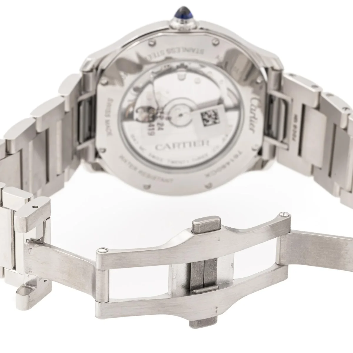 Montre homme signée de la maison Cartier, modèle ronde must, en acier, boîtier 40 mm, mouvement mécanique à remontage automatique, couronne perlée ornée d’un spinelle de synthèse en forme de cabochon, cadran argenté sablé, aiguilles bleues, glace saphir, chiffres romains, date à 3h, taille poignet: jusqu’à 21,5 cm, largeur bracelet: 2 cm, boucles déployante, numérotée: WSRN0035 761480CX, full set, écrin Cartier d’origine, poids total: 124,89 g, jamais porté, excellent état