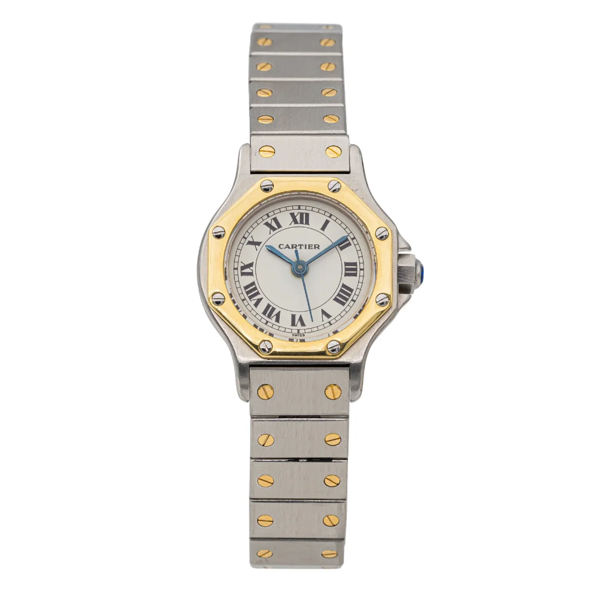 Montre Cartier Santos octogonale or et acier, n°série 090701689, cadran clair à chiffre romain, mouvement mécanique à remontage automatique, boitier 25mm, verre saphir, bracelet acier à boucle déployante ( Longueur 12,5cm Largeur 1,17cm ), taille poignet: 16 cm, poids total 53,74g, montre révisé, Excellent état