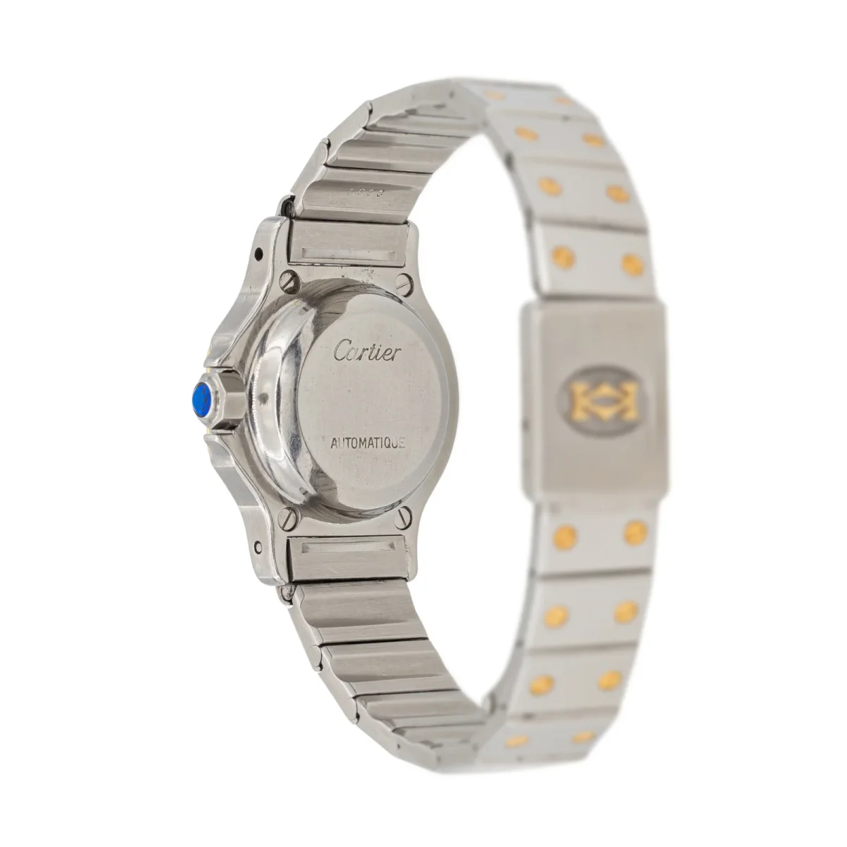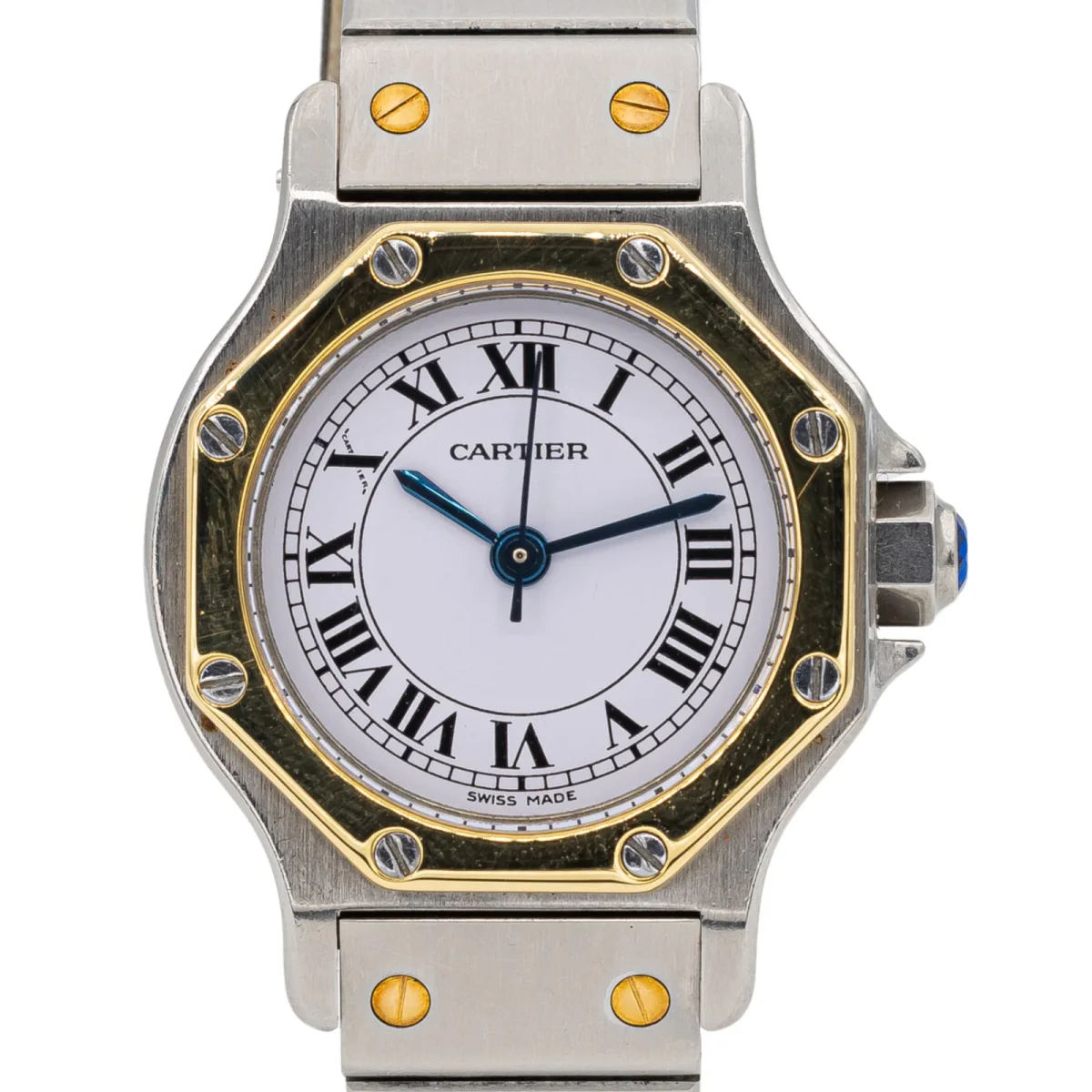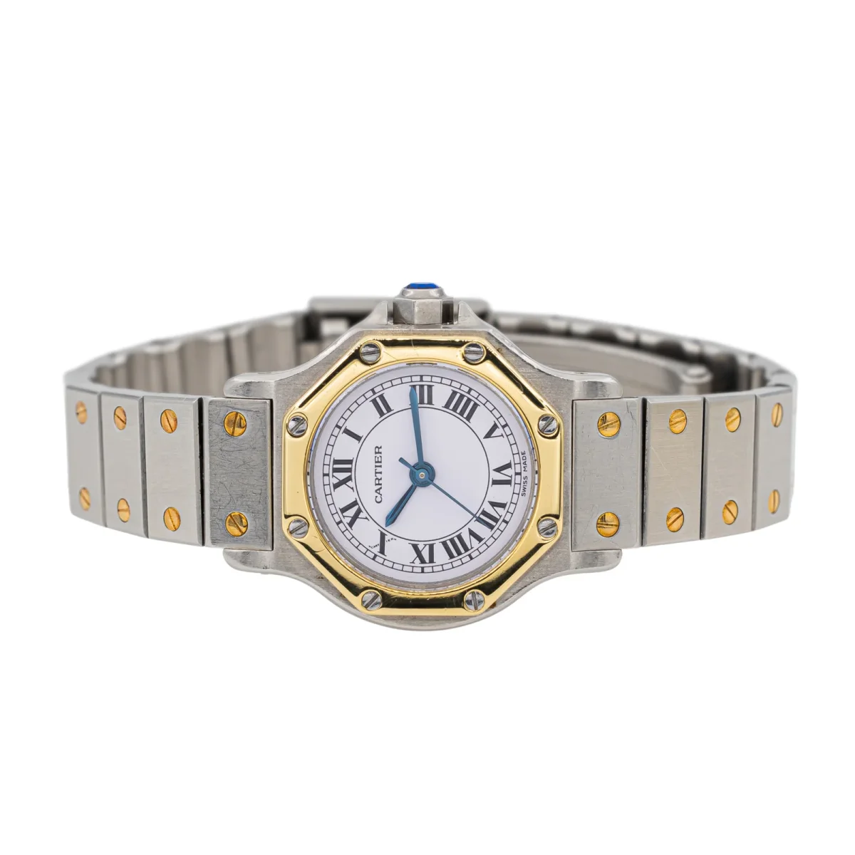 Montre Cartier modèle Santos octogonale or jaune et acier, n°série 090706592, cadran blanc à chiffre romain, mouvement mécanique à remontage automatique, boitier 25mm, verre saphir, bracelet acier boucle déployante (Taille poignet 17cm Largeur bracelet 1cm) poids total 48,08 g, poche et certificat d’origine, année 1979, Excellent état