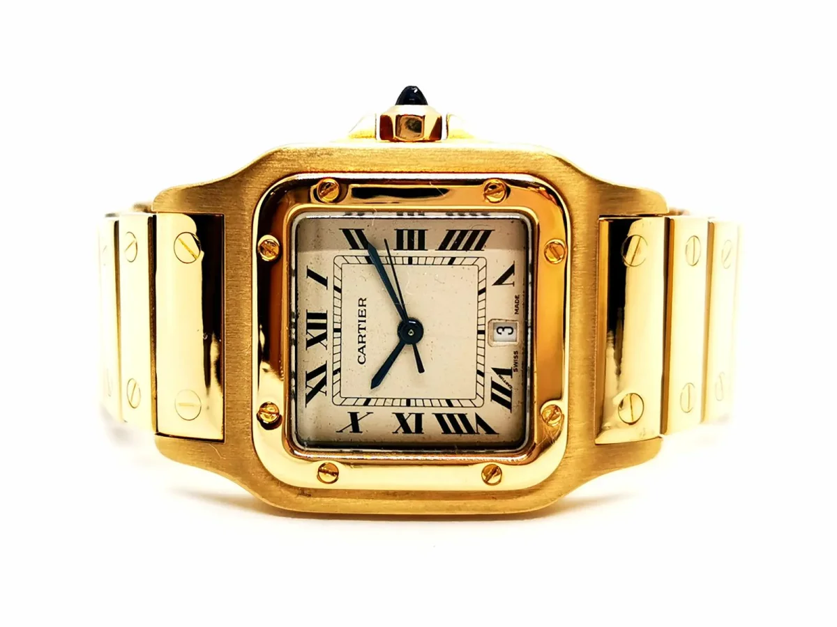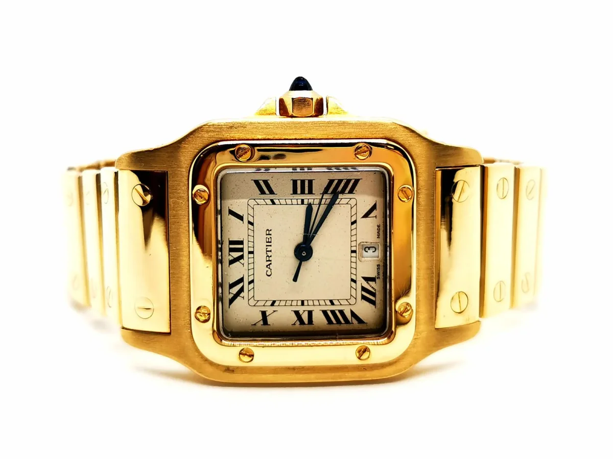 Montre mixte, signée de la maison Cartier, Collection Santos, en or jaune 750 millièmes (18 carats), taille boîtier 29 mm, index chiffres romain, date à 6h, remontoir cabochon facetté saphir bleu environ 0,05 ct légèrement égrisé, mouvement quartz, boucles déployante, verre saphir, taille poignet: 19 cm, largeur bracelet: entre 1,76 cm et 1,34 cm, poids total: 110,41 g, signée et numérotée: 887901 1375, poinçon Hibou, bon état (une rayure sur le verre)