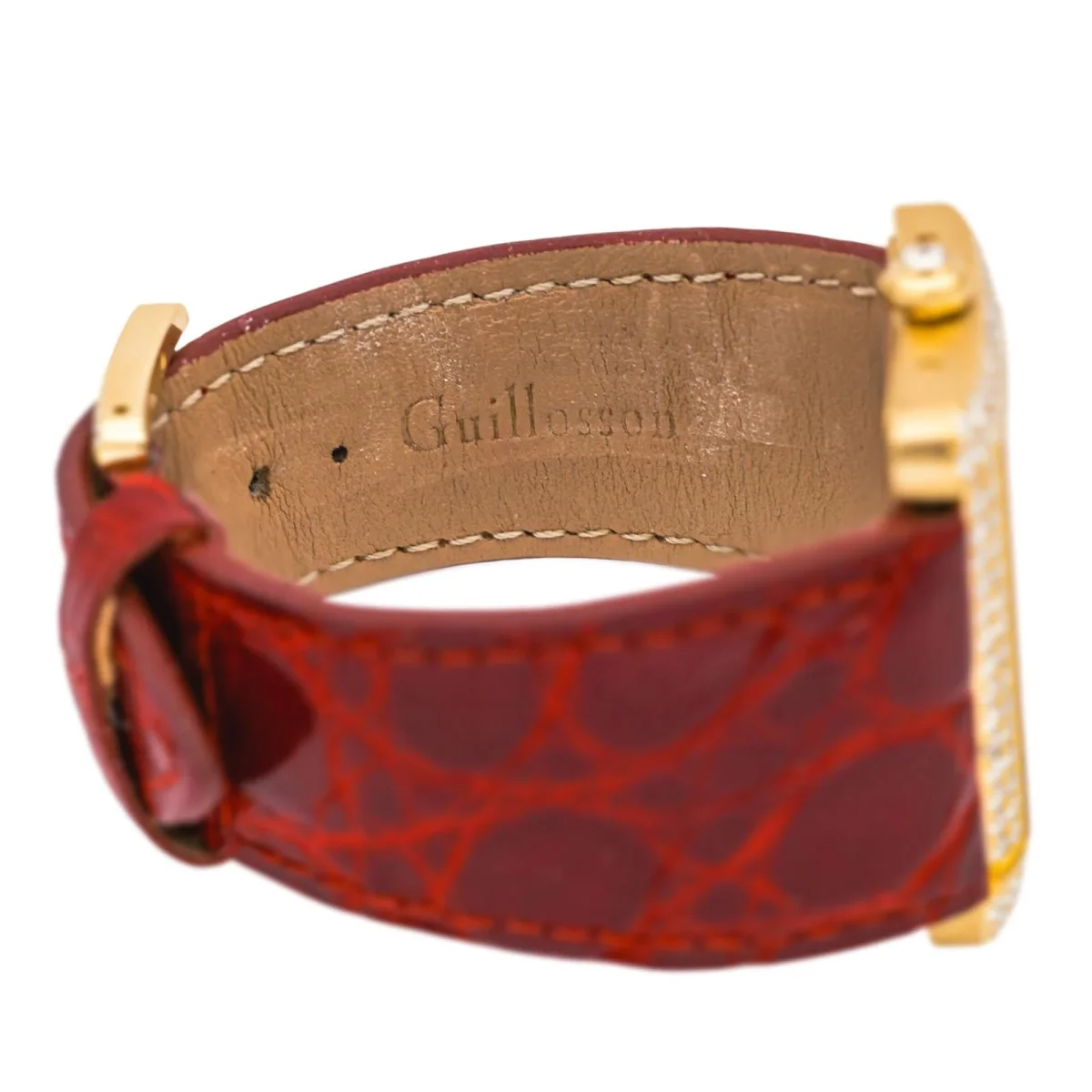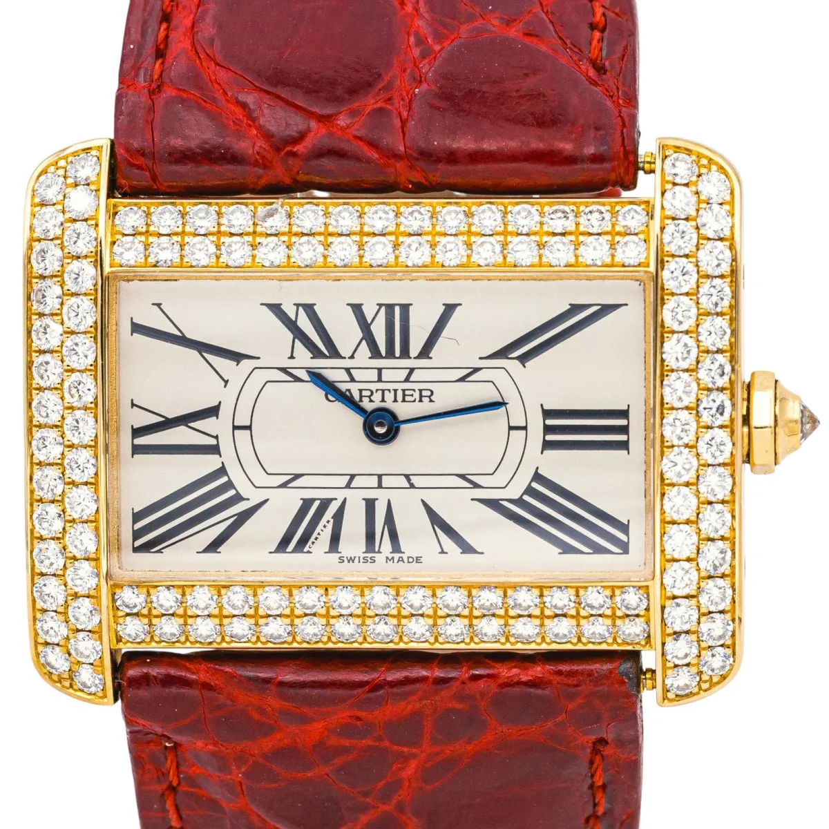 Montre Cartier modèle Tank Divan en or jaune 750 millièmes (18 carats), sertie de 118 diamants taille brillant H/VS, Poids total estimé des diamants : 2,88 cts, n°série 2602284620CE, cadran blanc à chiffres romains, mouvement quartz, boîtier 38 mm, verre saphir, bracelet cuir, boucle ardillon, taille poignet 18,5 cm, poids total : 70,01 g, full set (boite et papier d’origine), année 2004, poinçon Saint Bernard, révision complète et garantie 1 an, excellent état