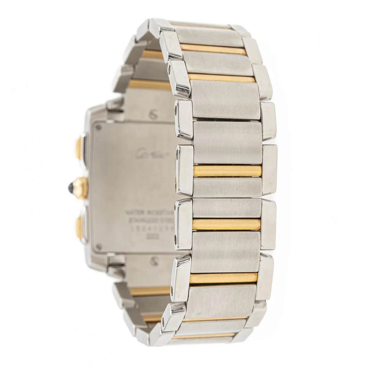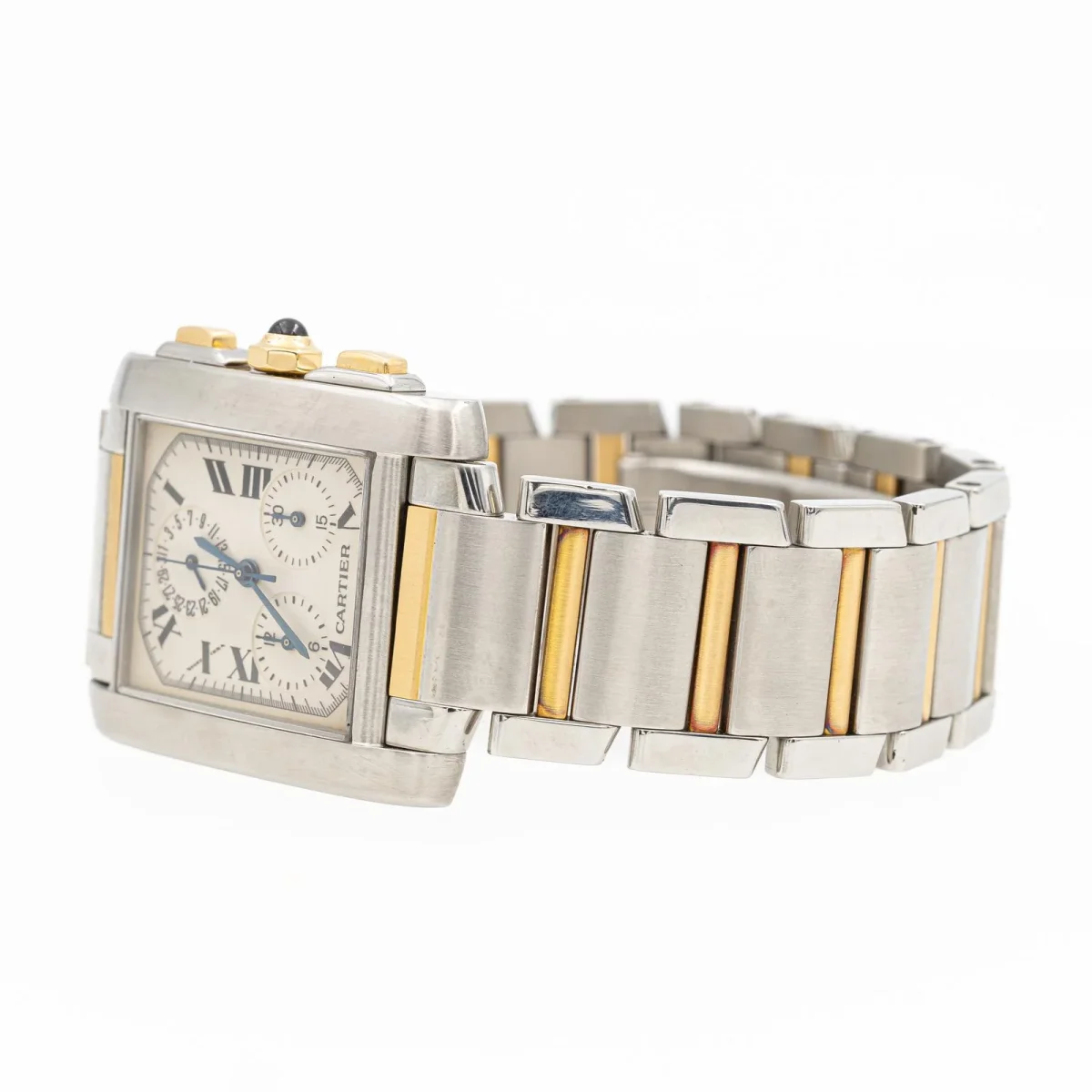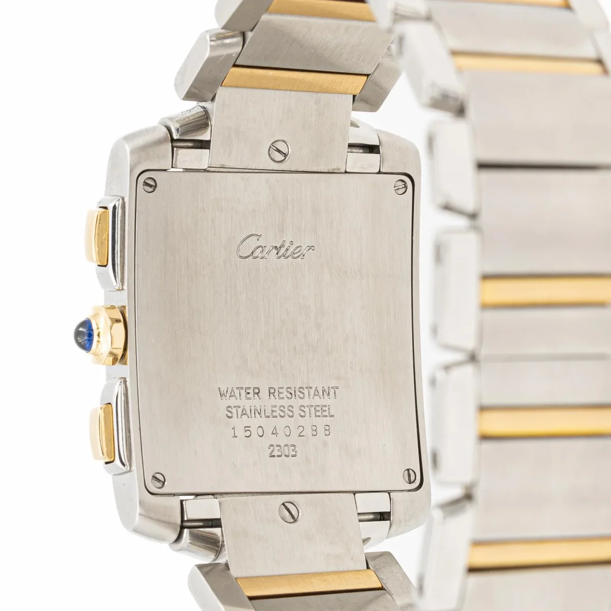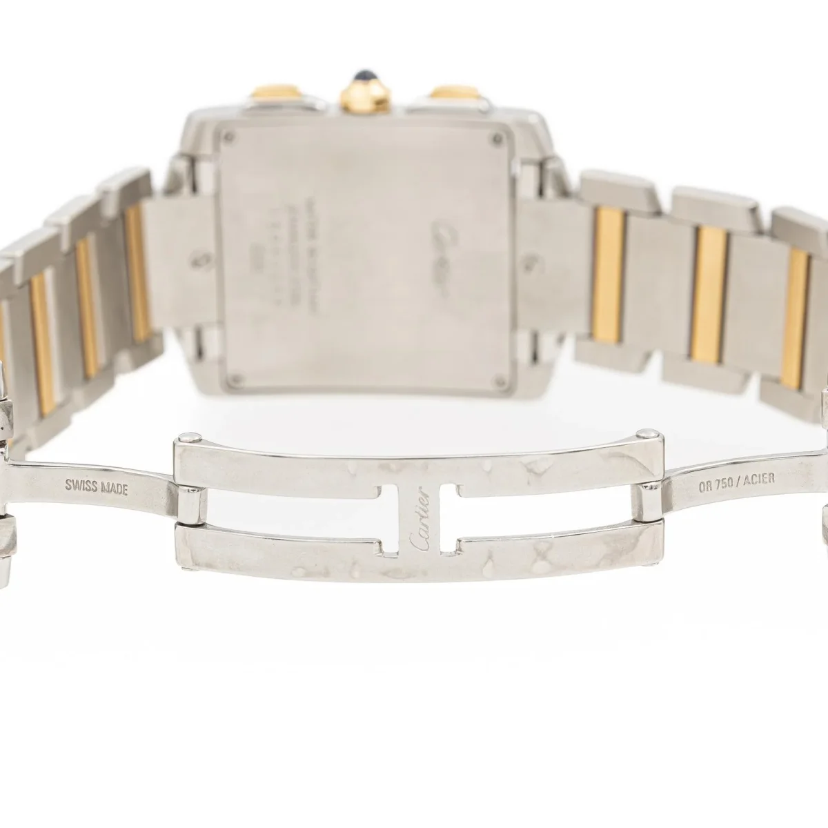 Montre homme, signée de la maison Cartier, modèle Tank Française 2303, chronoflex, en acier inoxydable et or jaune 750 millièmes (18 carats), boîtier 28 mm x 36 mm, mouvement quartz, boucle déployante, longueur bracelet: 20,5 cm, largeur bracelet: 1,9 cm, révisée, poids total: 101,29 g, numérotée n° 150402BB, pochette Cartier en velour, excellent état