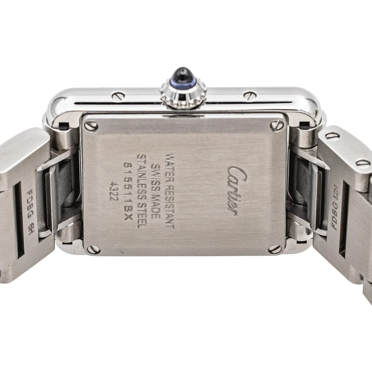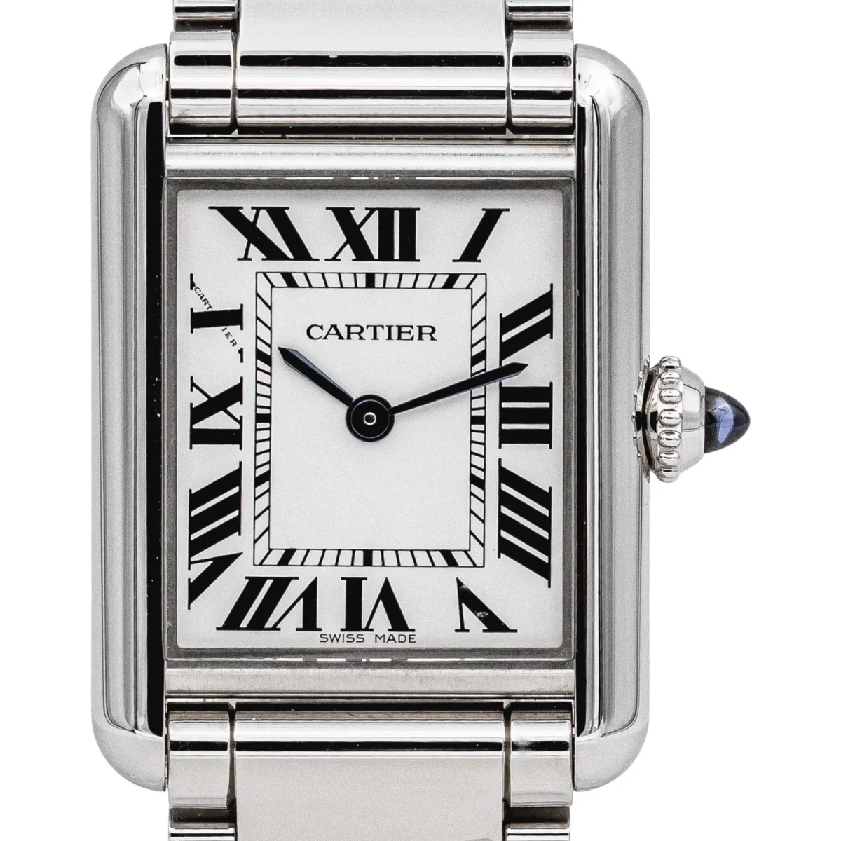 Montre Cartier modèle Tank Must WSTA0051 en acier, n°série 4322815511BX , cadran argenté à chiffres romains, mouvement quartz, boîtier 22 mm, verre saphir, bracelet en acier boucle papillon (taille poignet 14,00 cm, largeur bracelet 2,58 cm), poids total : 72,47 g, full set (écrin et certificat d’origine), année 2021, révision complète et garantie 1 an, excellent état, vendue avec maillons supplémentaires