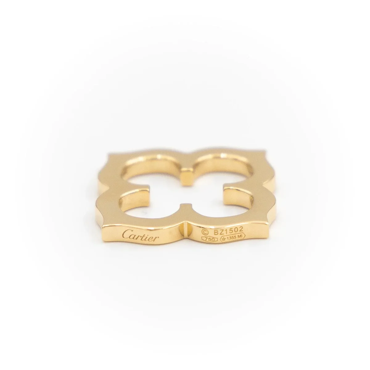 Pendentif signé de la maison Cartier, or jaune 750 millièmes (18 carats), morif floral, dimensions extérieur : 2,90 cm x 2,90 cm, épaisseur : 0,25 cm, numéroté : BZ1502, poids total : 8,92 g, poinçon tête d’aigle, excellent état