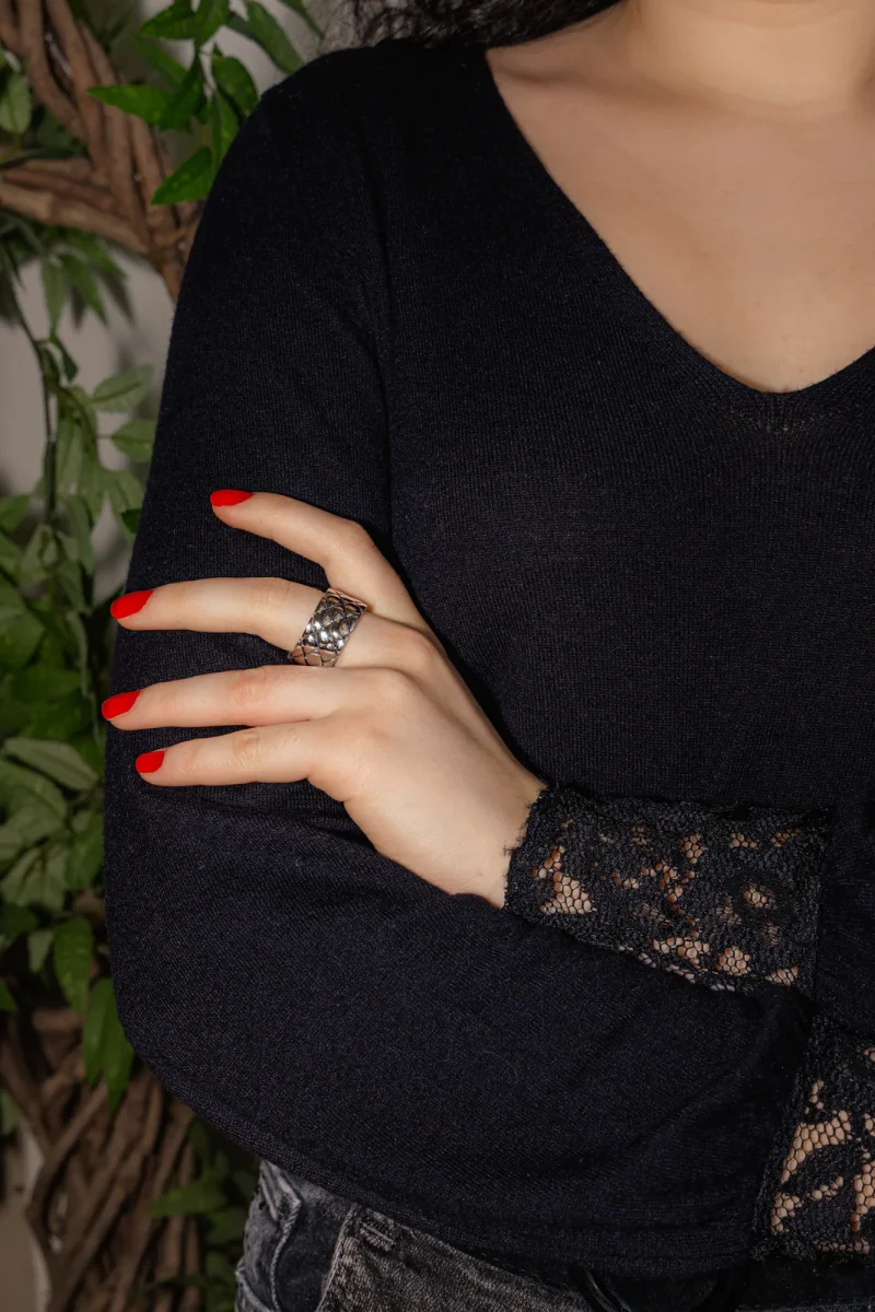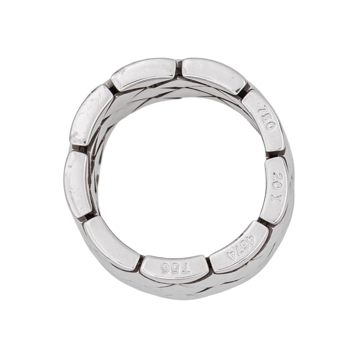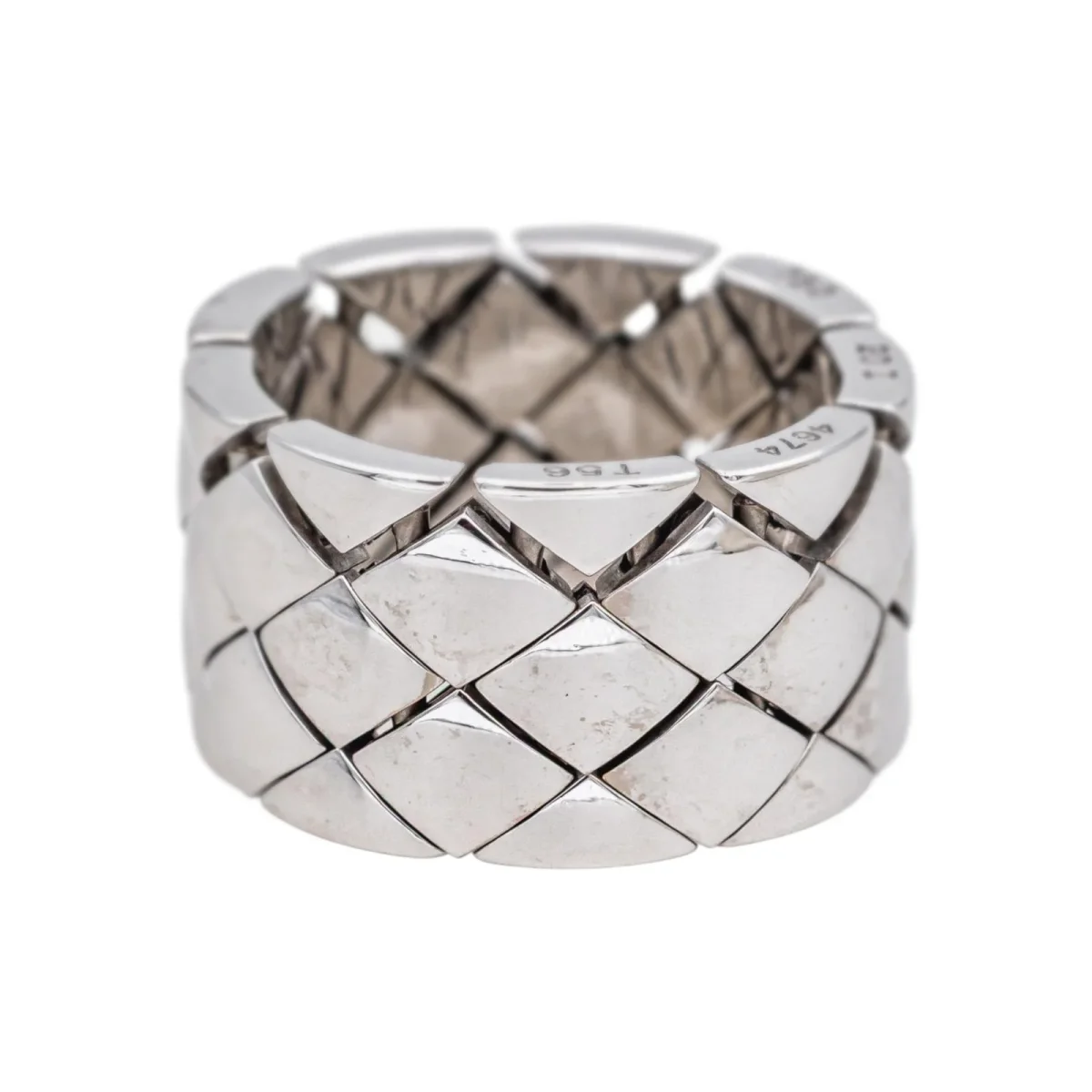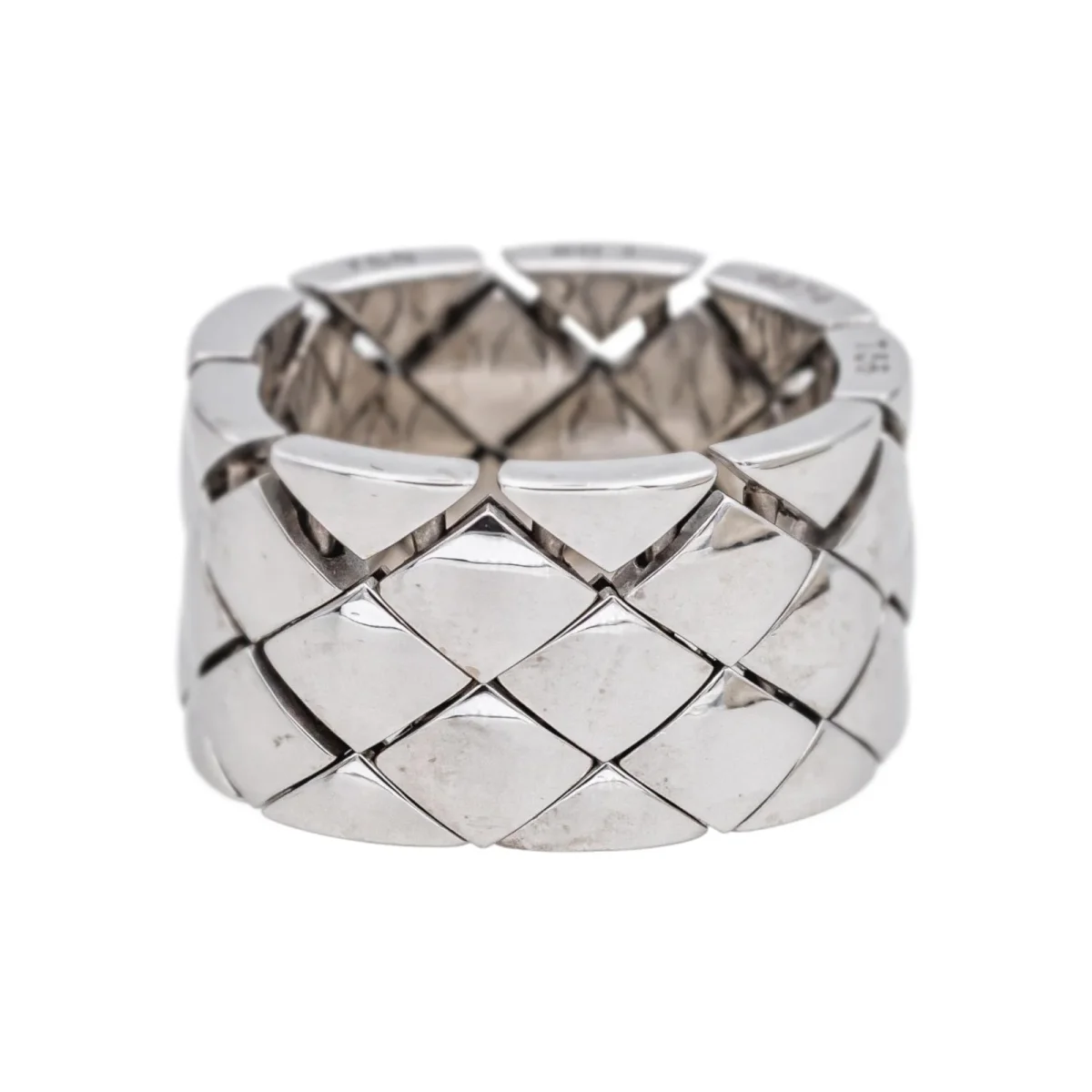 Bague signée de la Maison Chanel en or blanc 750 millièmes (18 carats), modèle Matelassé, largeur sur le dessus : 1,32 cm, tour de doigt : 64, poids total : 24,34 g, poinçon tête d’aigle, vendue avec pochon d’origine et d’époque, numérotée : 20I4674, très bon état