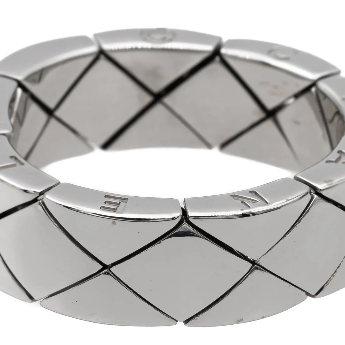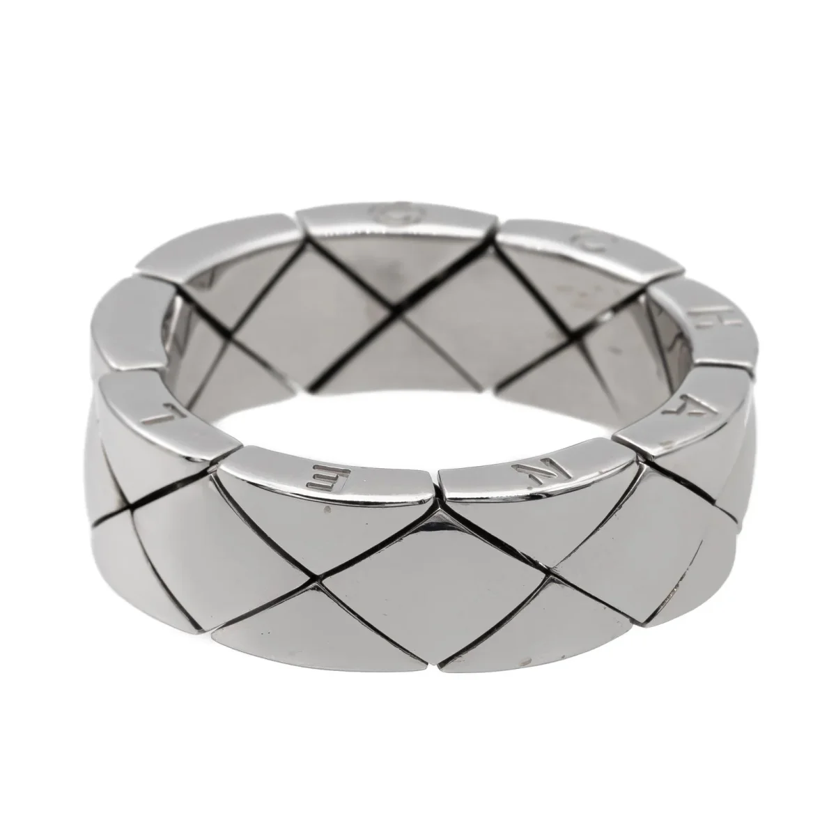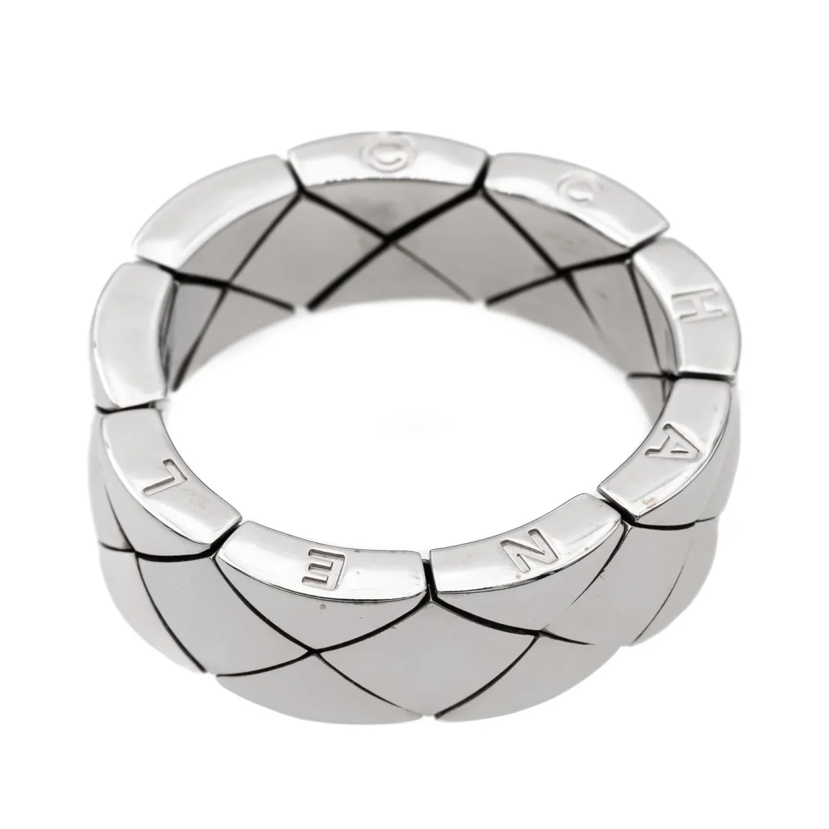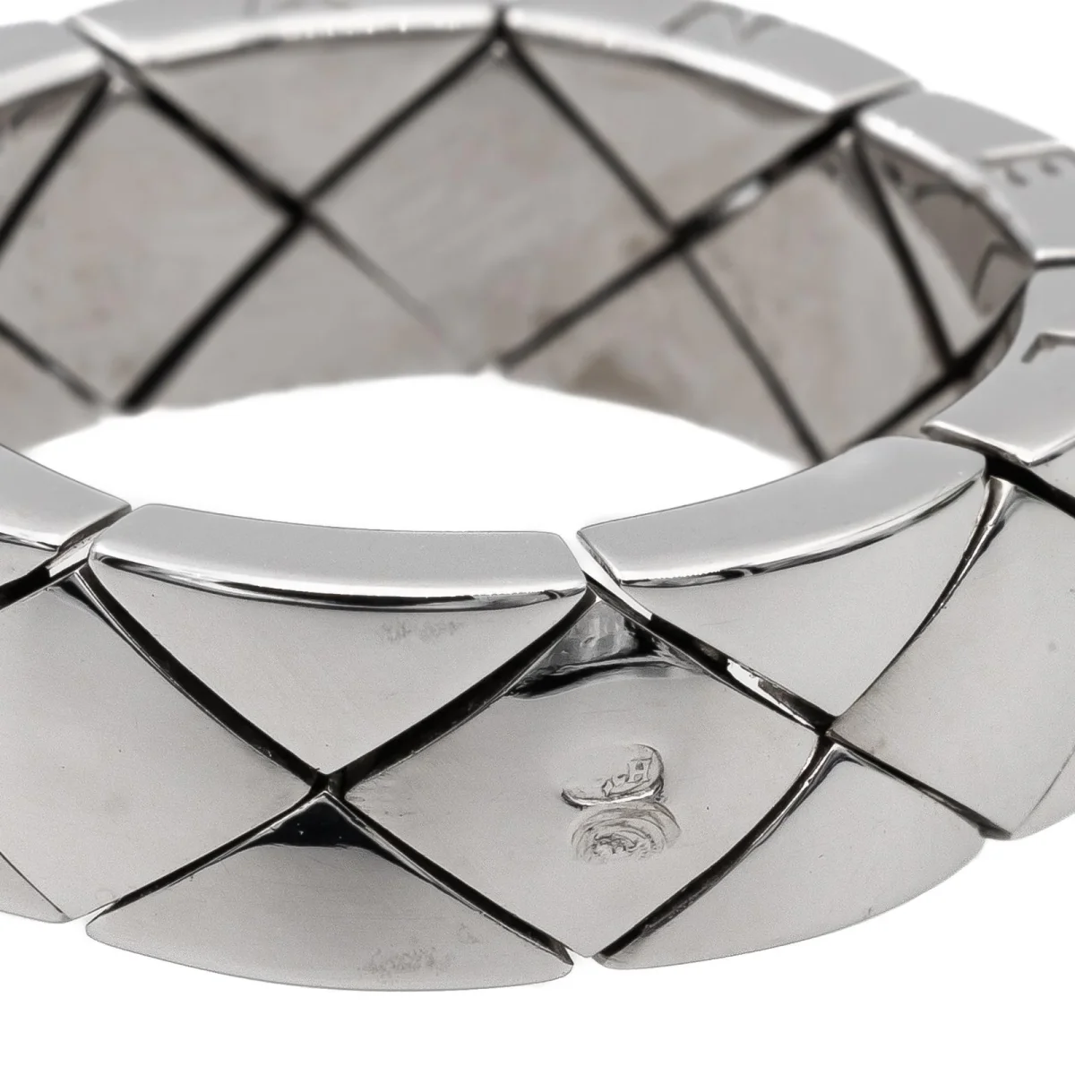 Bague signée de la maison Chanel, modèle Coco Crush, en or blanc 750 millièmes (18 carats), motif matelassé, largeur: 0,69 cm, poids total: 14,36 g, tour de doigt: 57, poinçon hibou, numérotée: 20I 1038, excellent état
