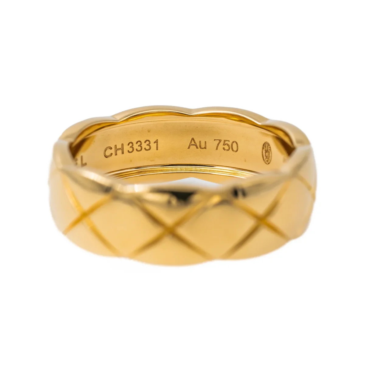 Bague signée de la Maison Chanel en or jaune 750 milièmes (18 carats), modèle Coco Crush, largeur sur le dessus : 0,67 cm, tour de doigt : 56, poids total : 6,40 g, poiçon tête d’aigle, numérotée : CH331, poinçon Saint Bernard, excellent état