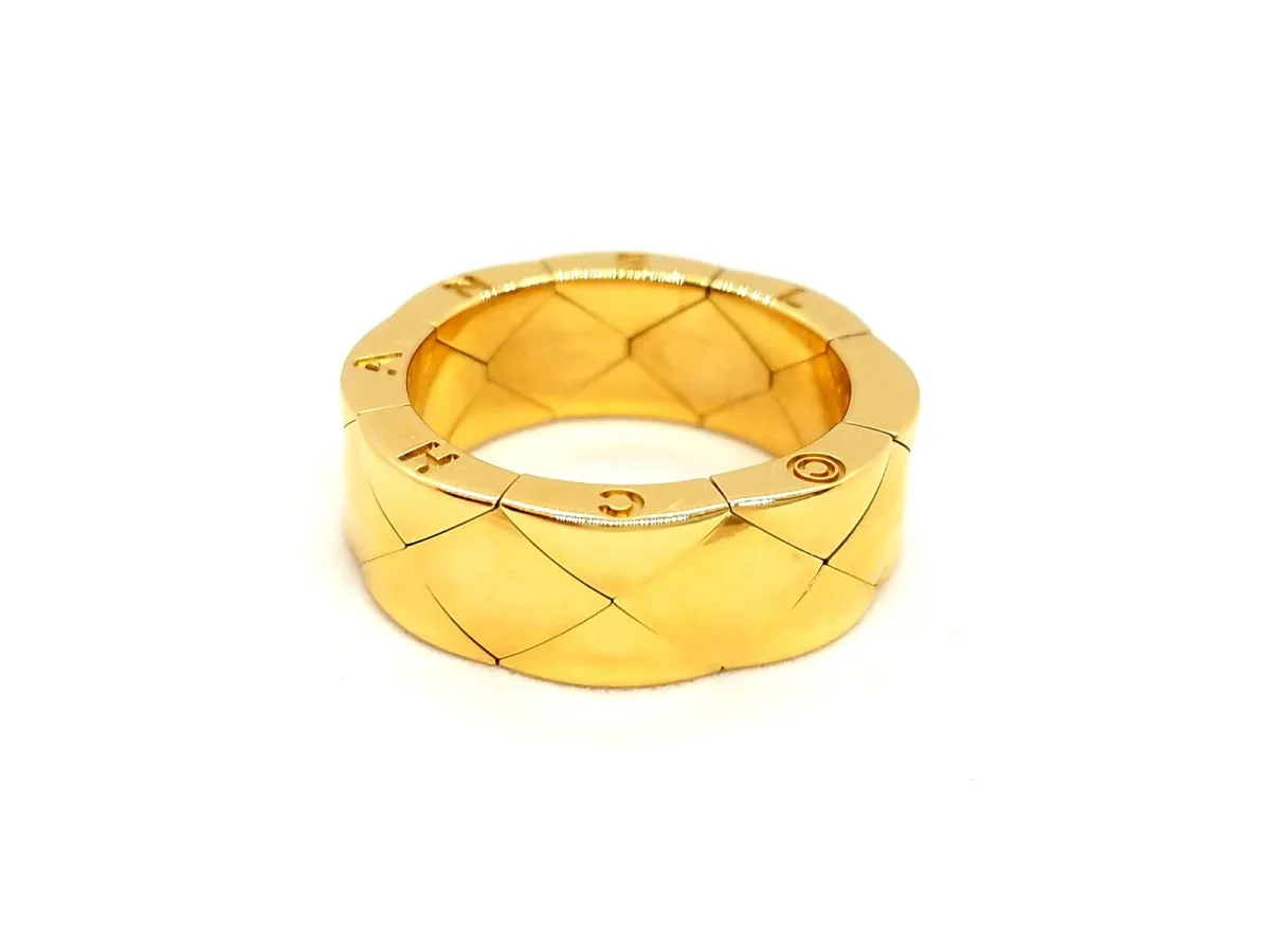 Bague signée de la maison Chanel, collection matelassée, en or jaune 750 millièmes (18 carats), petit modèle, maille semie articulée, Taille: 51, largeur: 0,7 cm, épaisseur: 0,28 cm, poids total: 12,90 g, signée et numérotée: 01189, excellent état, prix neuf: 2500€