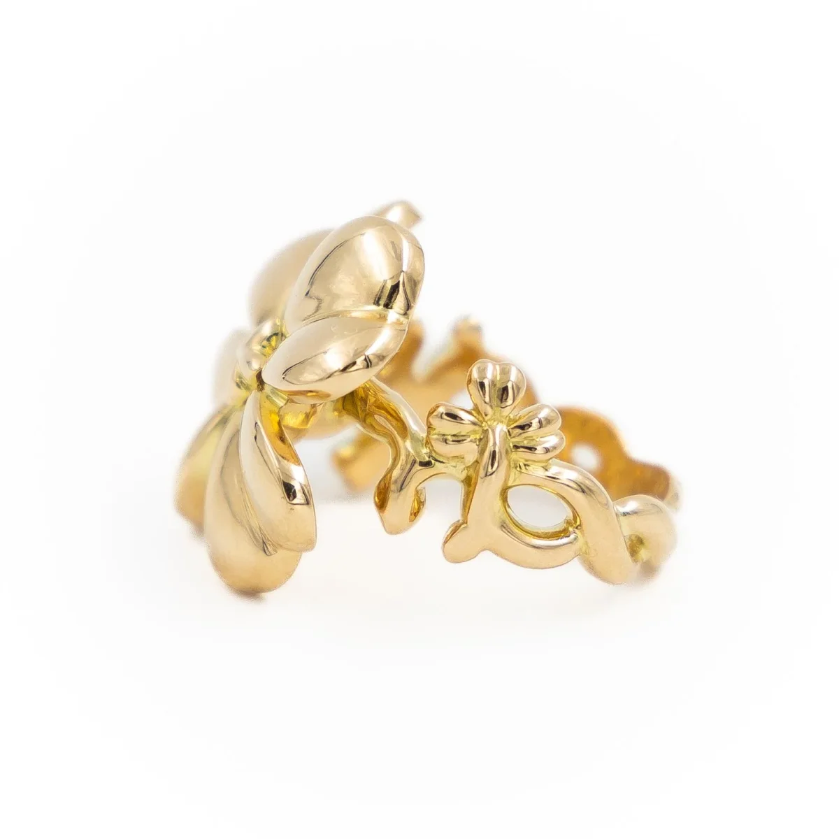 Bague signée de la maison Chanel en or jaune en or jaune 750 millièmes (18 carats), modèle Trèfle, trèfle tournant, largueur sur le dessus : 1,97 cm, largeur de l’anneau : 0,45 cm, taille de doigt : 52, poids total : 13,64 g, poinçon tête d’aigle, excellent état