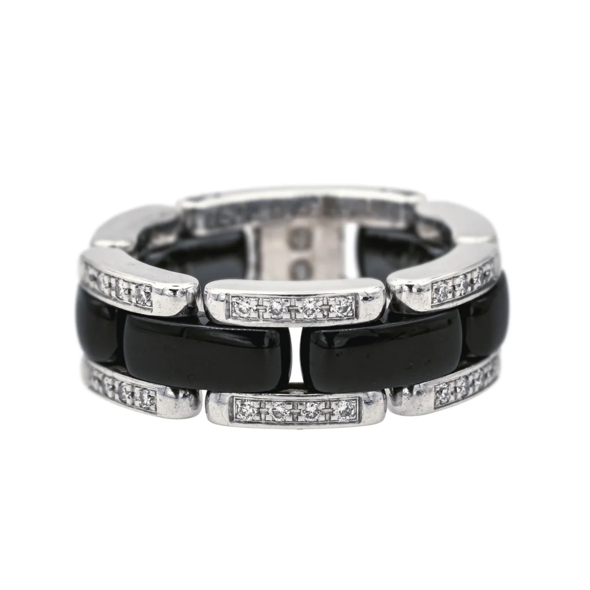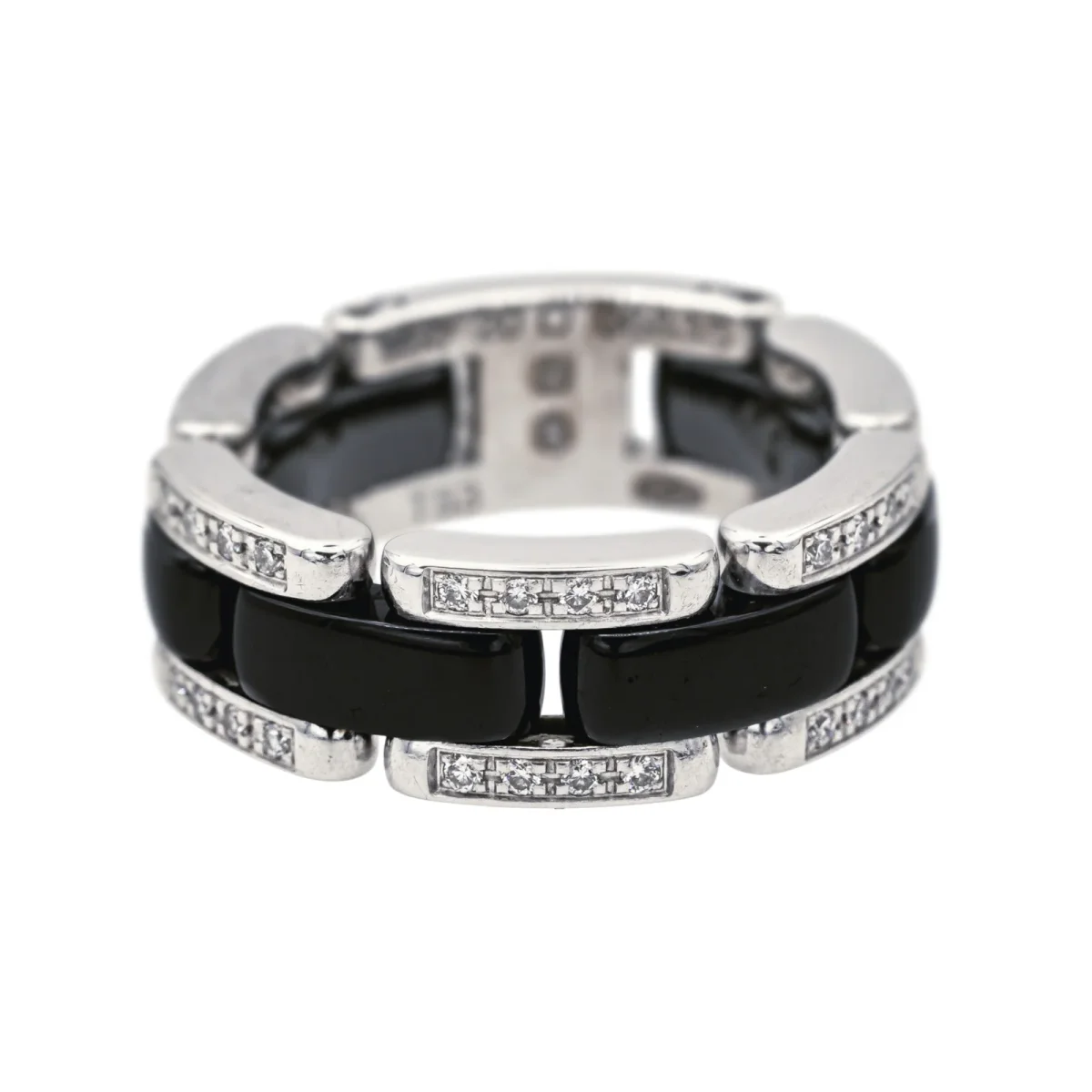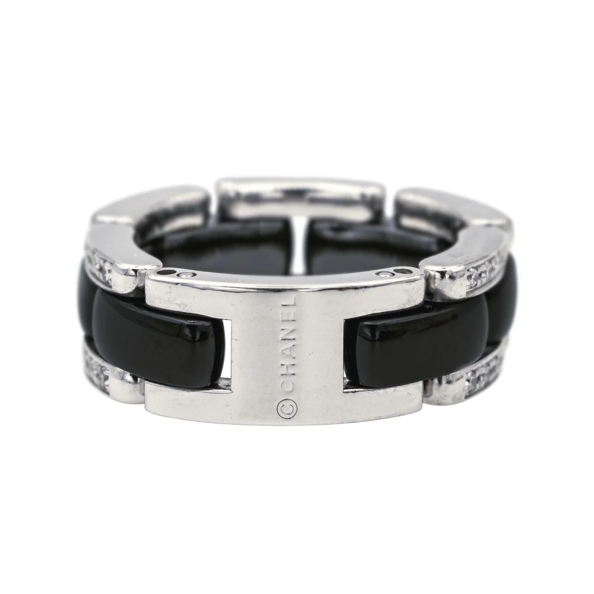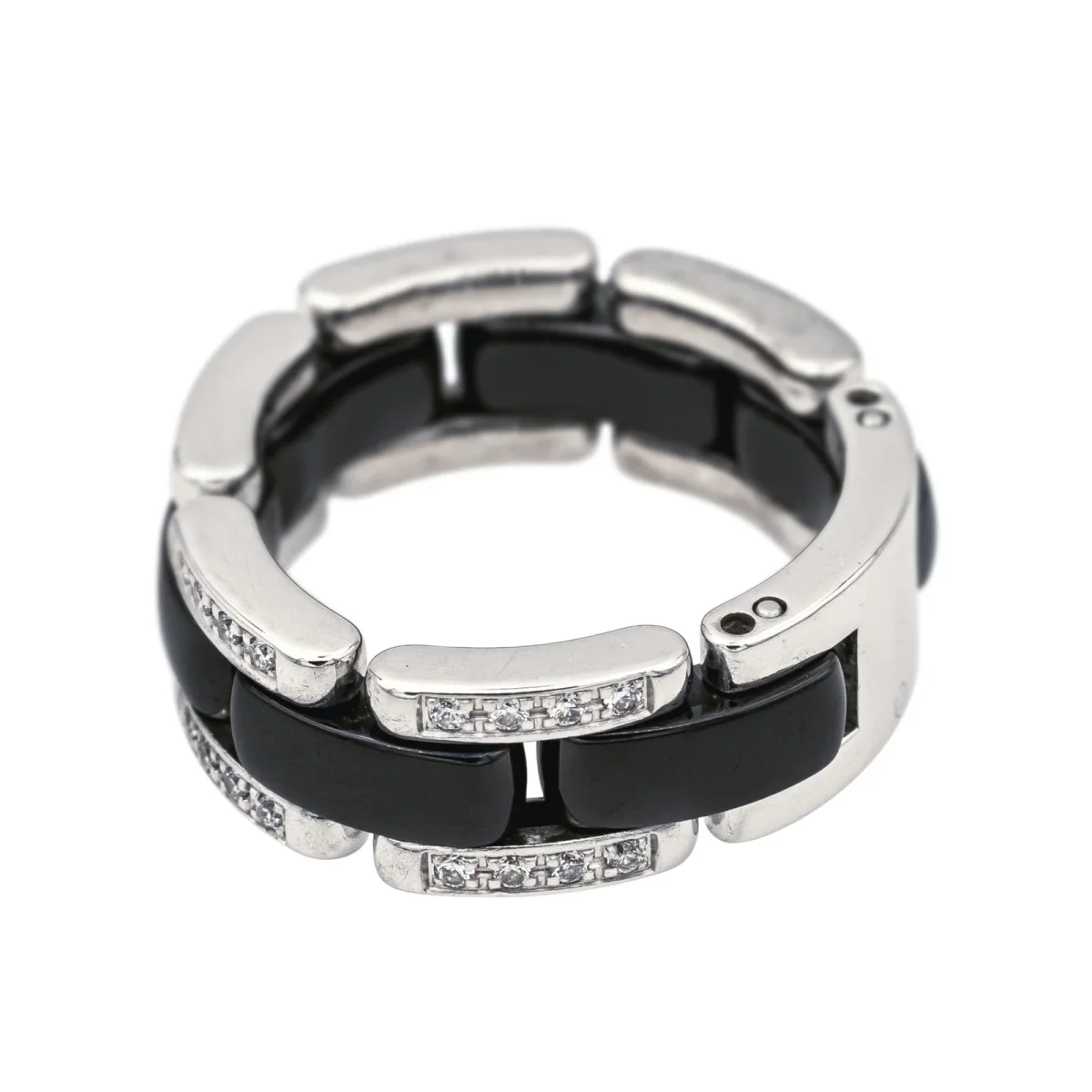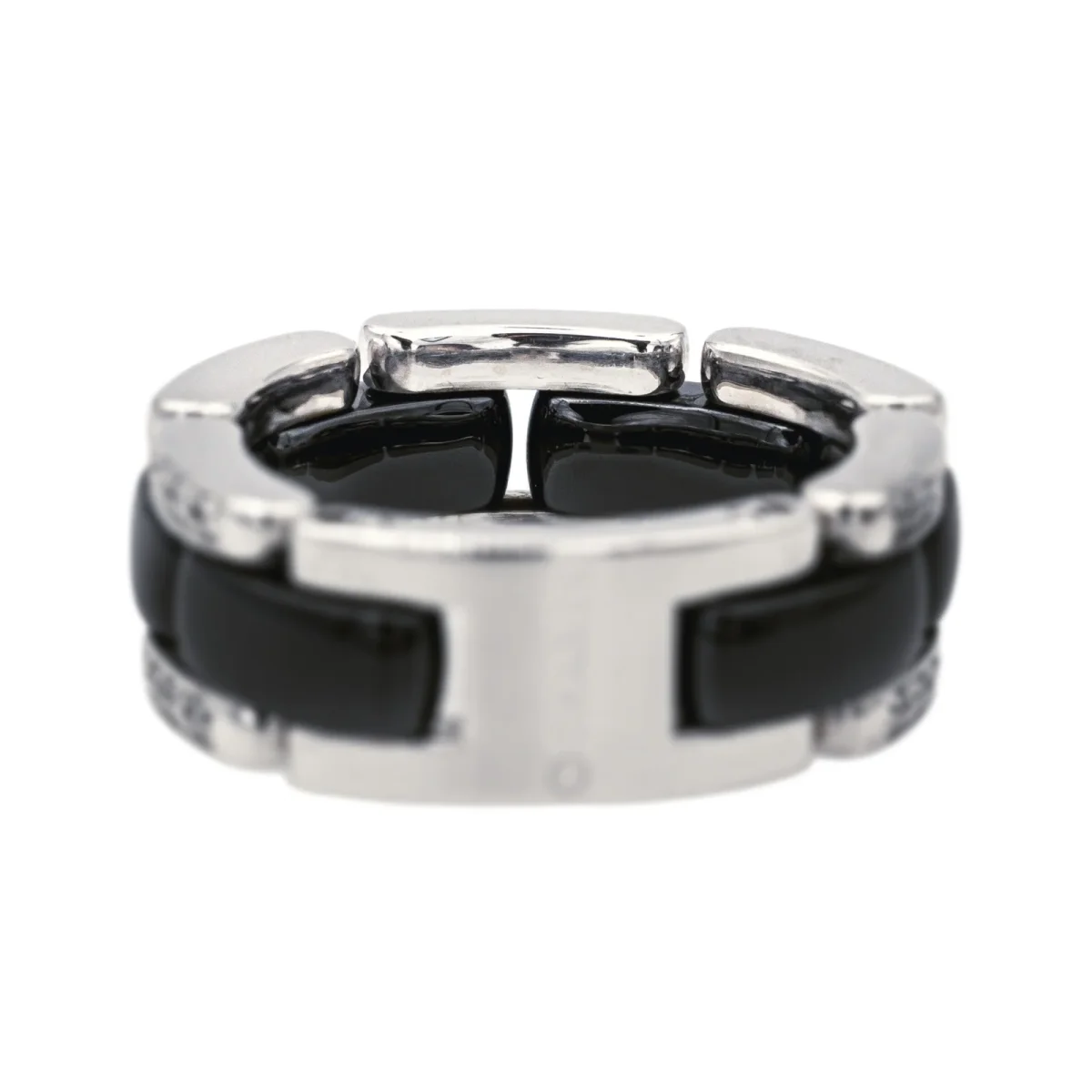 Bague signée de la Maison Chanel, collection Ultra, petit modèle, en or blanc 750 millièmes (18 carats), et céramique noire, sertie de 40 diamants, taille brillant, environ G/VS, poids total diamants environ 0,22 ct, (chaque diamant d’un poids d’environ 0,005 ct), tour de doigt : T53, numérotée 20O06835, poinçon saint Bernard, poids total : 9,76 g, excellent état