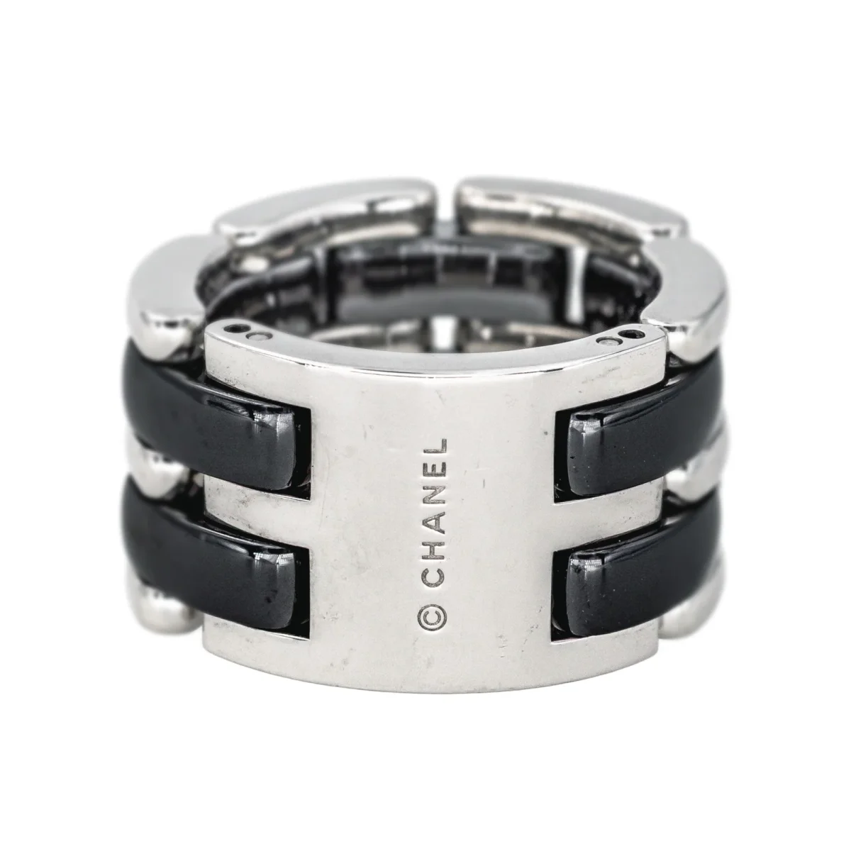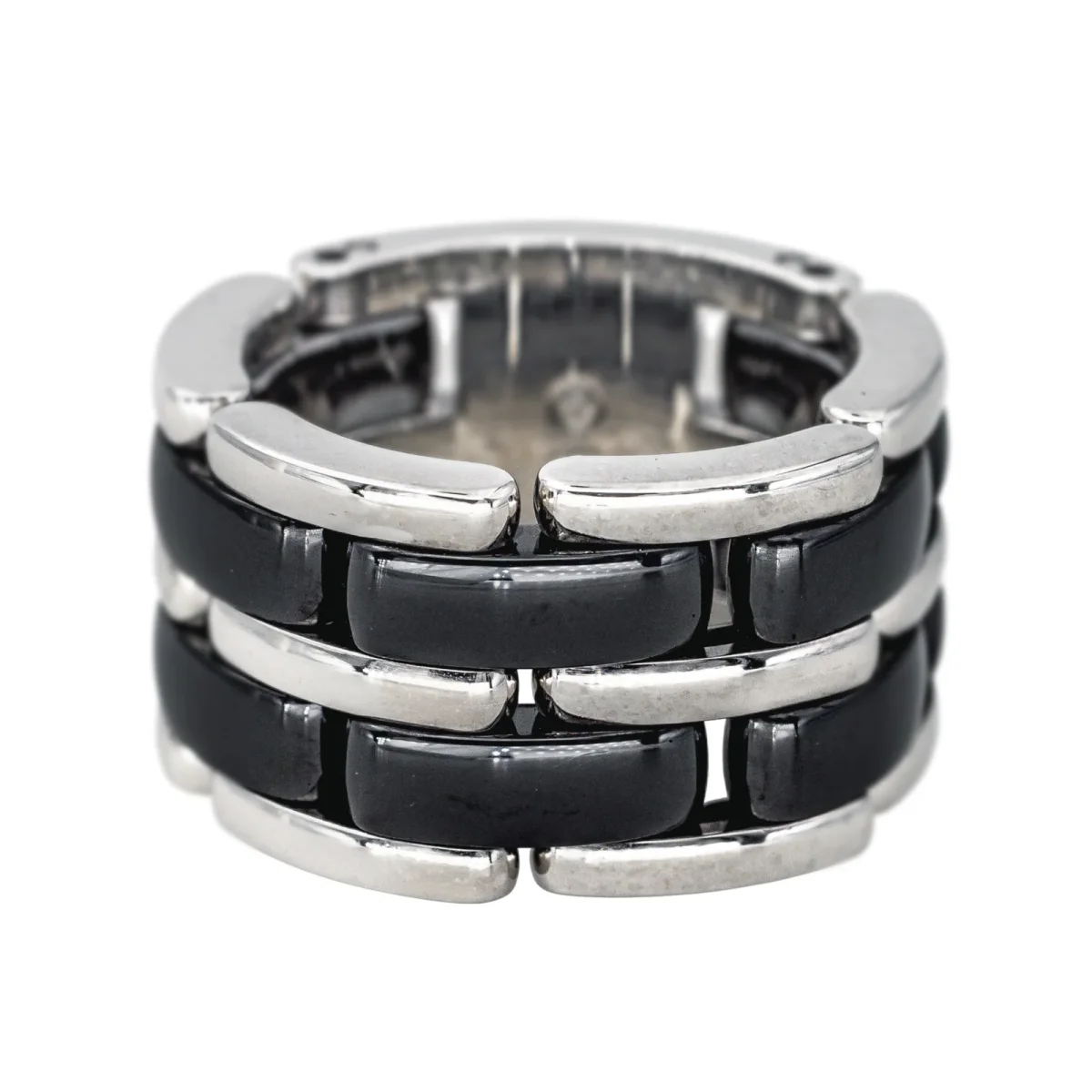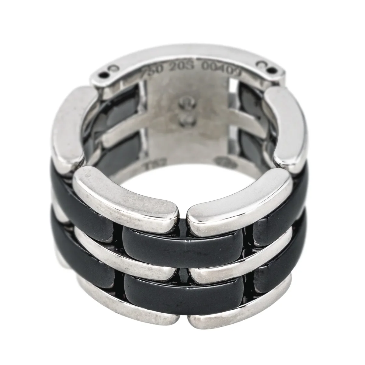 Bague signée de la Maison Chanel, collection Ultra, grand modèle, en or blanc 750 millièmes (18 carats), et céramique noire, largeur sur le dessus : 1,22 cm, tour de doigt : T52, numérotée 20S00409, poids total : 17,03 g, poinçon saint Bernard, vendue avec écrin d’origine, excellent état