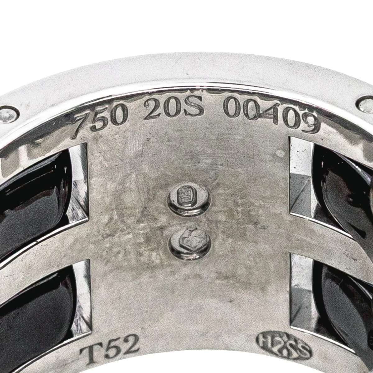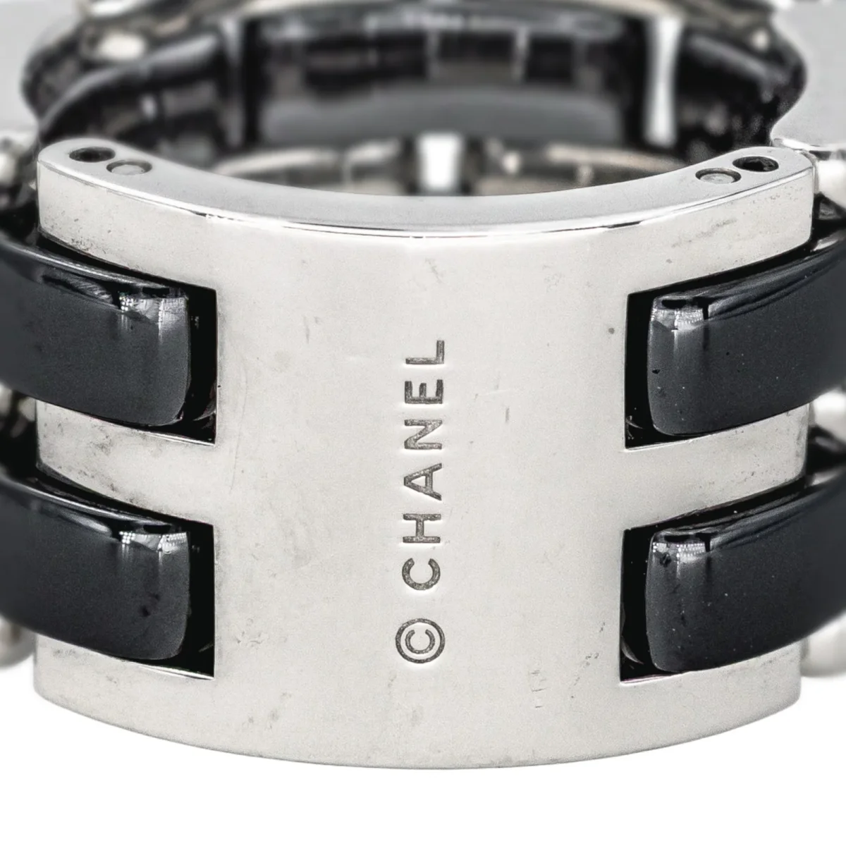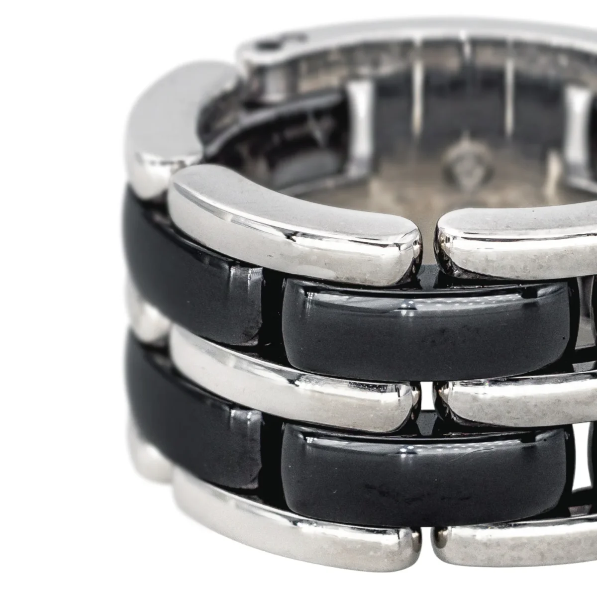 Bague signée de la Maison Chanel, collection Ultra, grand modèle, en or blanc 750 millièmes (18 carats), et céramique noire, largeur sur le dessus : 1,22 cm, tour de doigt : T52, numérotée 20S00409, poids total : 17,03 g, poinçon saint Bernard, vendue avec écrin d’origine, excellent état