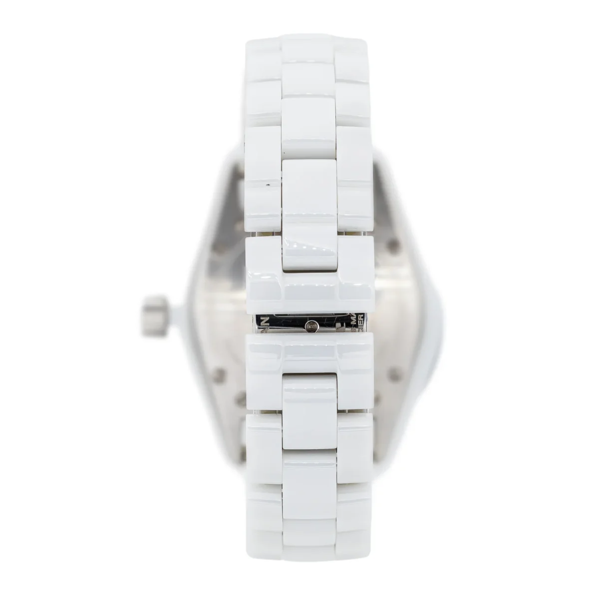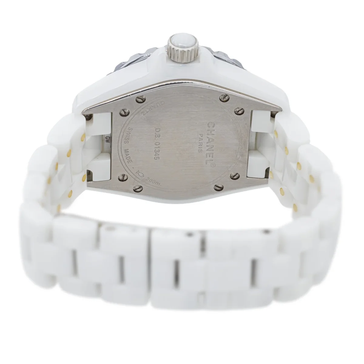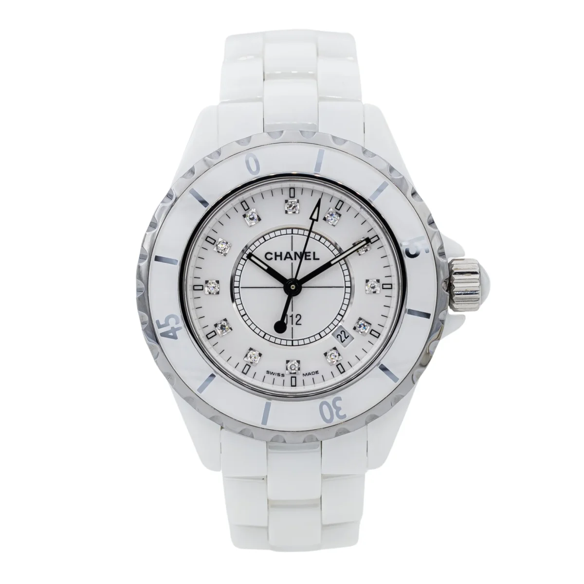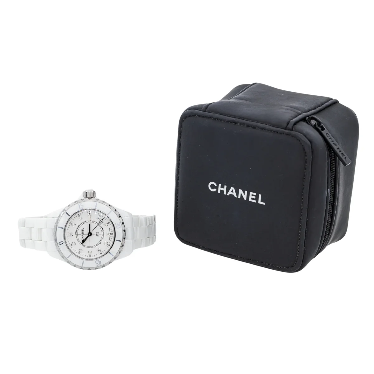 Montre Chanel modèle J12 céramique blanche, n°série D.B. 01345, cadran blanc sertie de 12 diamants brillant, environ G-VS, d’un poids total d’environ 0,06 ct (chaque diamant d’un poids total d’environ 0,005 ct), mouvement à quartz, boitier 33 mm, verre saphir, bracelet céramique à boucle papillon (taille poignet 18,50 cm, largeur bracelet 1,39 cm), poids total : 98,11 g, année 2010, écrin de service Chanel, Excellent état