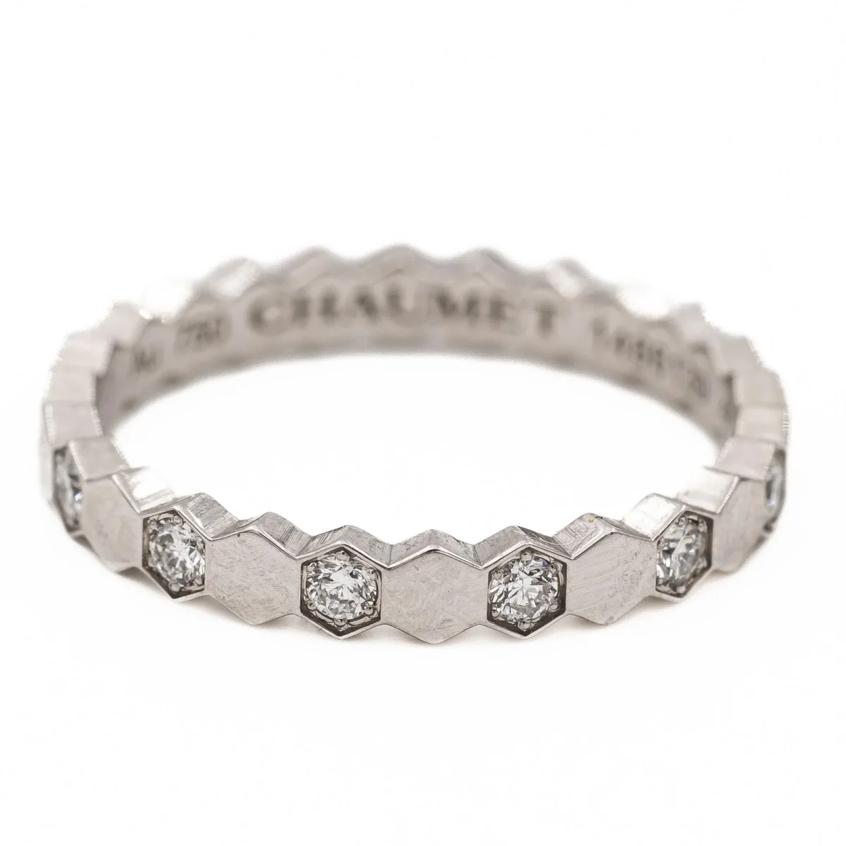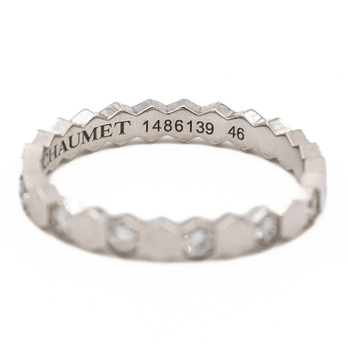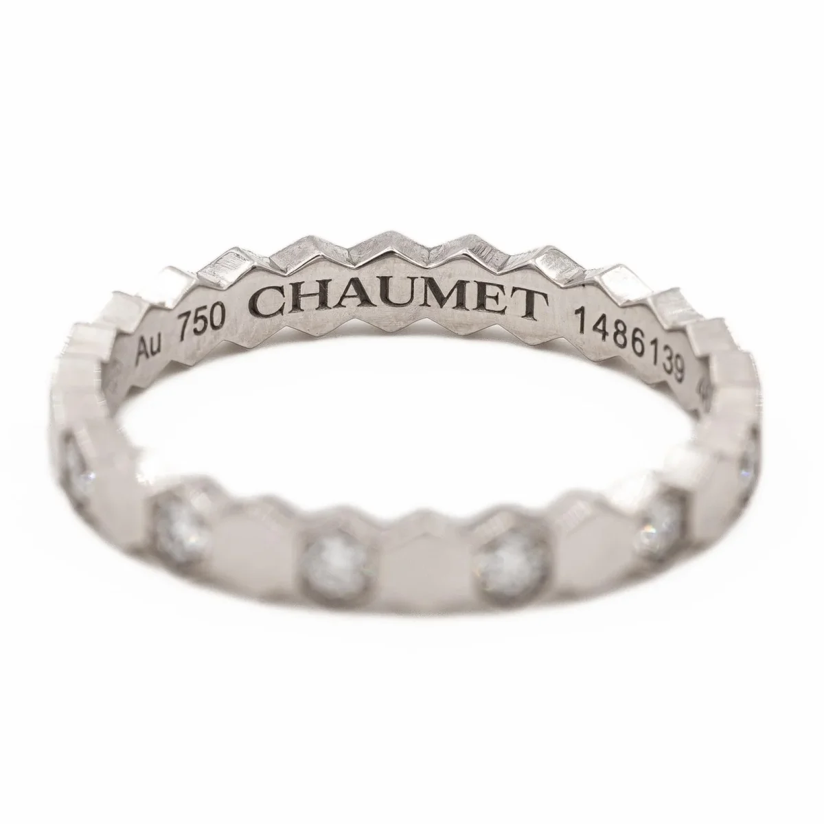 Alliance signée de la Maison Chaumet, modèle « Bee my love » en or blanc 750 millièmes (18 carats), sertie de 13 diamants taille brillant environ G/VS, poids total diamants: environ 0,21 ct, largeur sur le dessus: 0,24 cm, tour de doigt: 46, poids total: 1,67 g, poinçon tête d’aigle, numérotée: 1486139, vendue avec l’écrin et une pochette Chaumet, excellent état