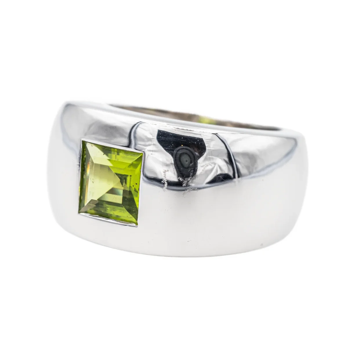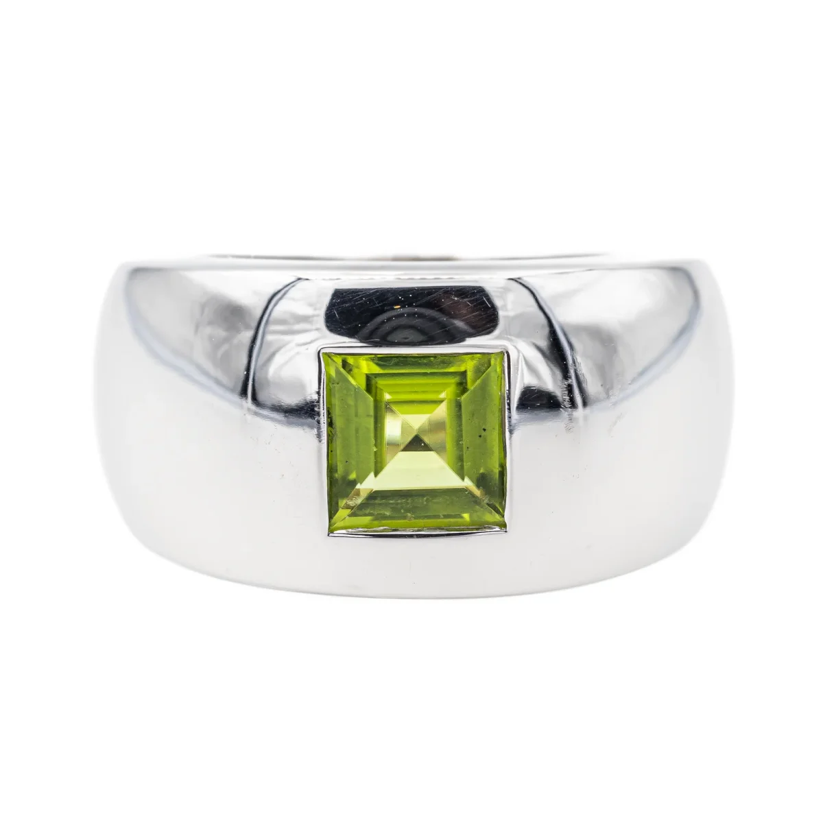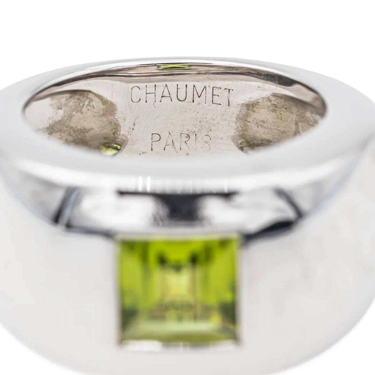 Bague signée de la maison Chaumet en or blanc 750 millièmes (18 carats), collection Bella, sertie d’un péridot carré d’environ 1,18 cts, largeur sur le dessus : 1,17 cm, épaisseur de l’anneau : 0,18 cm, numérotée : 363887, tour de doigt : 49, poids total : 11,82 g, poinçon tête d’aigle, excellent état